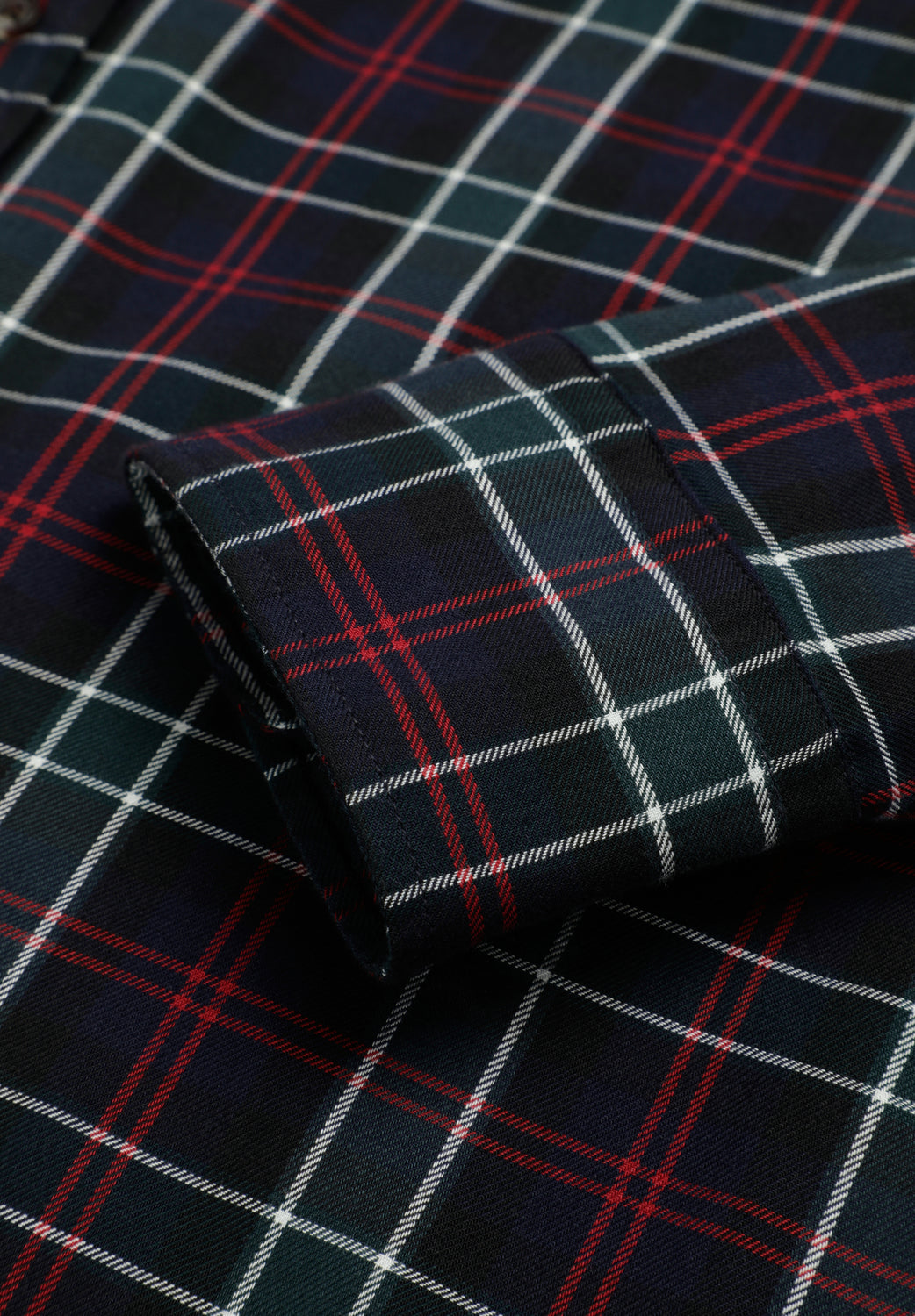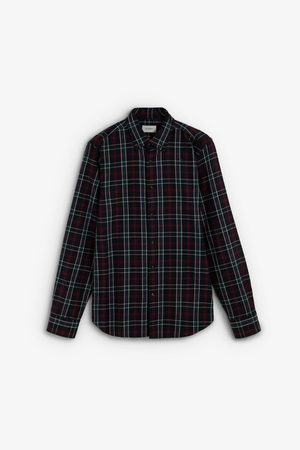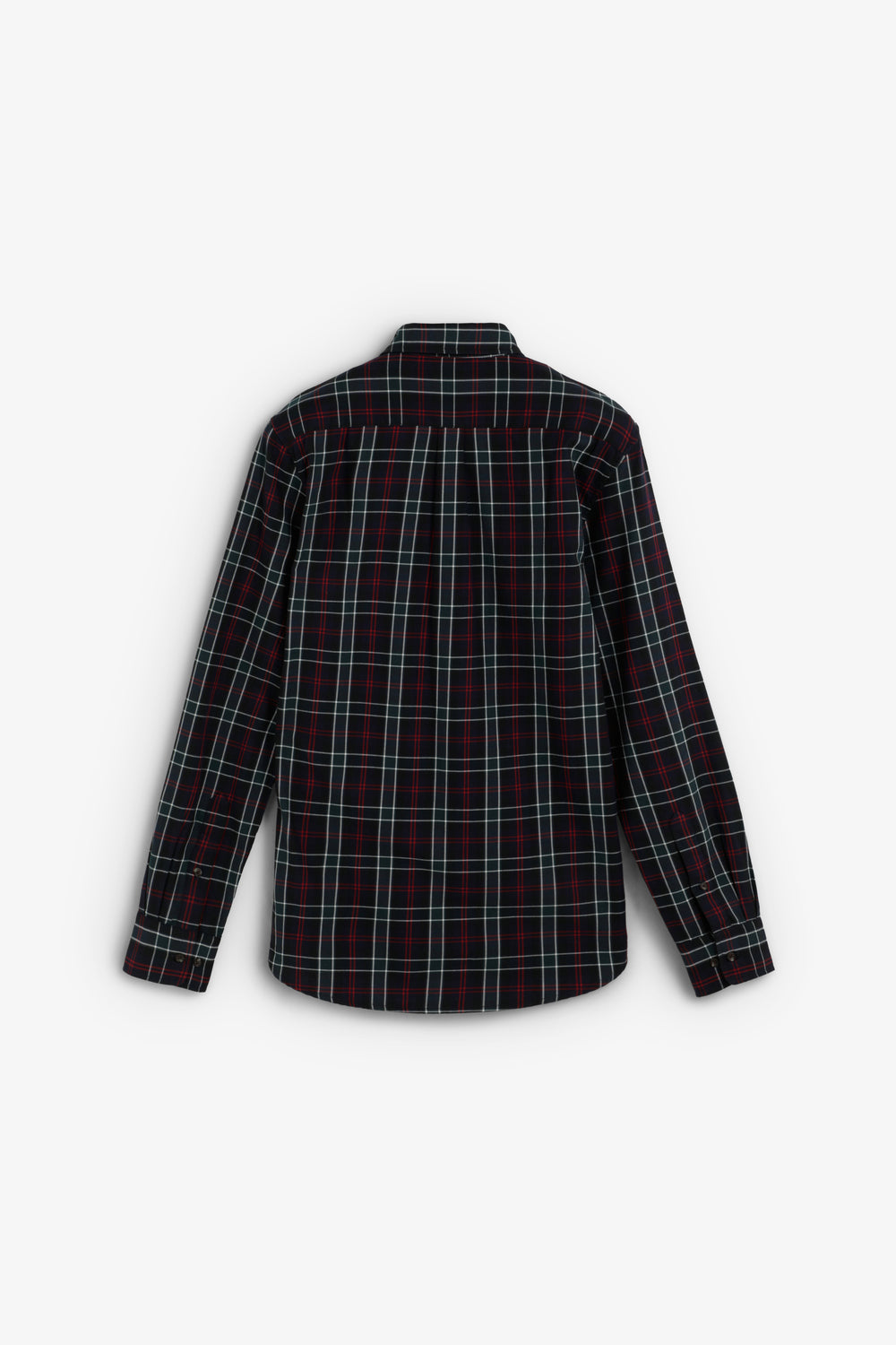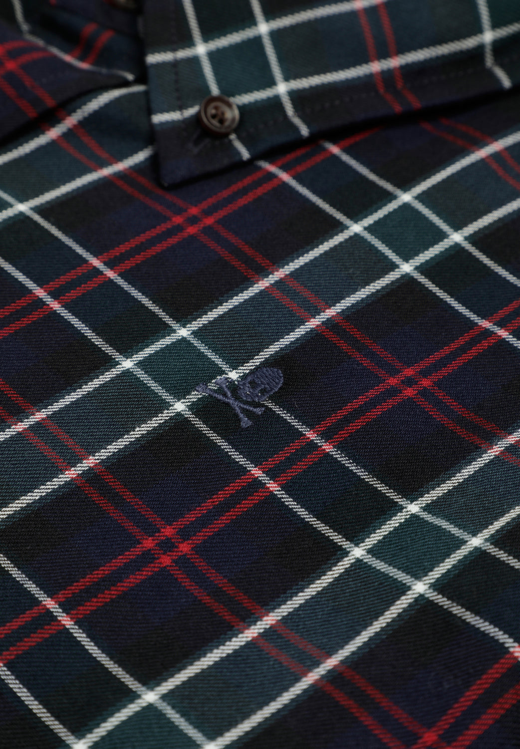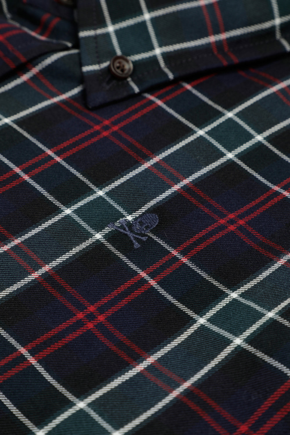 Camisa confeccionada en algodón BCI de cuadros tartán. Corte regular, cuello con botones y cierre de botones. Mangas largas con puños abotonados y calavera bordada en contraste en el pecho.