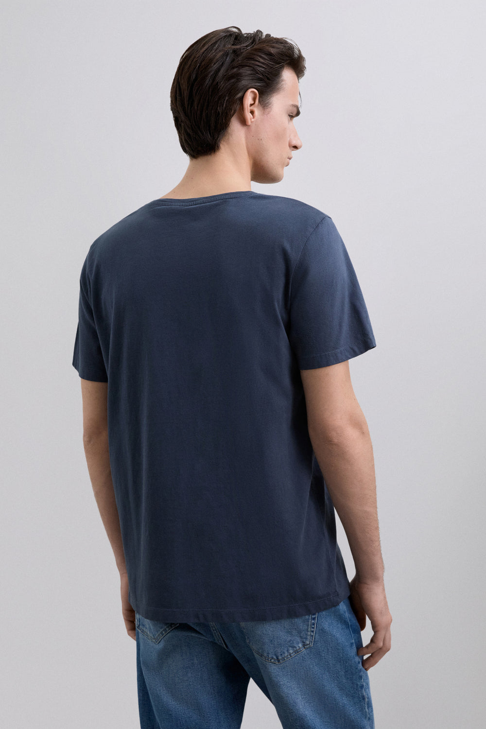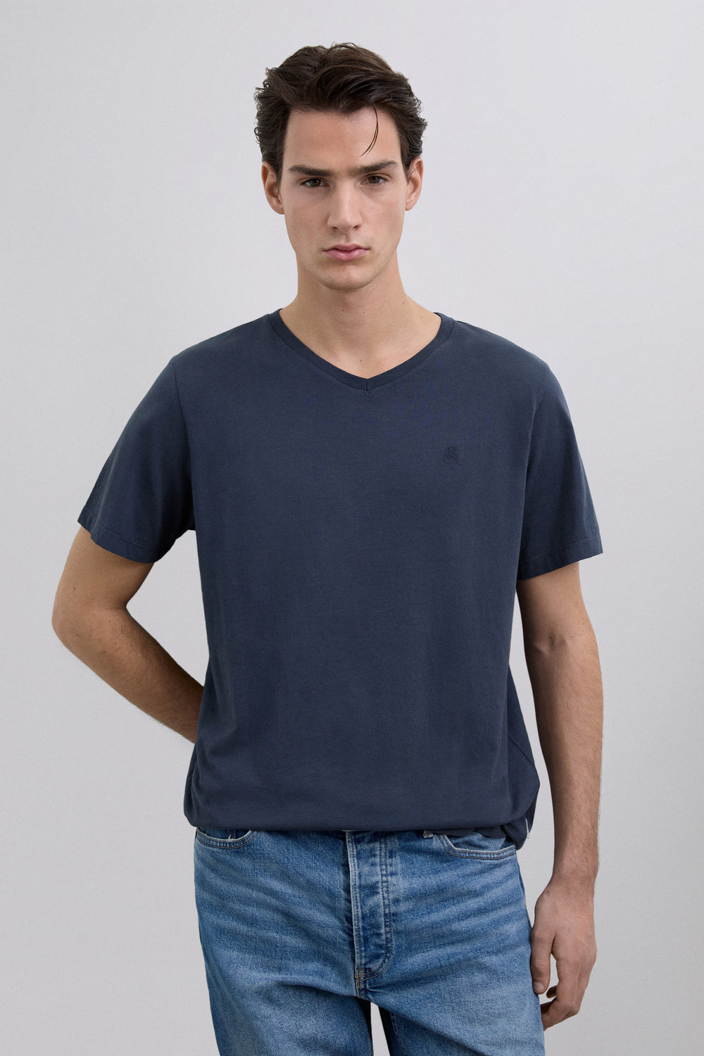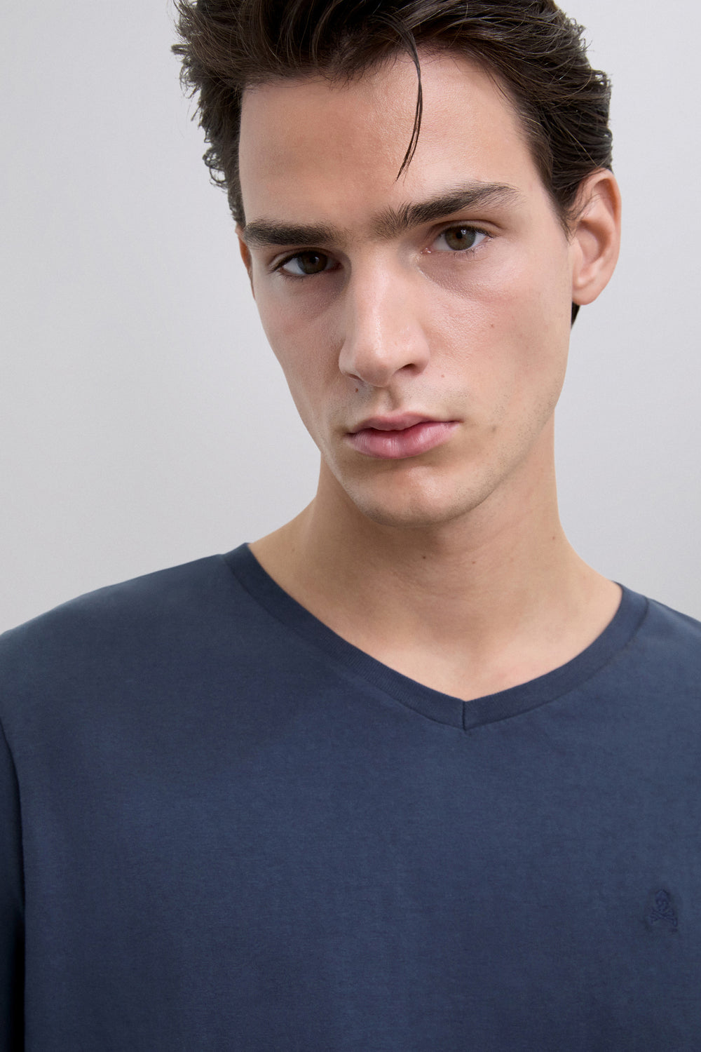 Camiseta básica con calavera bordada. Confeccionada en 100% algodón BCI. Corte Regular Fit. Cuello en pico. Manga corta.