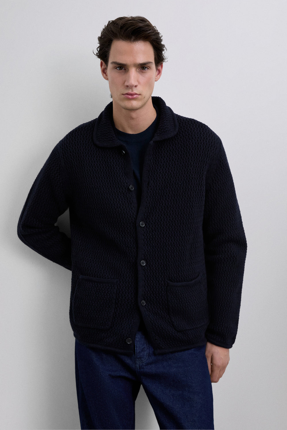 Cardigan confeccionado en mezcla lana. Cierre frontal mediante botones. Cuello camisero. Manga larga. Dos bolsillos delanteros.