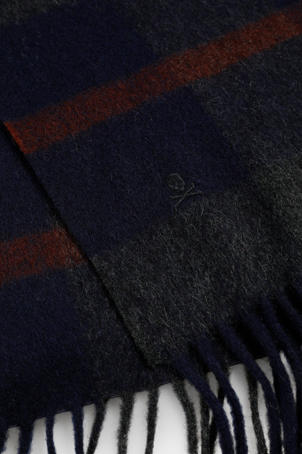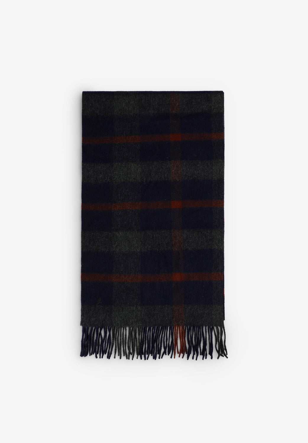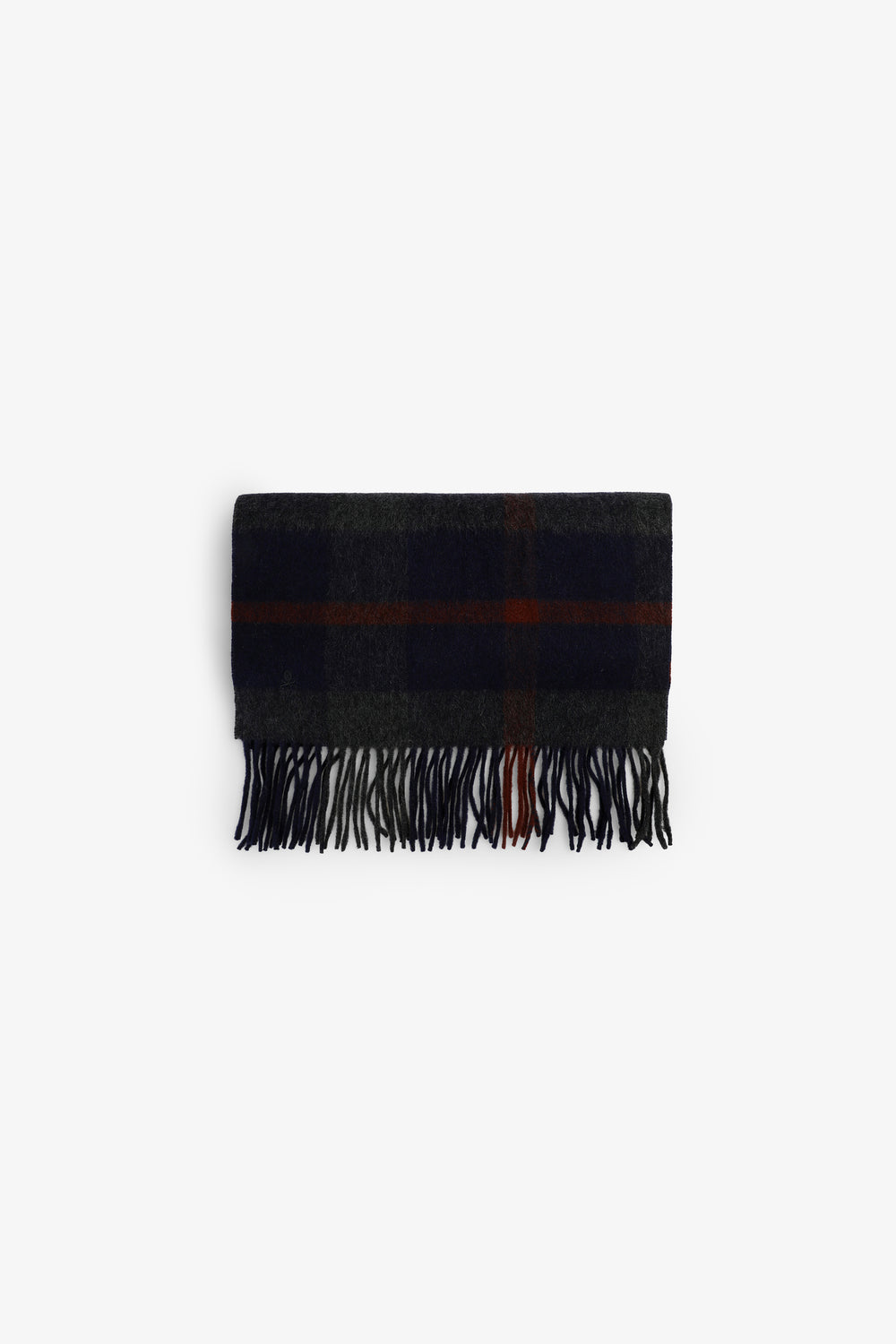 Bufanda confeccionada en mezcla de lana y cashmere. Estampado tartán. Flecos. Logotipo bordado. Detalle de etiqueta.