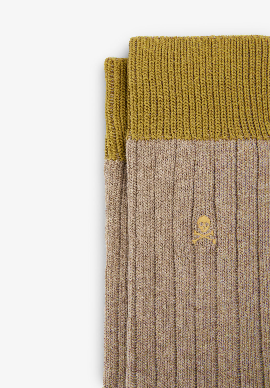 Calcetines en canalé confeccionados en mezcla de algodón orgánico. Caña, talón y puntera a contraste. Calavera bordada en caña a contraste.