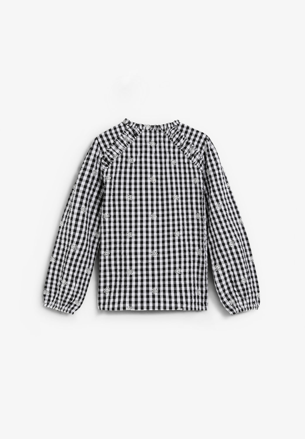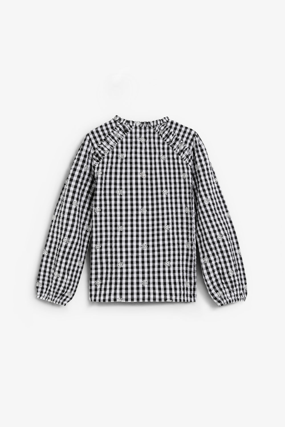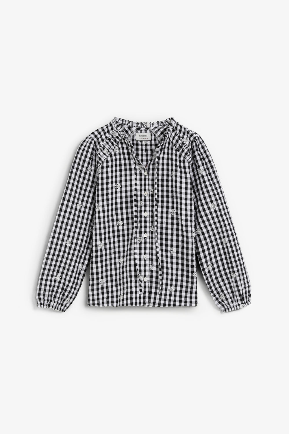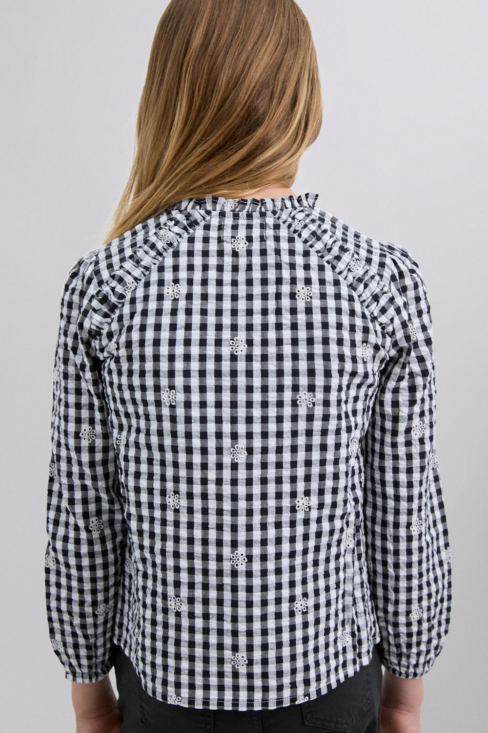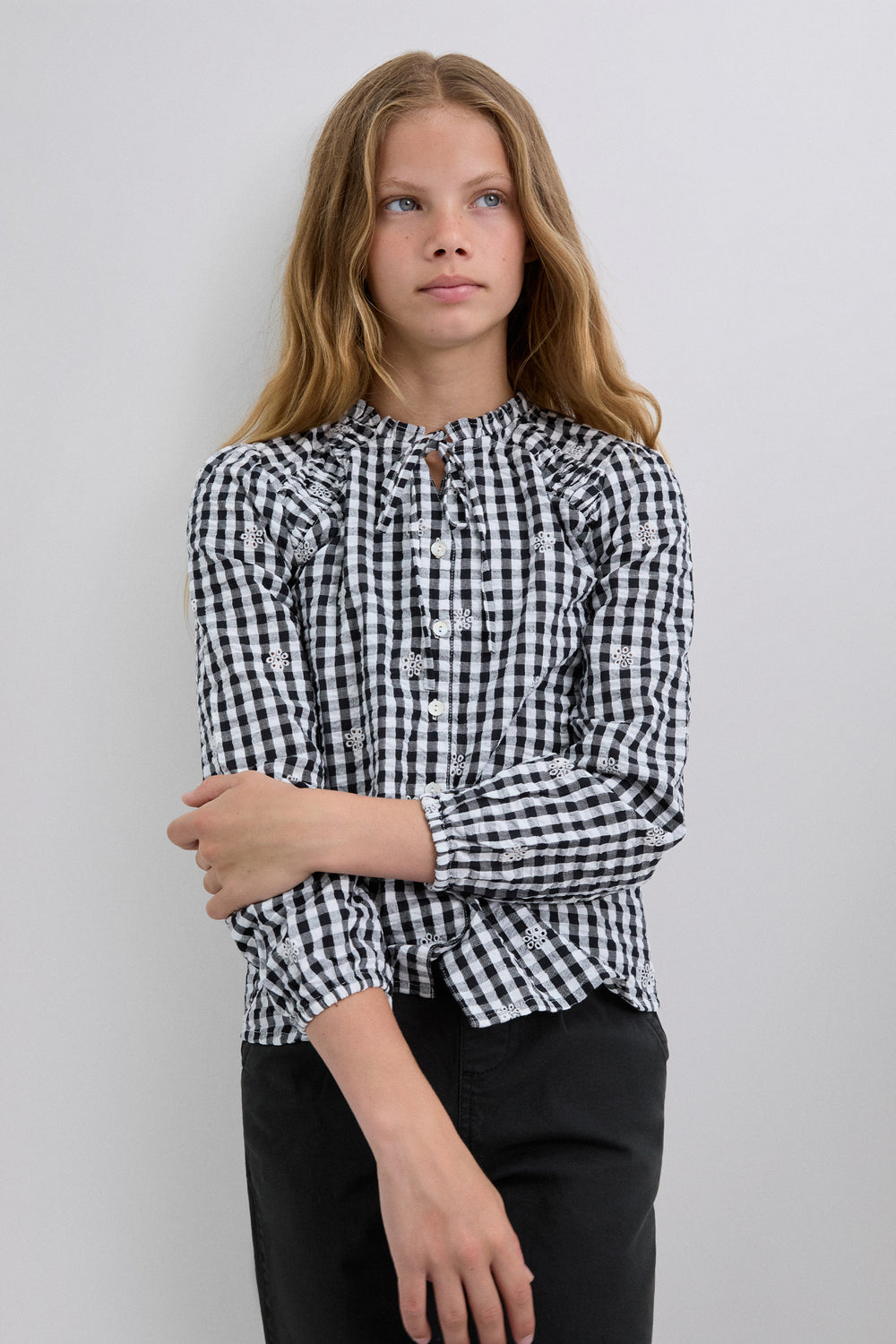 Camisa confeccionada en 100% algodón BCI. Manga larga. Cierre ajustable con lazo en frontal y botones. Detalles bordados.