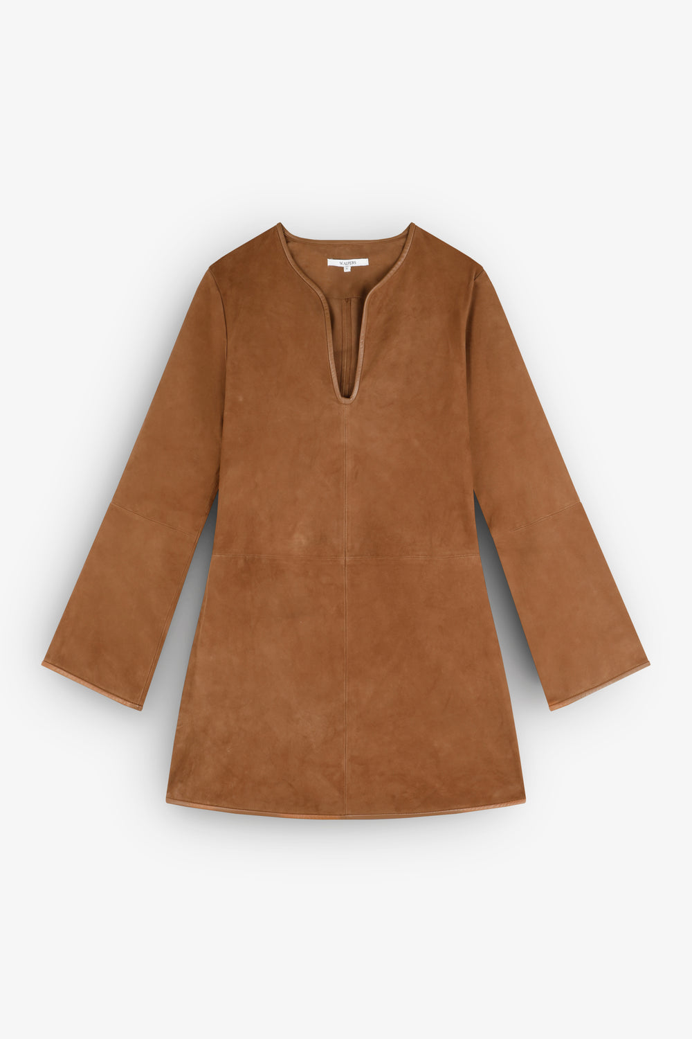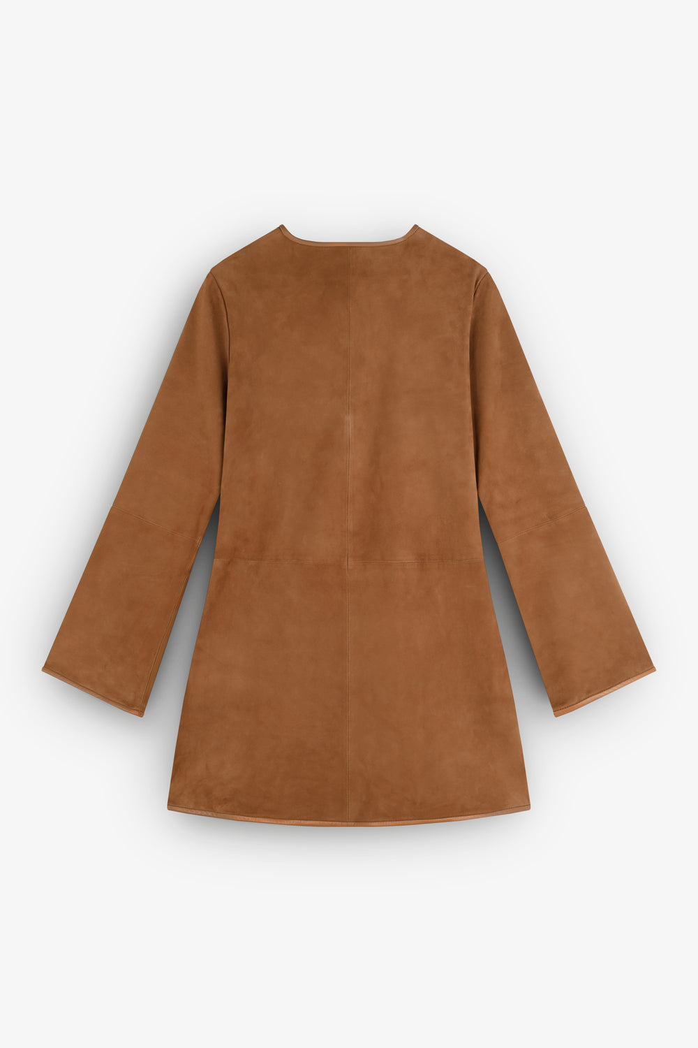 Vestido mini confeccionado en piel caprina con acabado en ante. Cuello caja. Manga larga ligeramente acampanada. Detalles de costuras y Piping alrededor del escote, mangas y bajo.