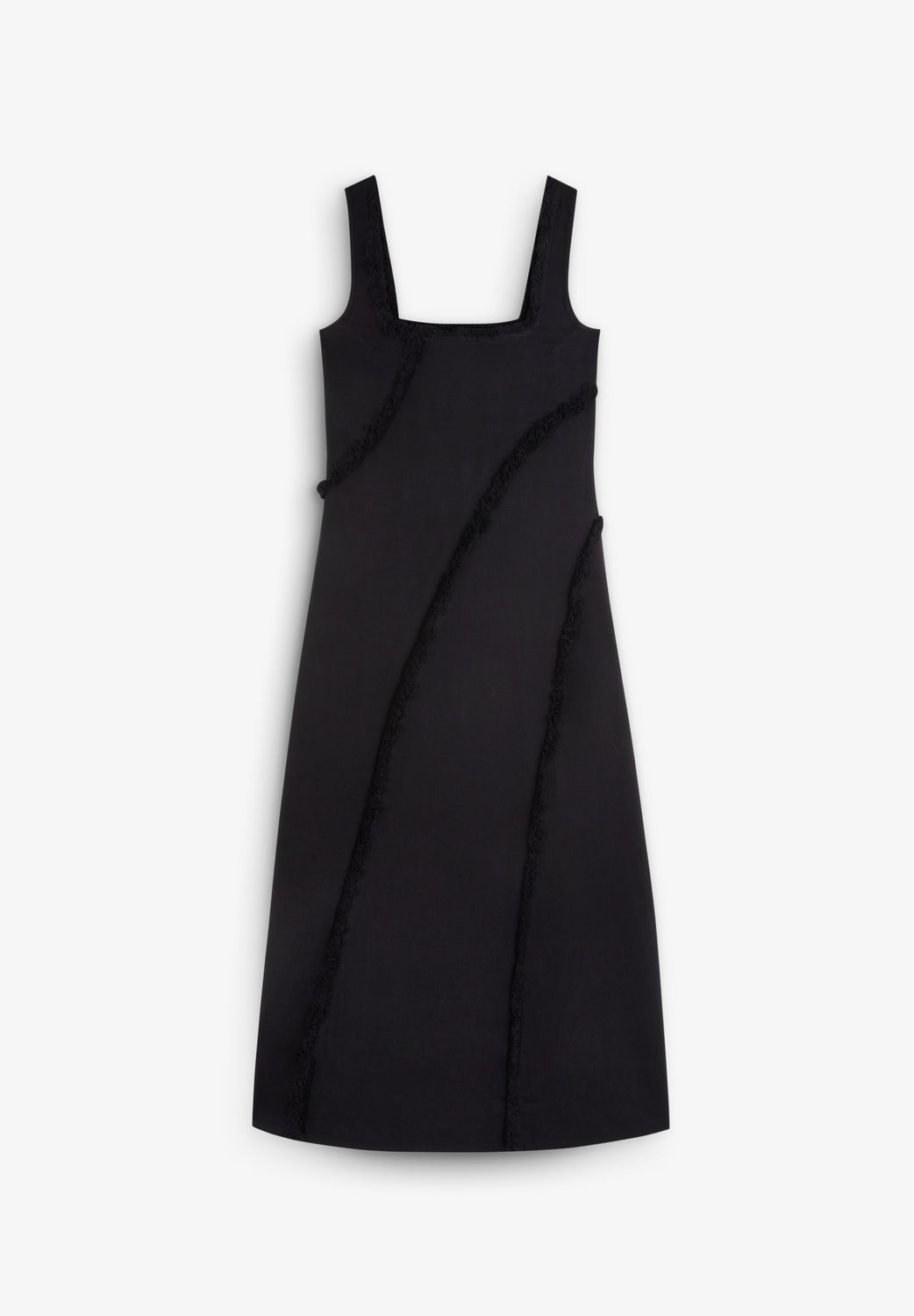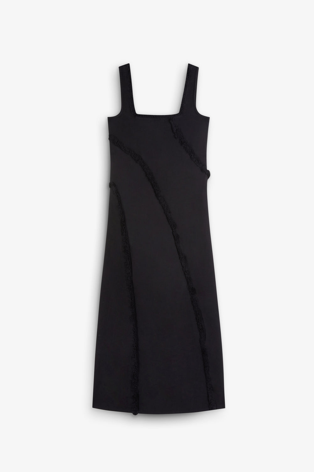 Vestido midi confeccionado en 100% Algodón Orgánico BCI. Tirantes. Escote cuadrado. Detalle de flecos despuntados.