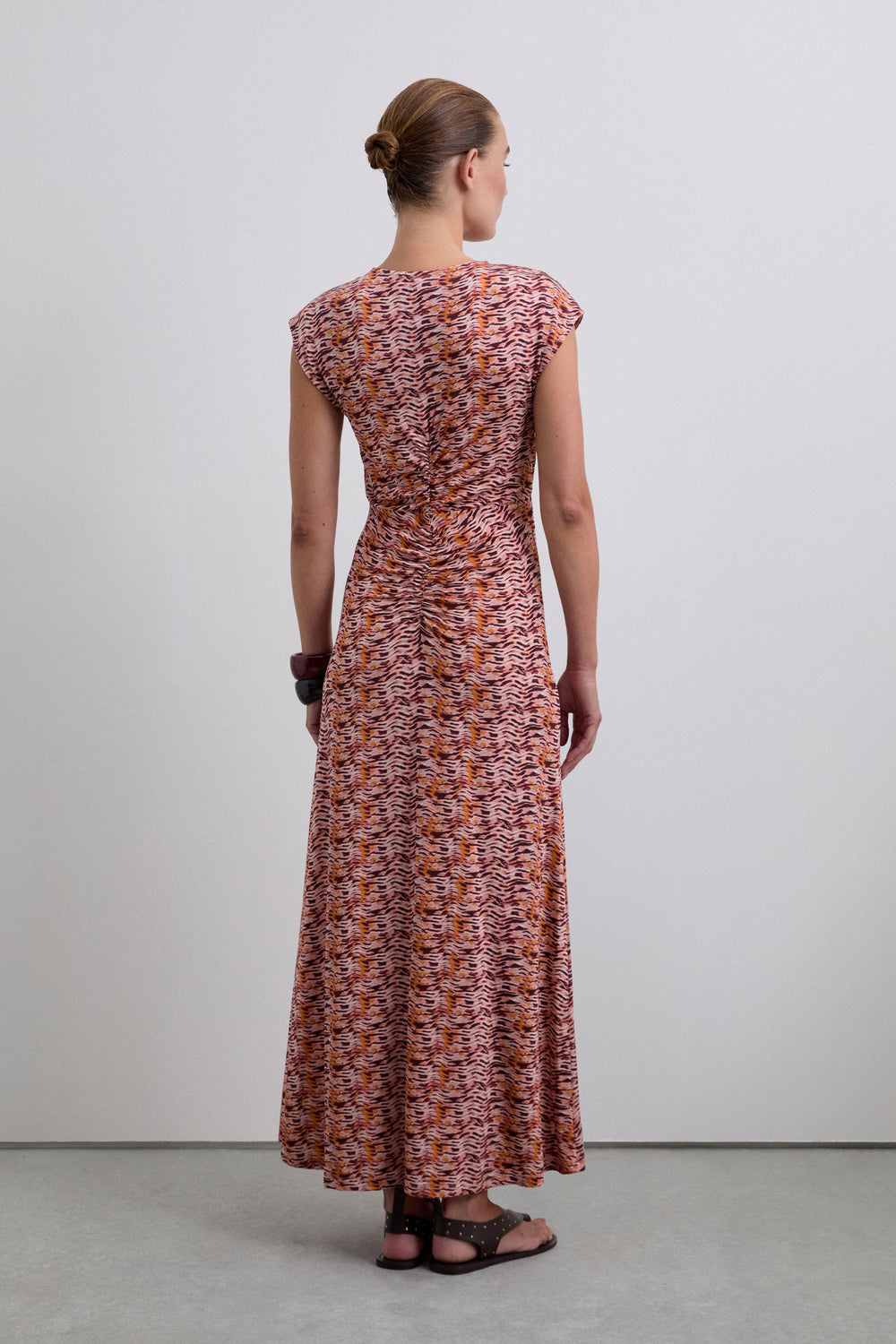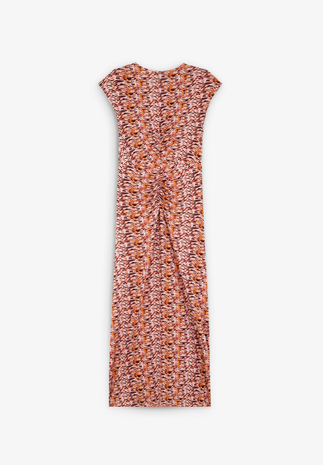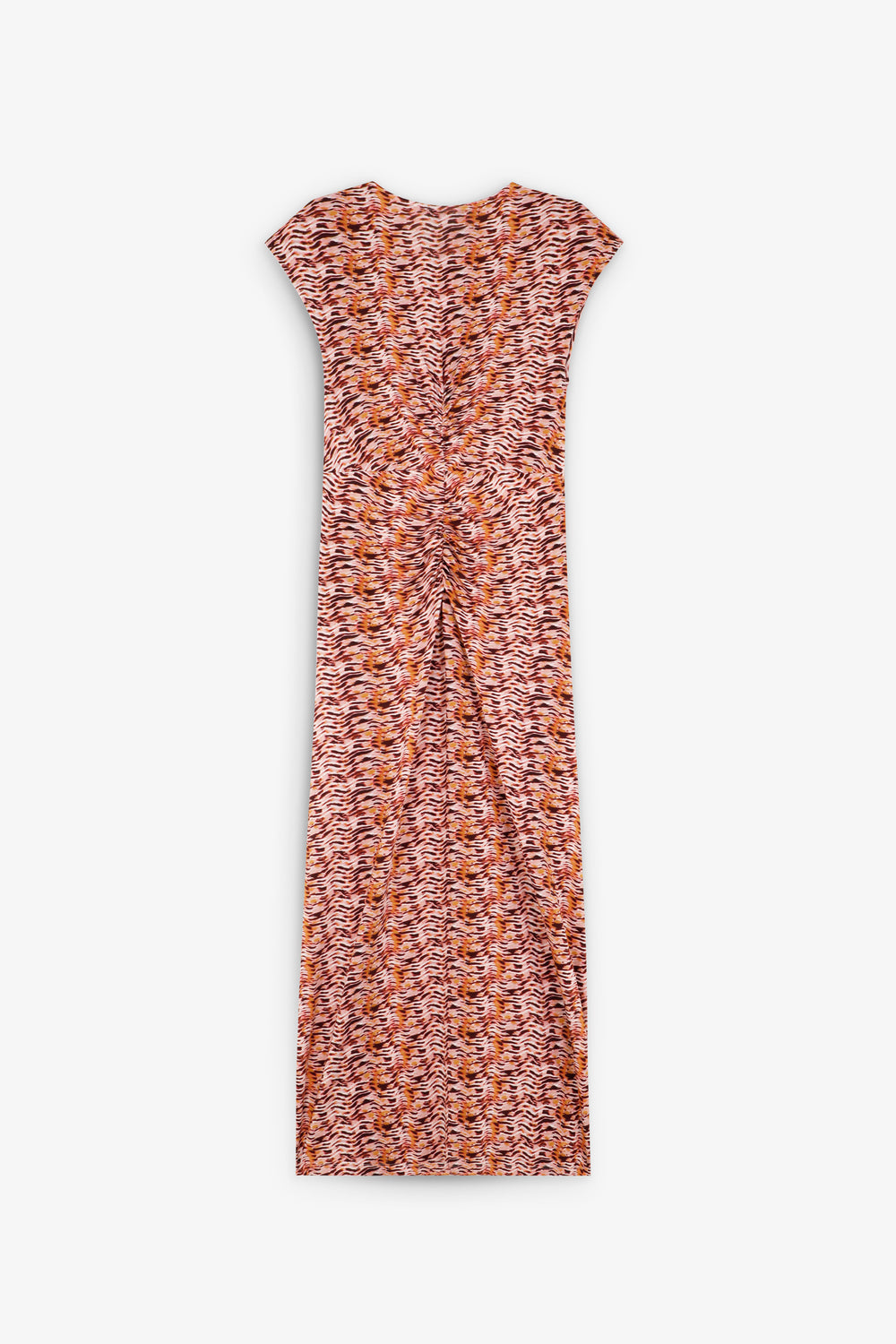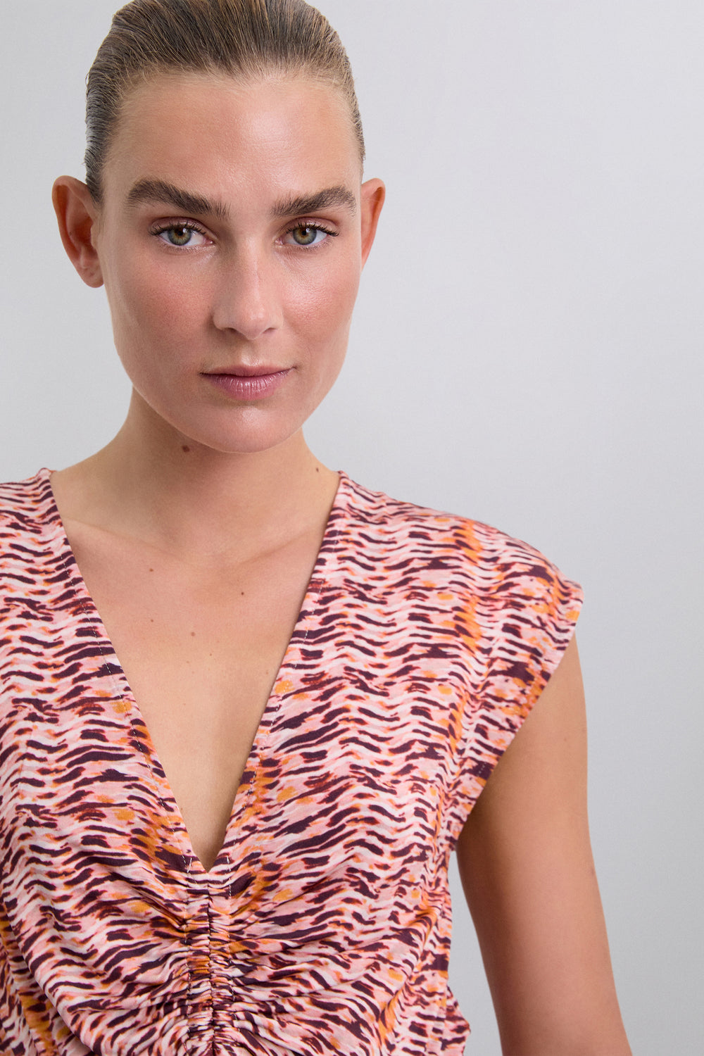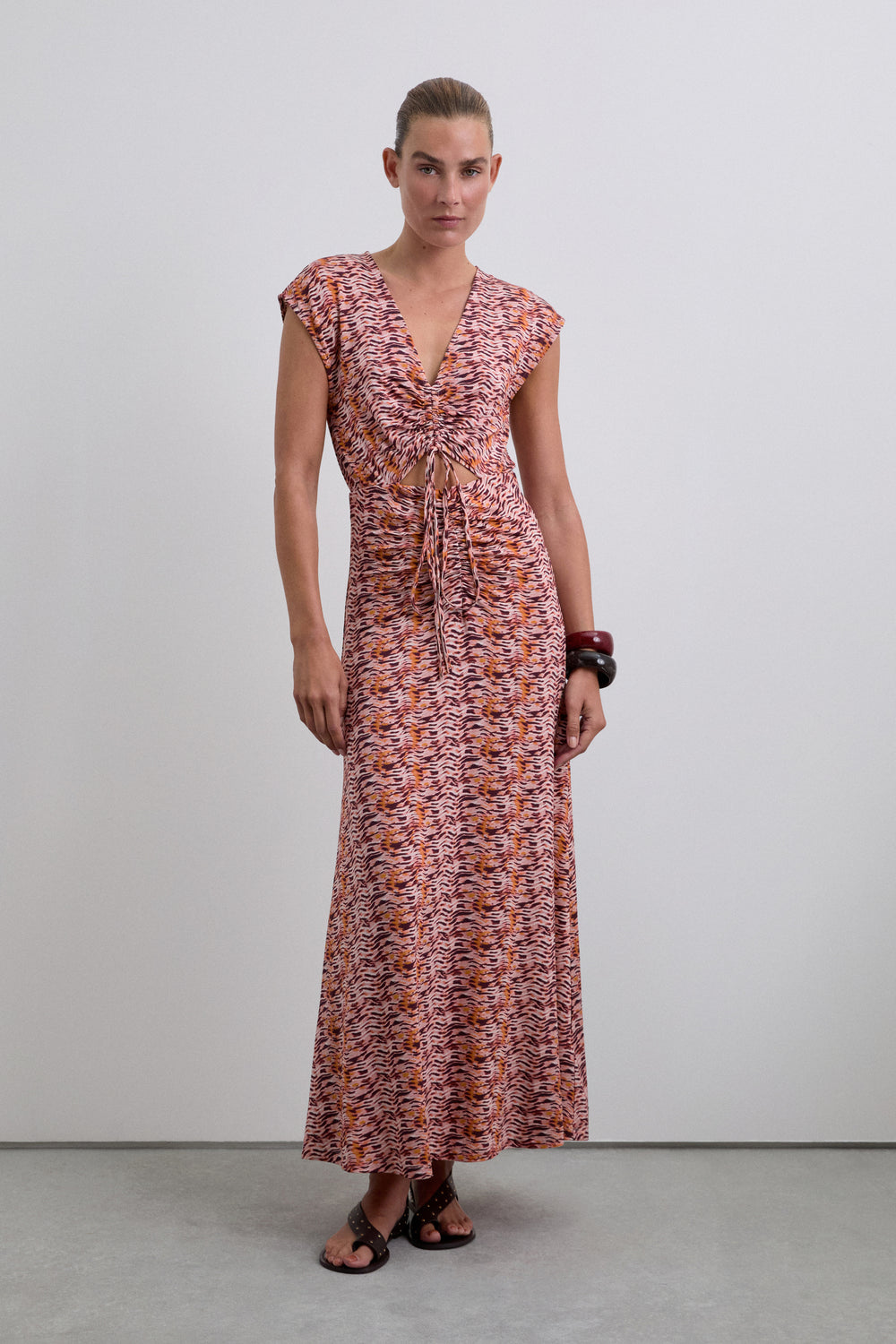 Vestido confeccionado en viscosa ligeramente elástico con estampado. Corte slim fit, escote en V y manga corta. Detalle de cut out frontal con lazada ajustable en pecho.