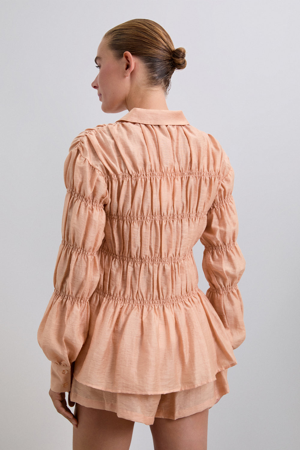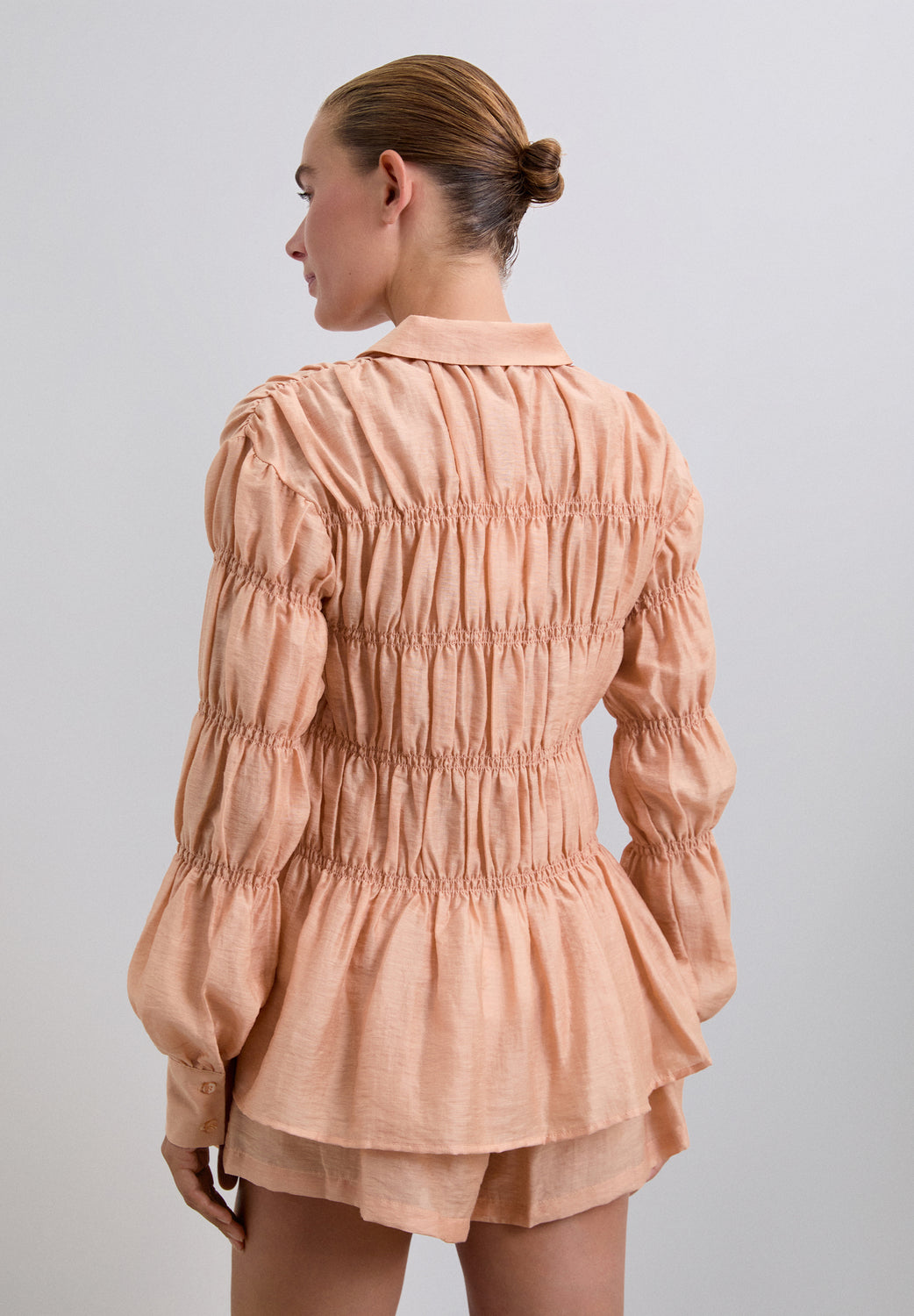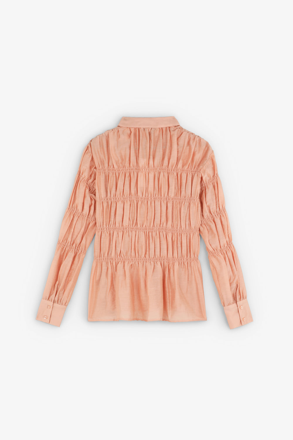 Camisa confeccionada en tejido con textura. Manga larga con smock. Cierre clásico de cuello de camisa en la parte frontal. Manga larga ligeramente abullonada.