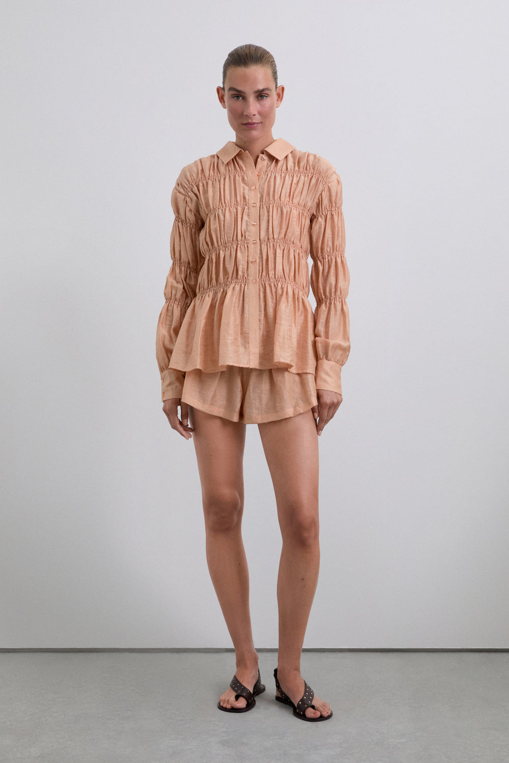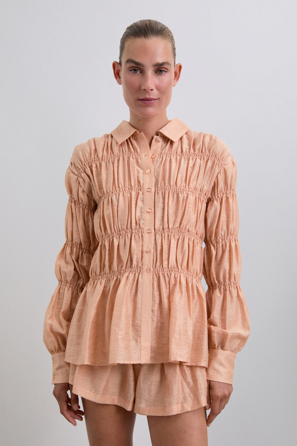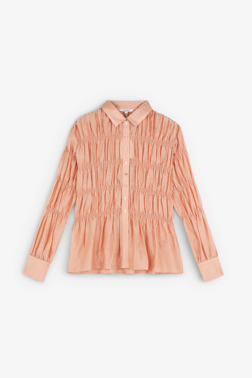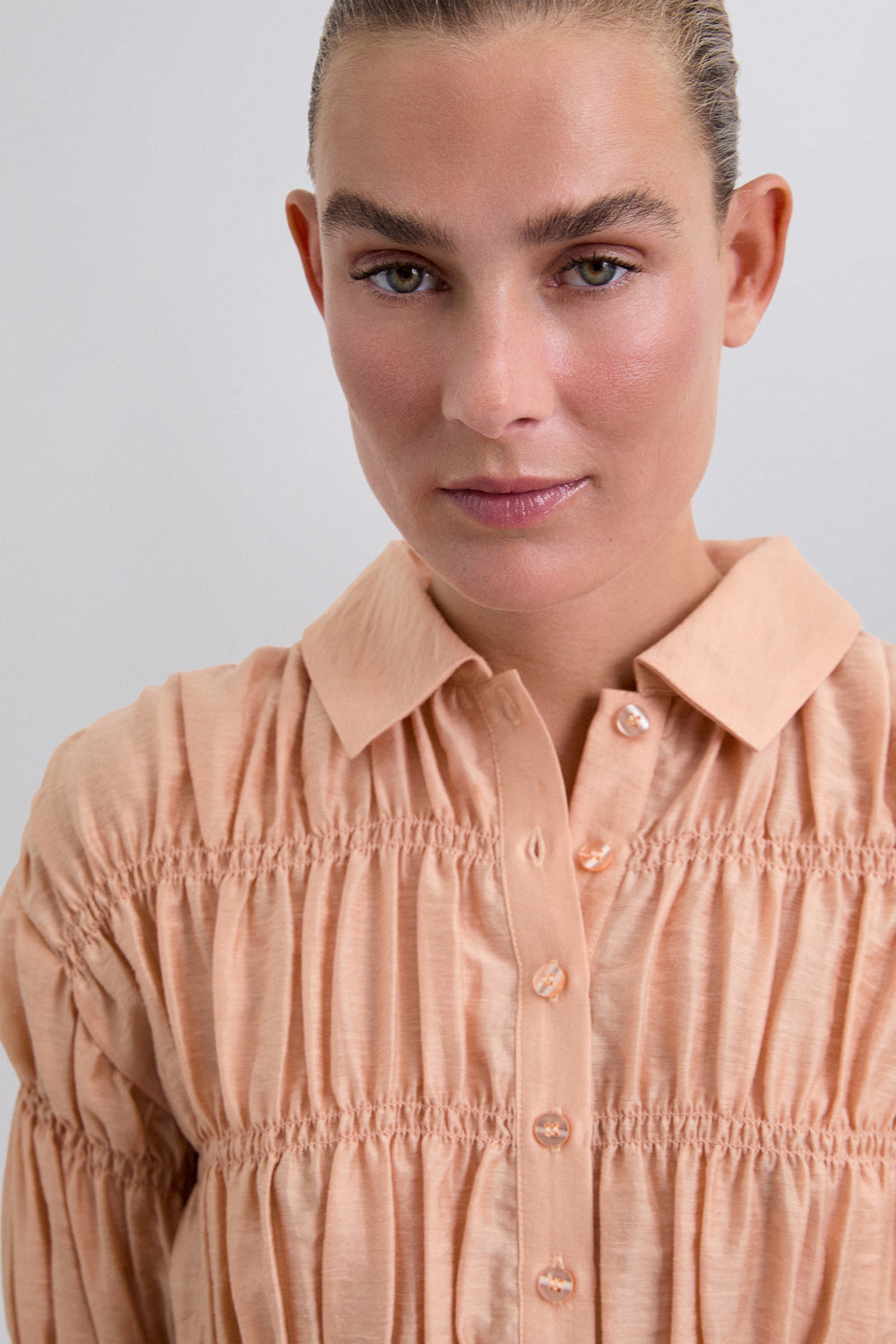 Camisa confeccionada en tejido con textura. Manga larga con smock. Cierre clásico de cuello de camisa en la parte frontal. Manga larga ligeramente abullonada.