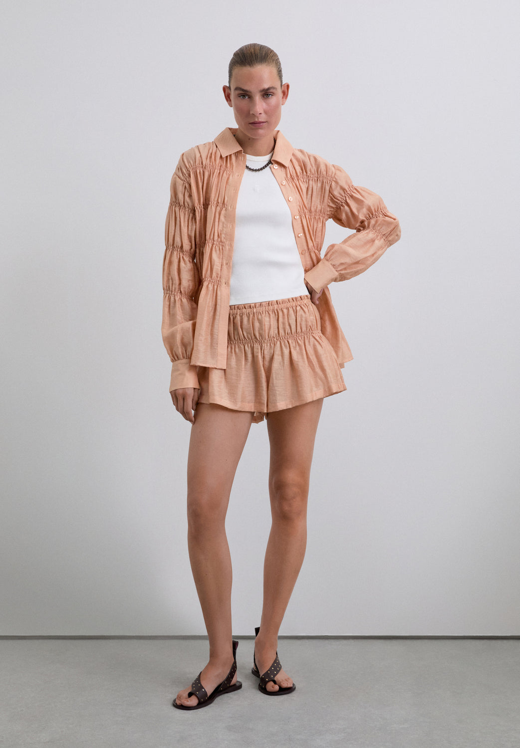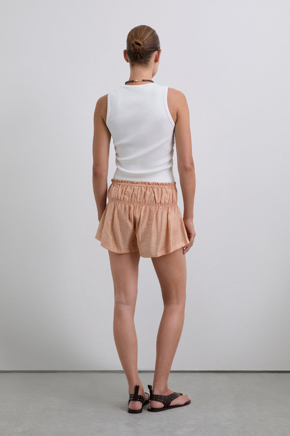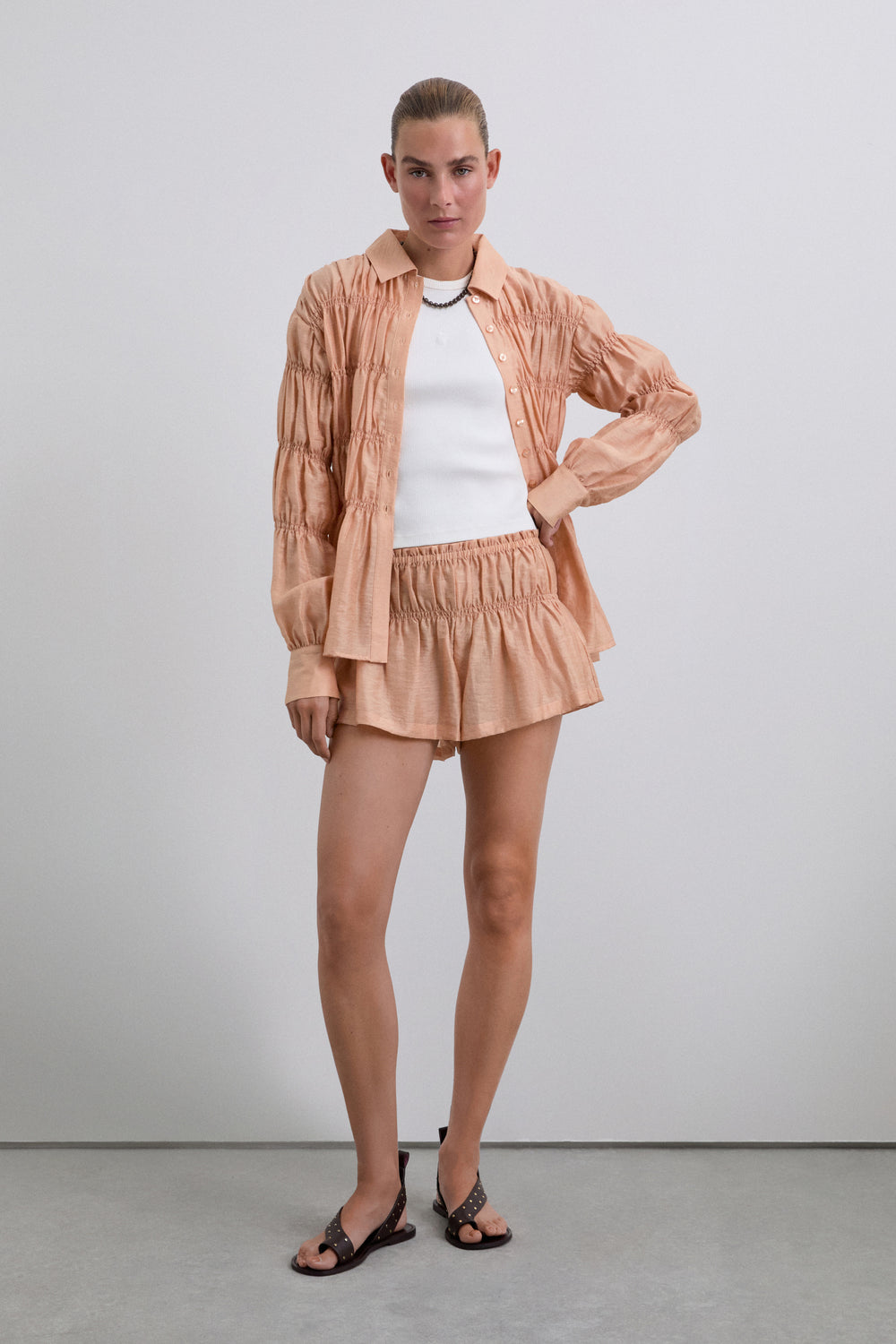 Short confeccionado en tejido con textura. Cintura con smock ligeramente elástica.