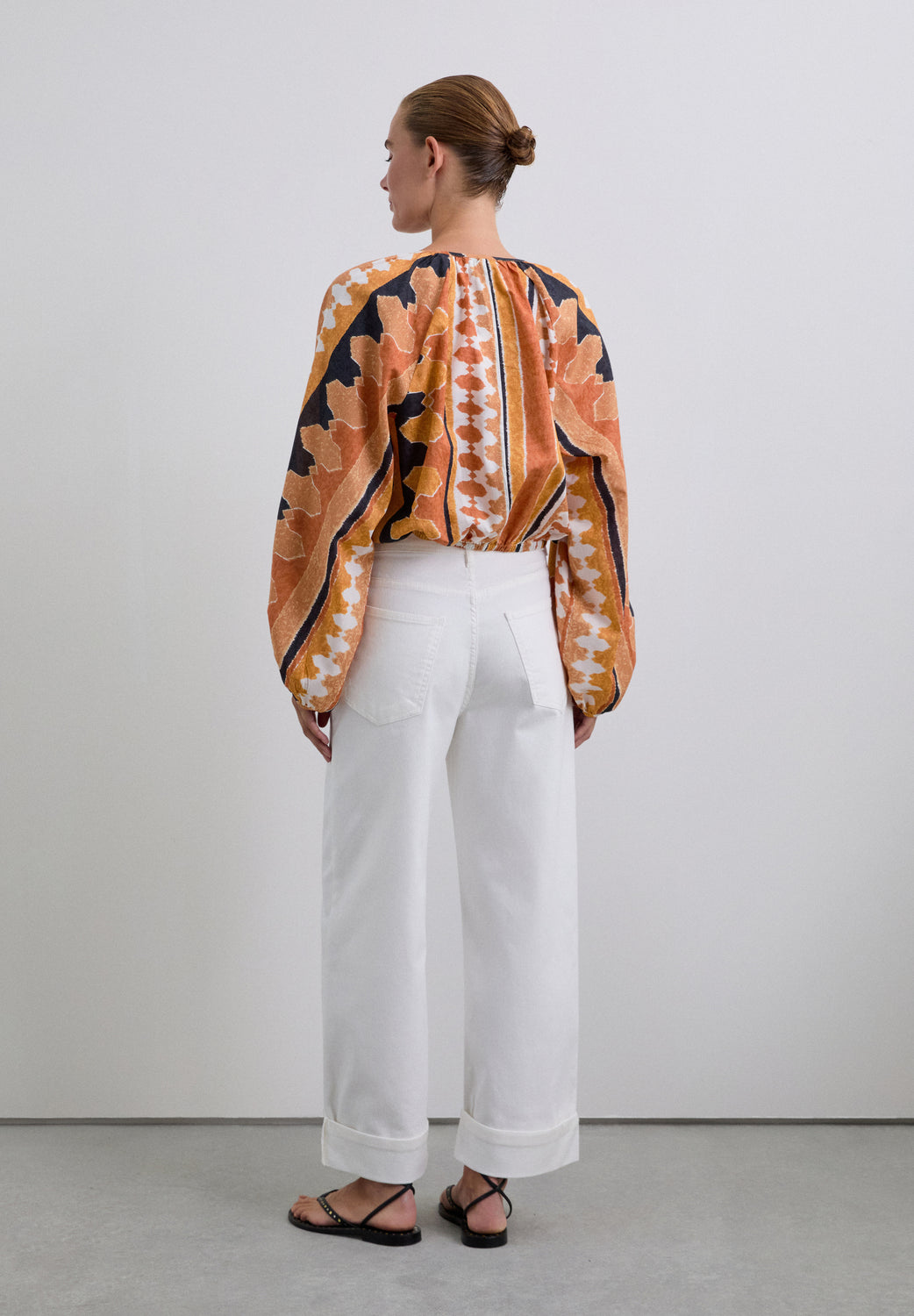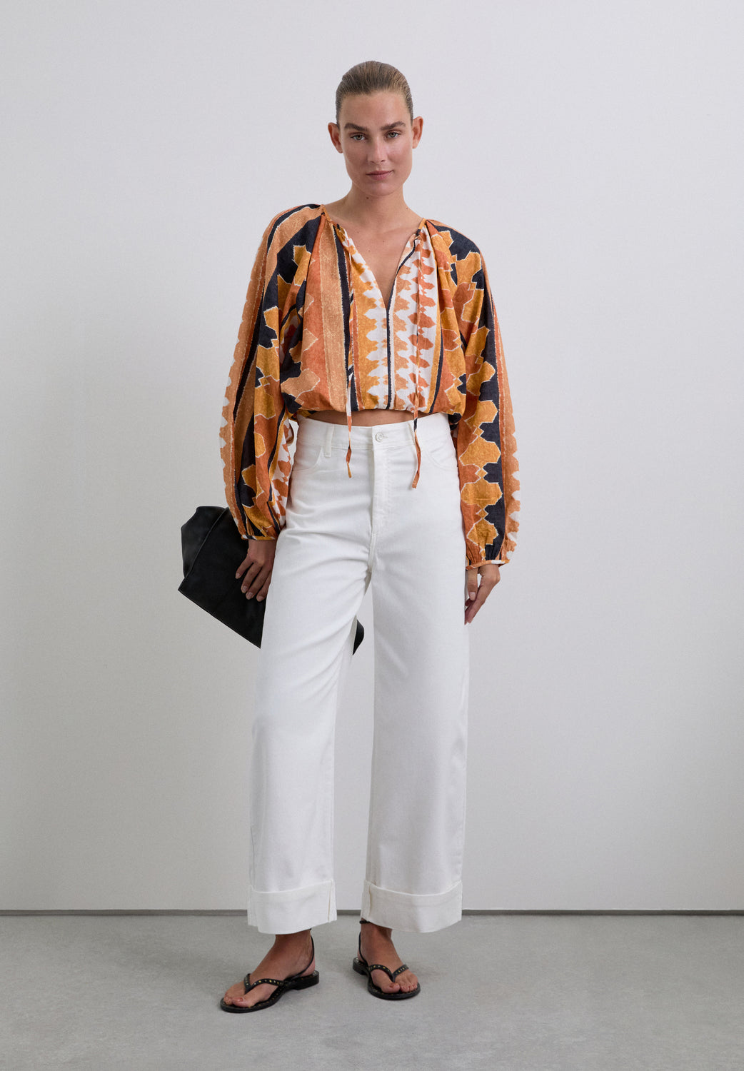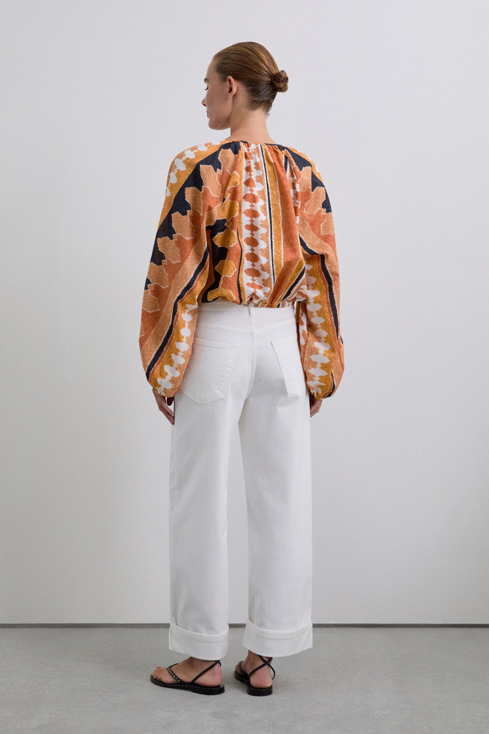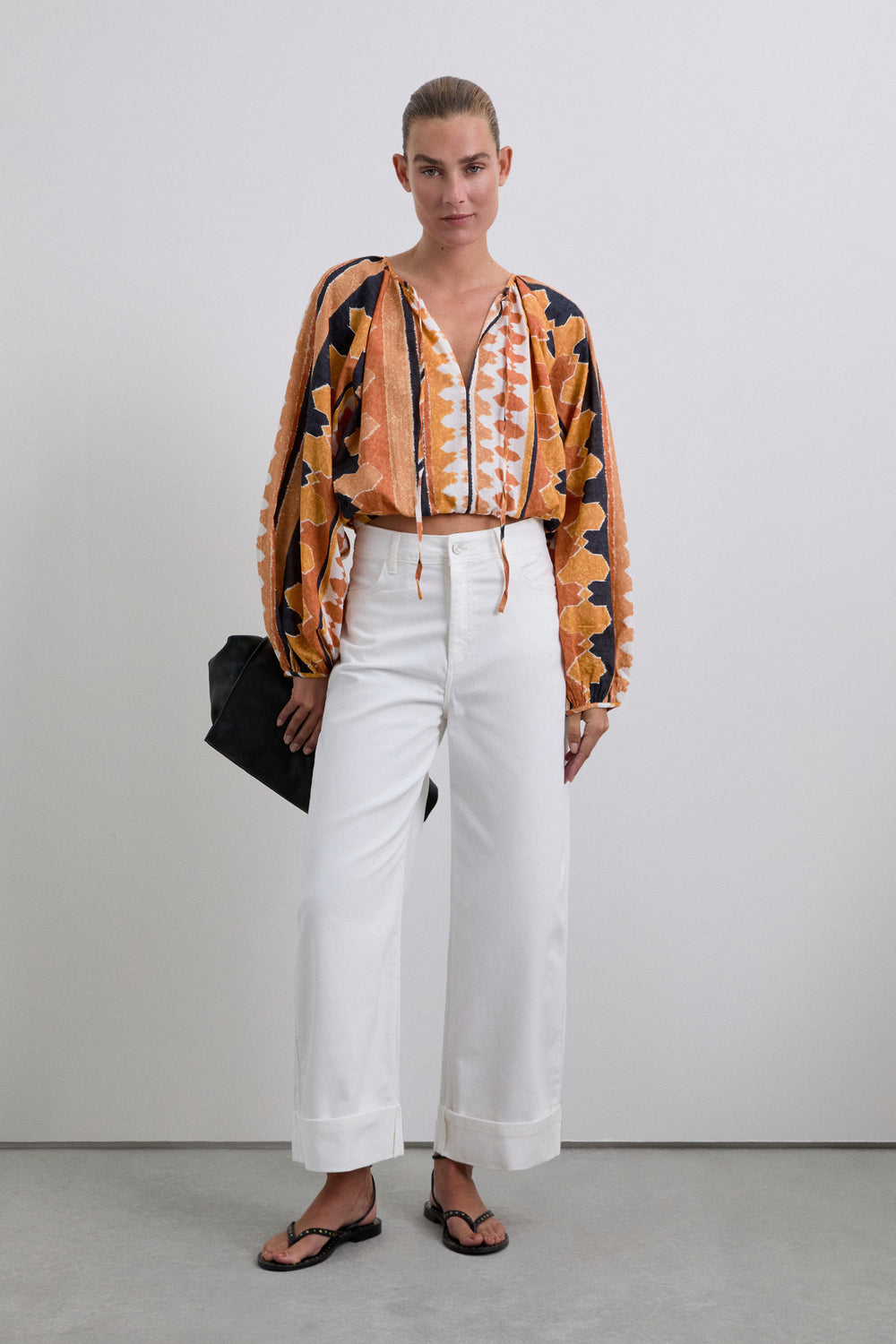 Pantalón denim culotte de tiro medio. Relaxed fit. Con pliegue en la parte inferior. Bolsillos delanteros y traseros. Cierre mediante botón y trabillas en cintura. Detalle logo en etiqueta parte trasera.