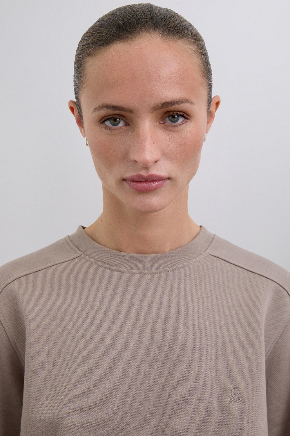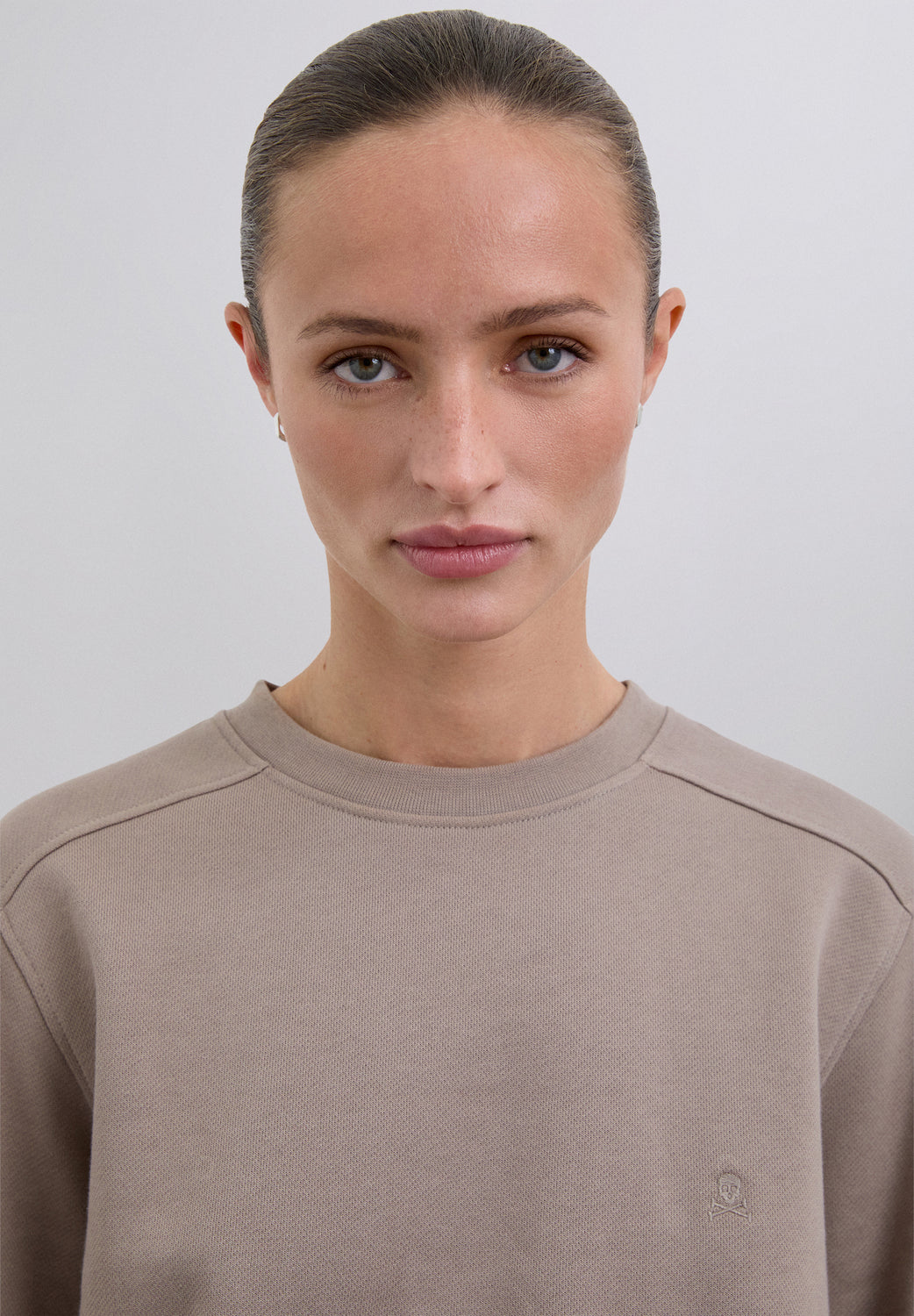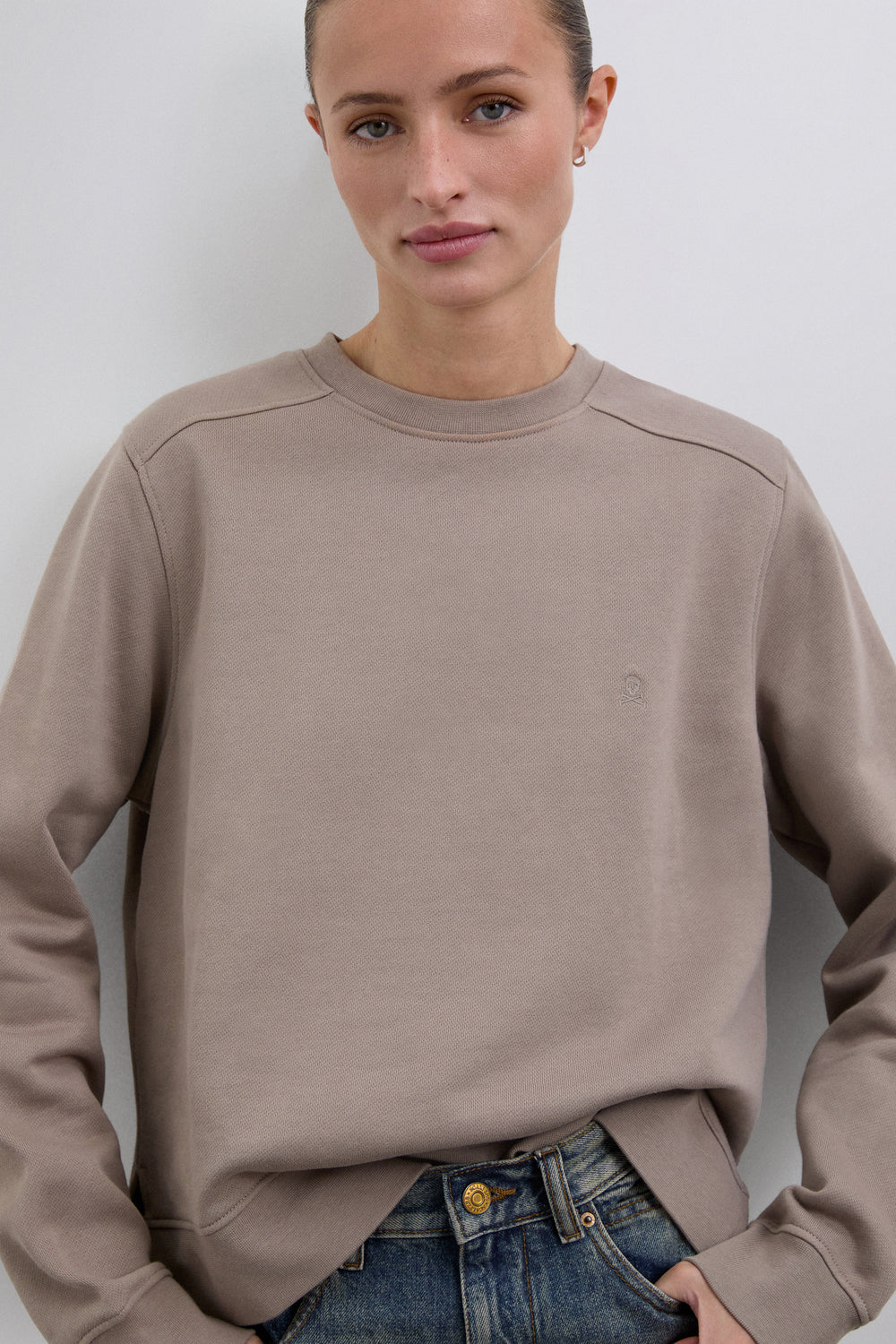 Sudadera confeccionada en 100% algodón BCI. Corte regular fit, cuello redondo y manga larga con puños acabados en rib. Bajo asimétrico, parte trasera alargada. Detalle de calavera bordada en pecho.