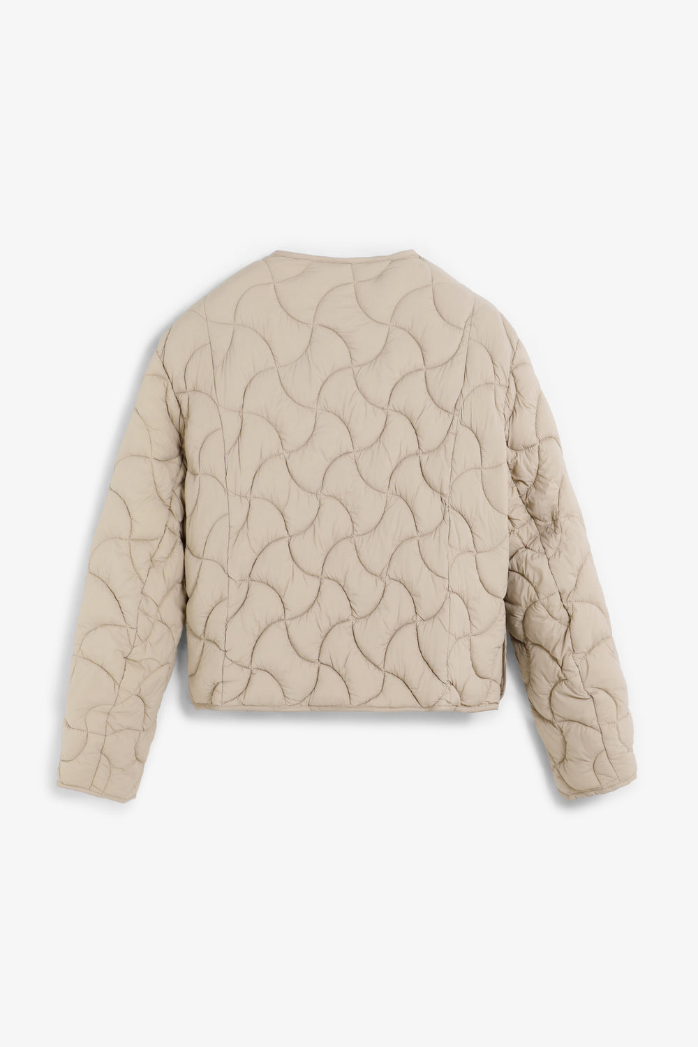 Chaqueta acolchada de corte regular. Cuello redondo. Manga larga. Cierre de botones a presión y cremallera en la parte delantera. Bajo redondeado. Detalle de ribete alrededor de las mangas, los bolsillos y el bajo.
