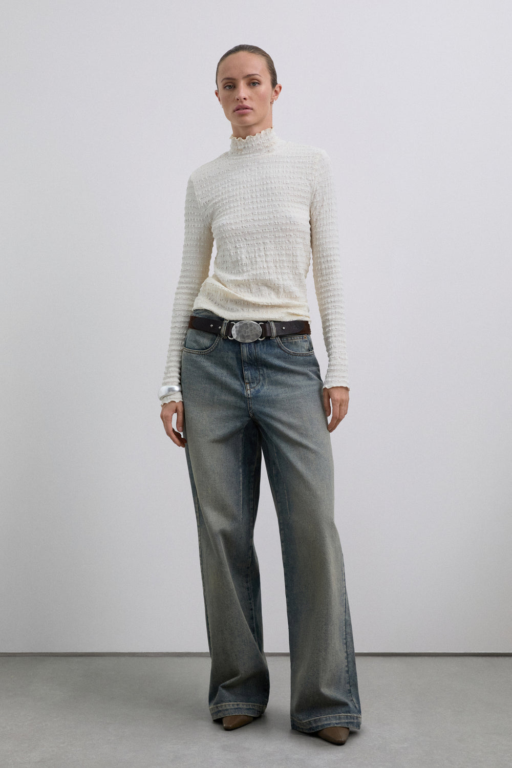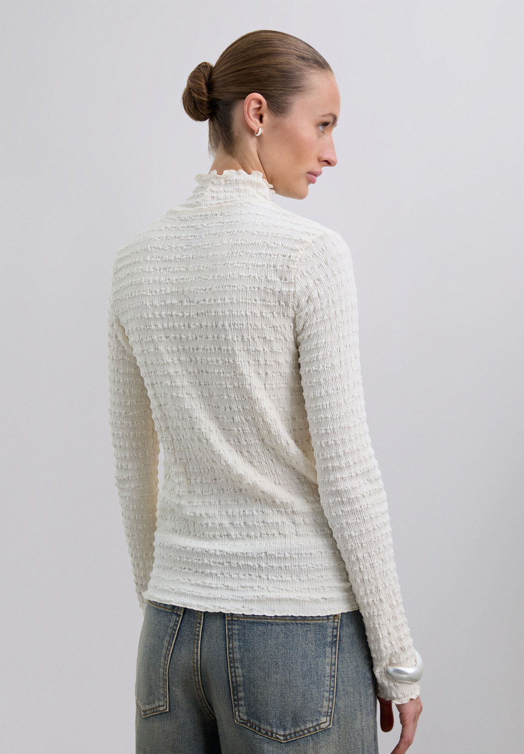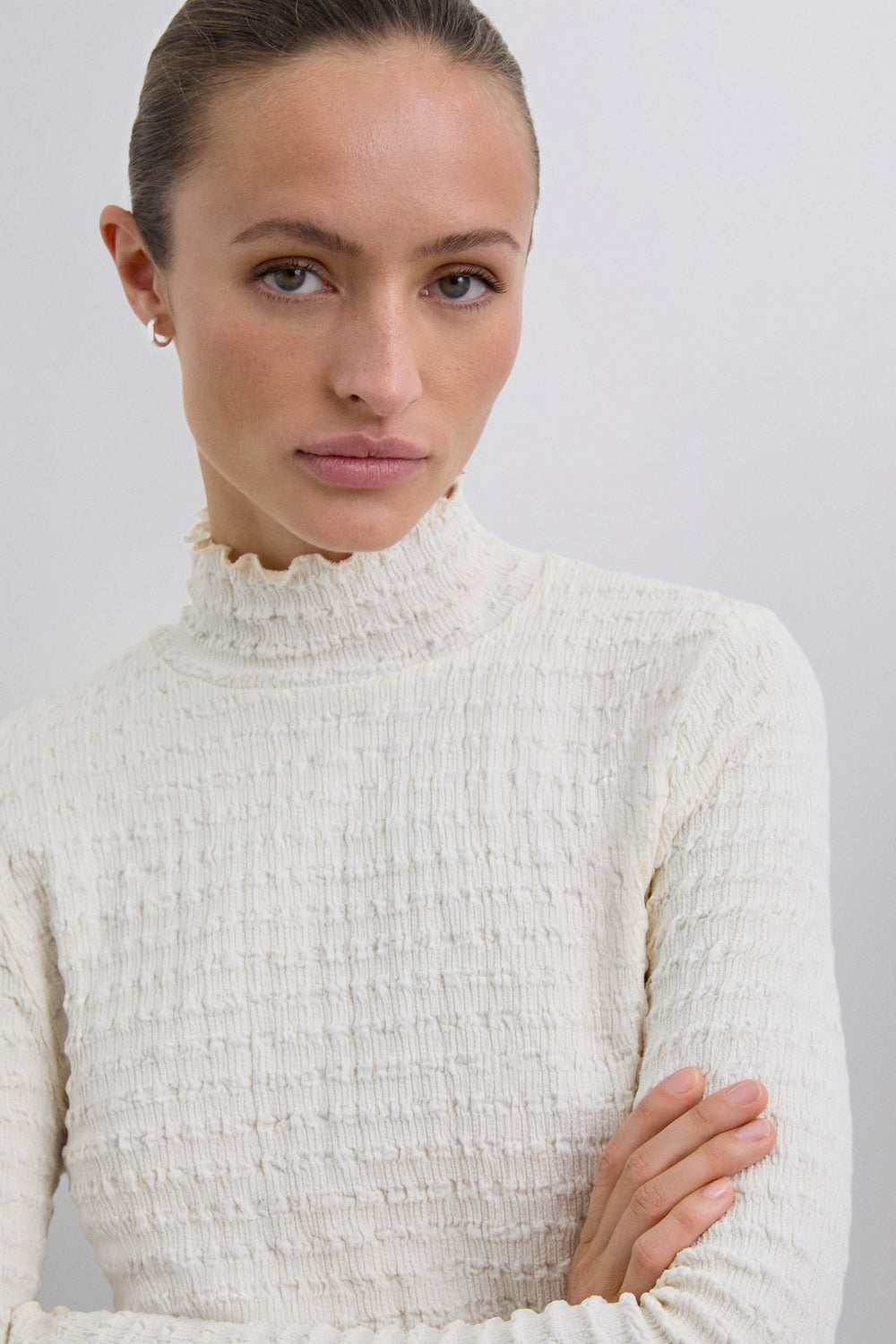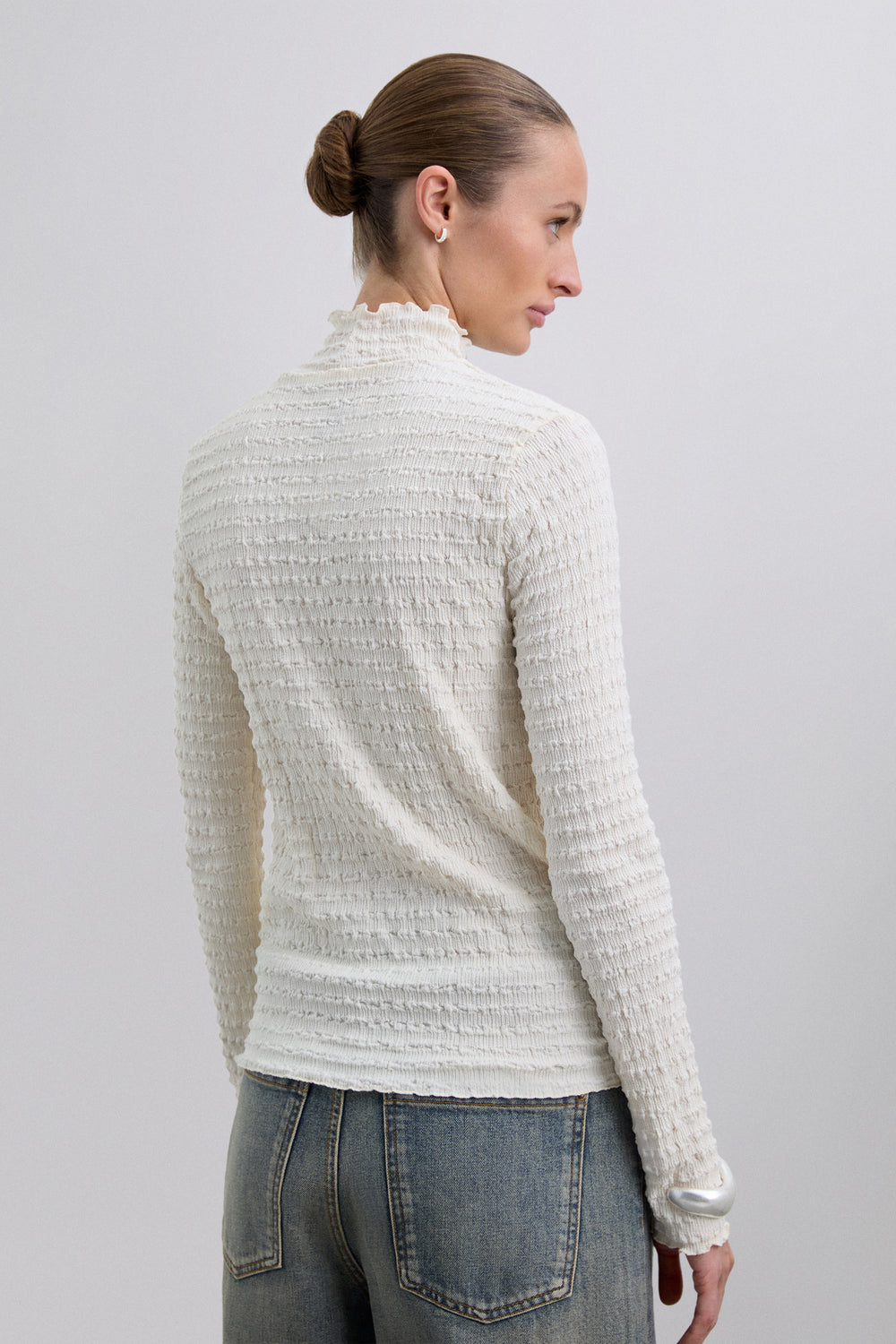 Top cuello alto y manga larga. Tejido ligero con diseño con estructura fruncida.