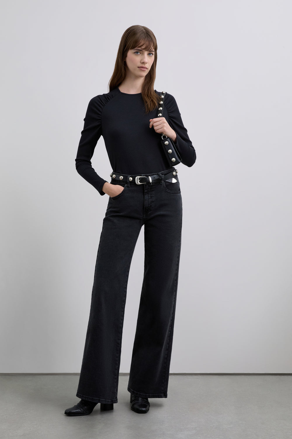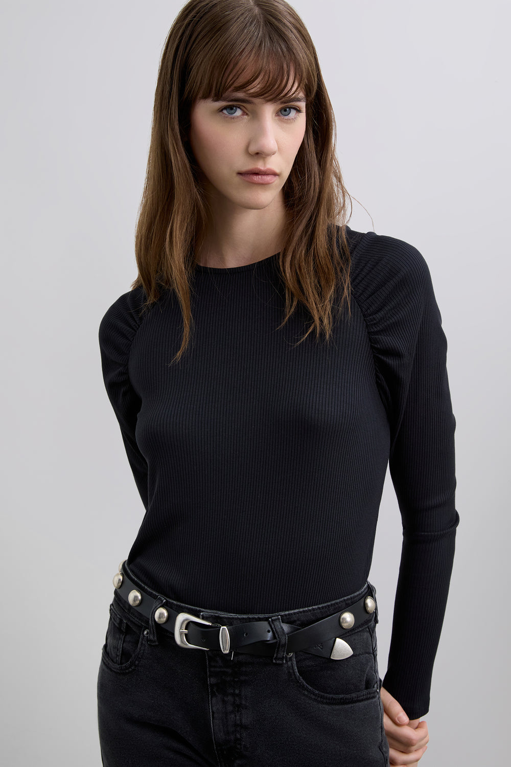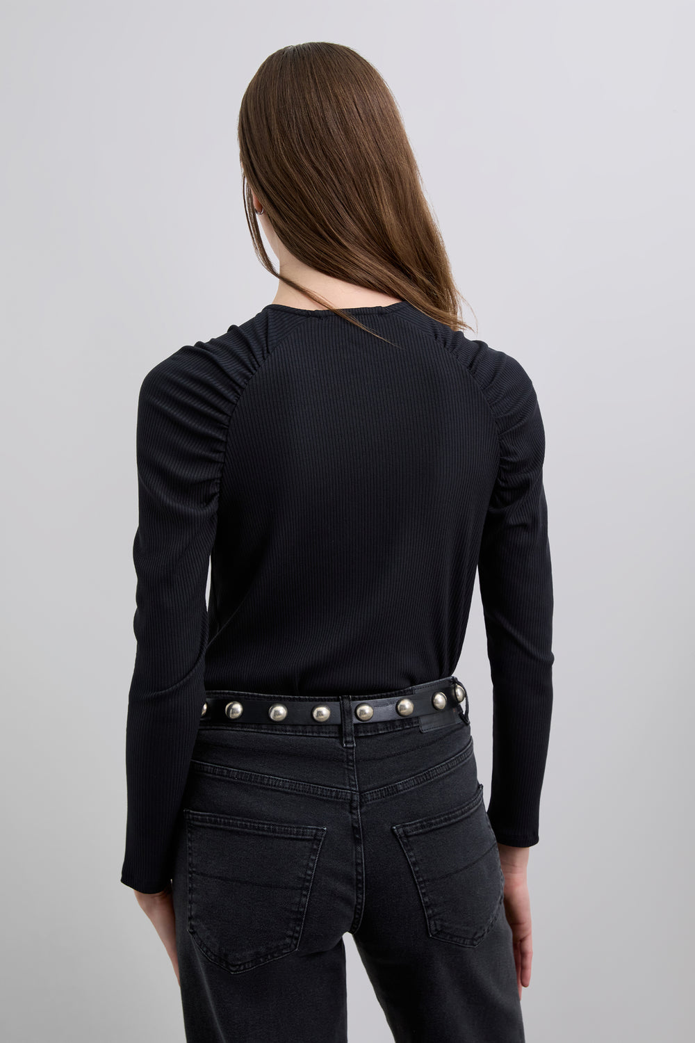 Camiseta de manga larga canalé. Detalle en los hombros con fruncido. Tejido elástico y cuello redondo.