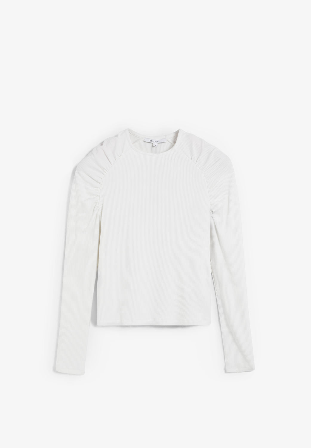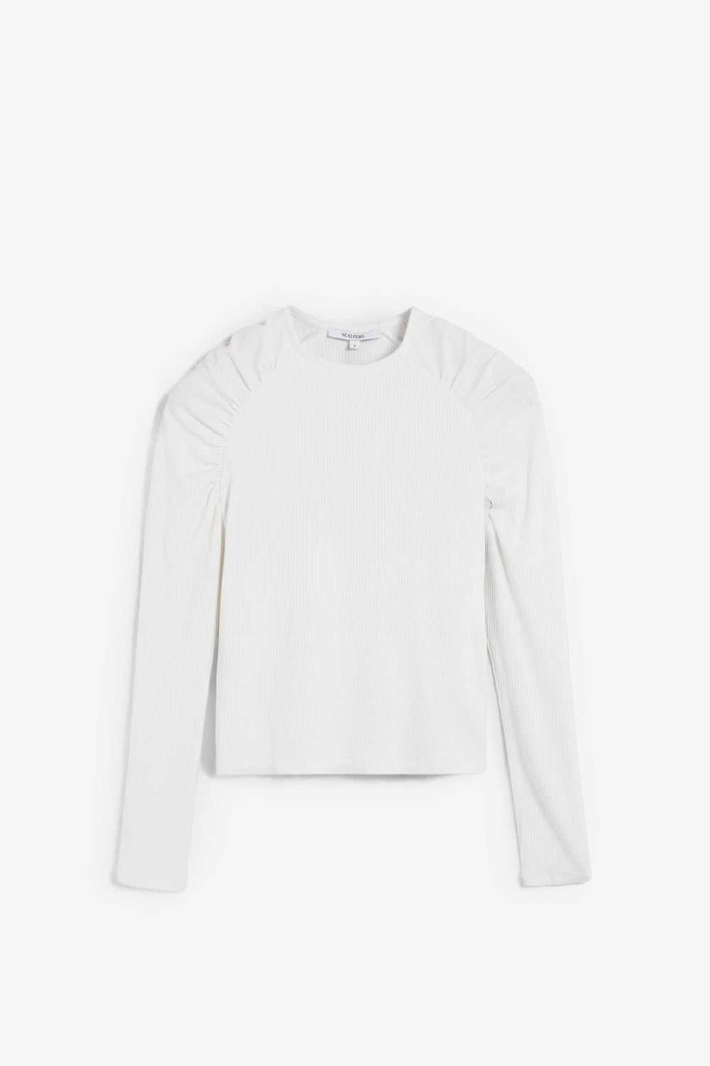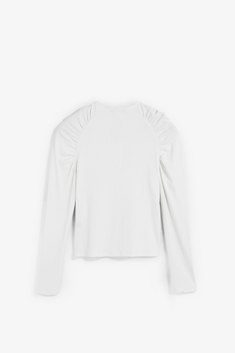 Camiseta de manga larga canalé. Detalle en los hombros con fruncido. Tejido elástico y cuello redondo.