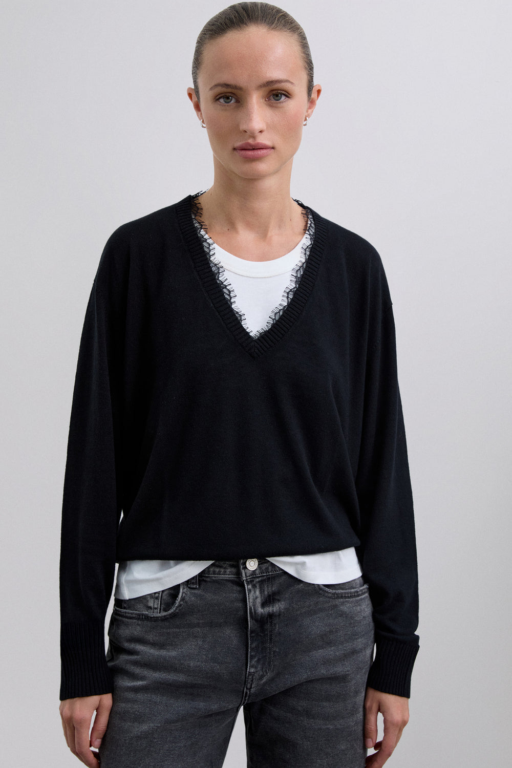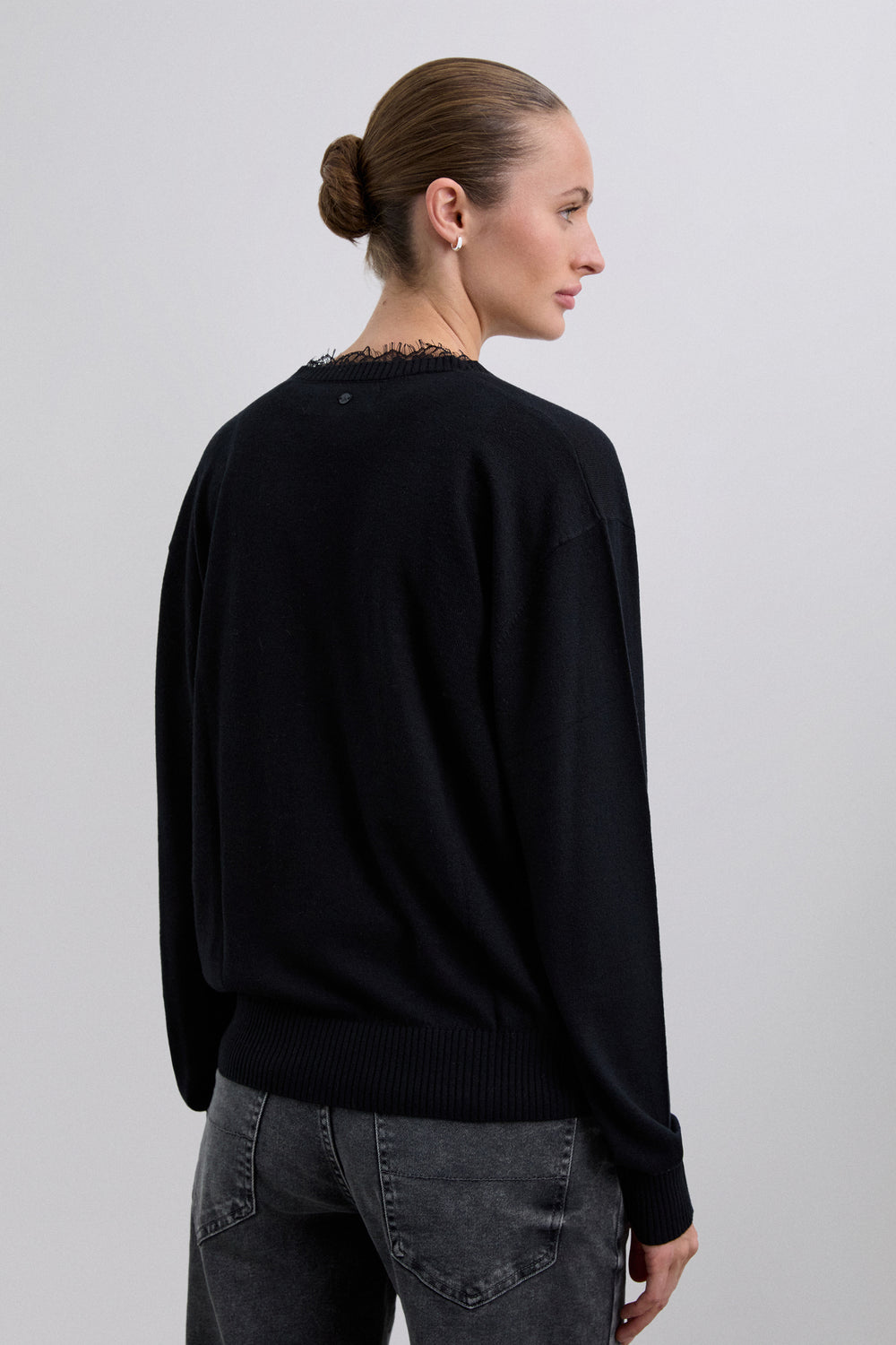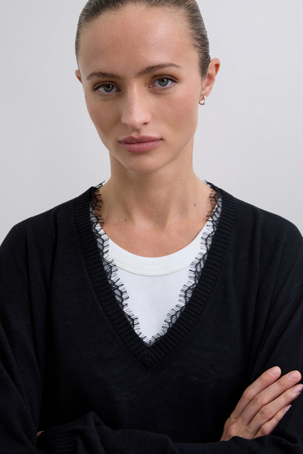Jersey confeccionado en mezcla de lana y viscosa. Regular fit. Escote en V con detalles de encaje. Manga larga con puños y bajo acabados en rib.