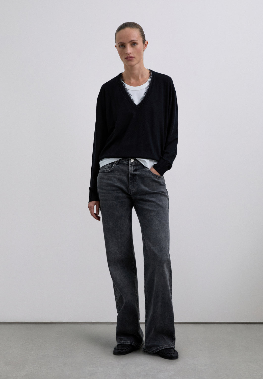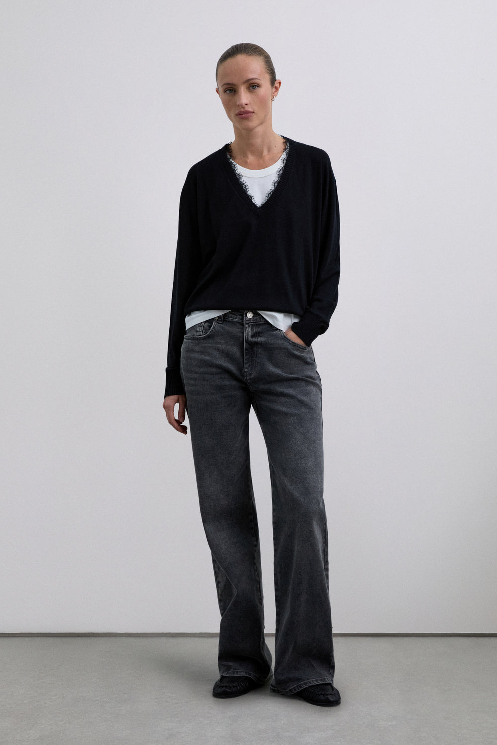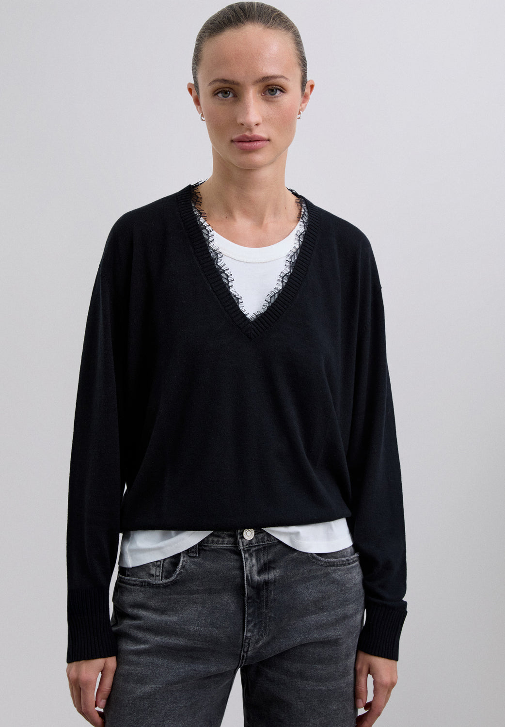 Jersey confeccionado en mezcla de lana y viscosa. Regular fit. Escote en V con detalles de encaje. Manga larga con puños y bajo acabados en rib.