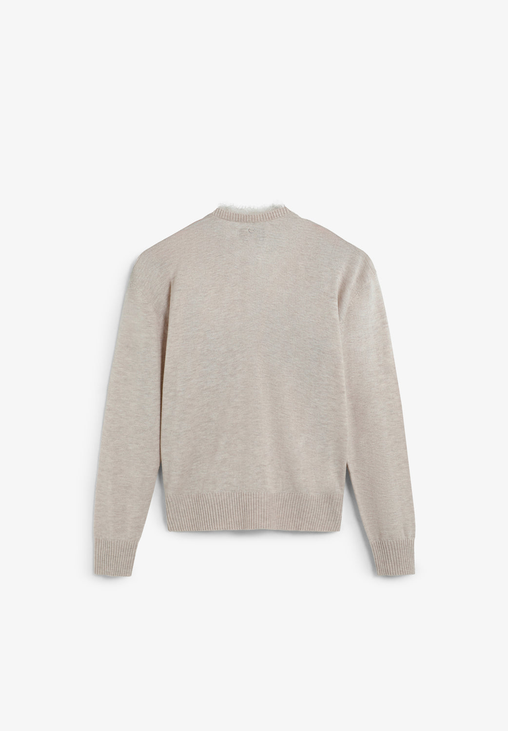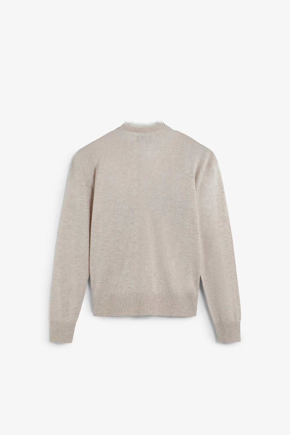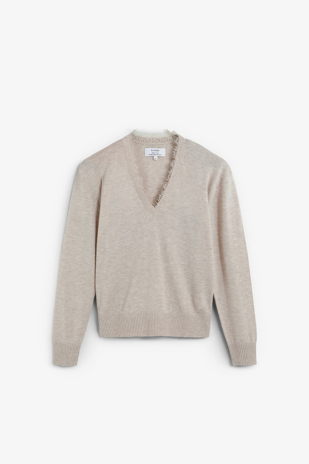 Jersey confeccionado en mezcla de lana y viscosa. Regular fit. Escote en V con detalles de encaje. Manga larga con puños y bajo acabados en rib.