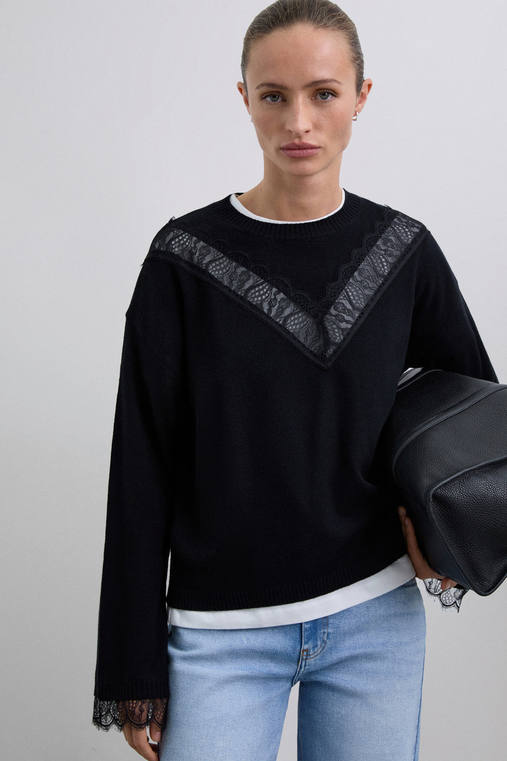 Jersey confeccionado en mezcla de lana y viscosa. Regular fit. Cuello redondo y manga larga con acabados en rib. Detalles de encaje en pecho y bajo de las mangas.
