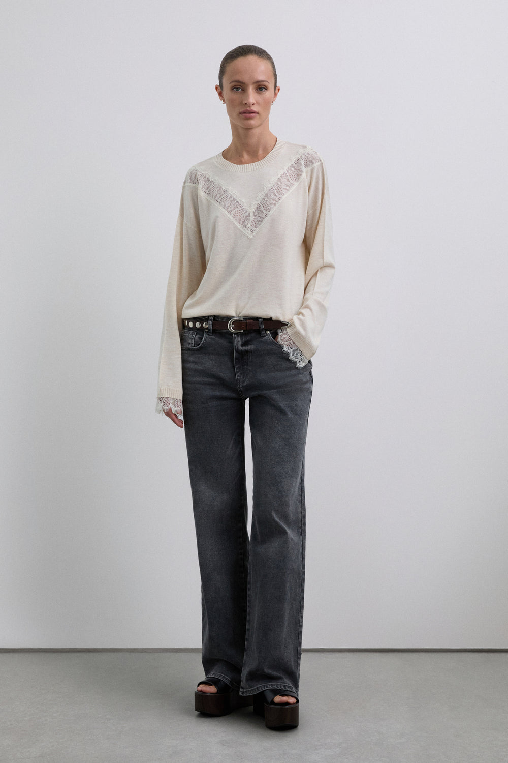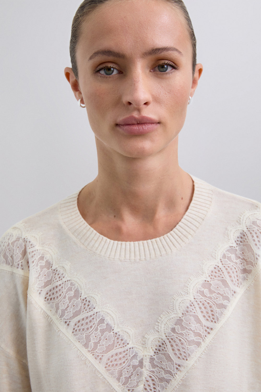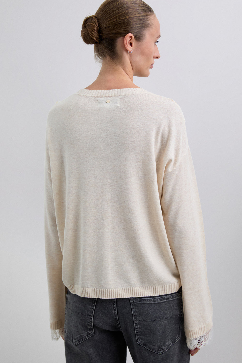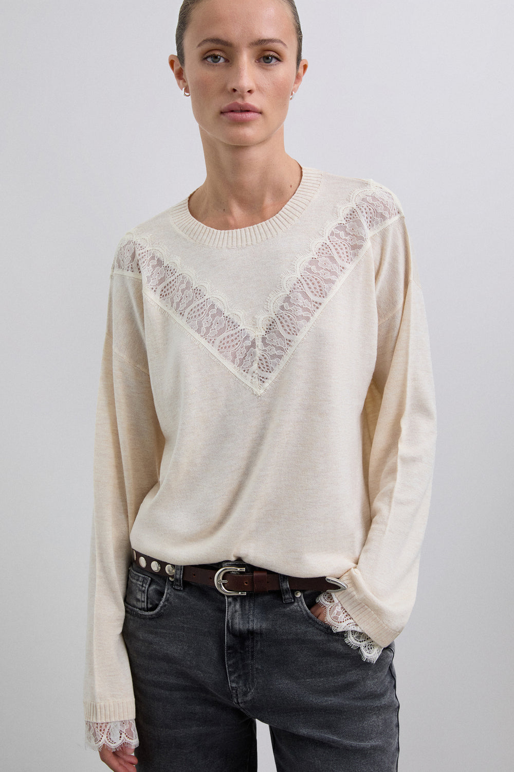 Jersey confeccionado en mezcla de lana y viscosa. Regular fit. Cuello redondo y manga larga con acabados en rib. Detalles de encaje en pecho y bajo de las mangas.