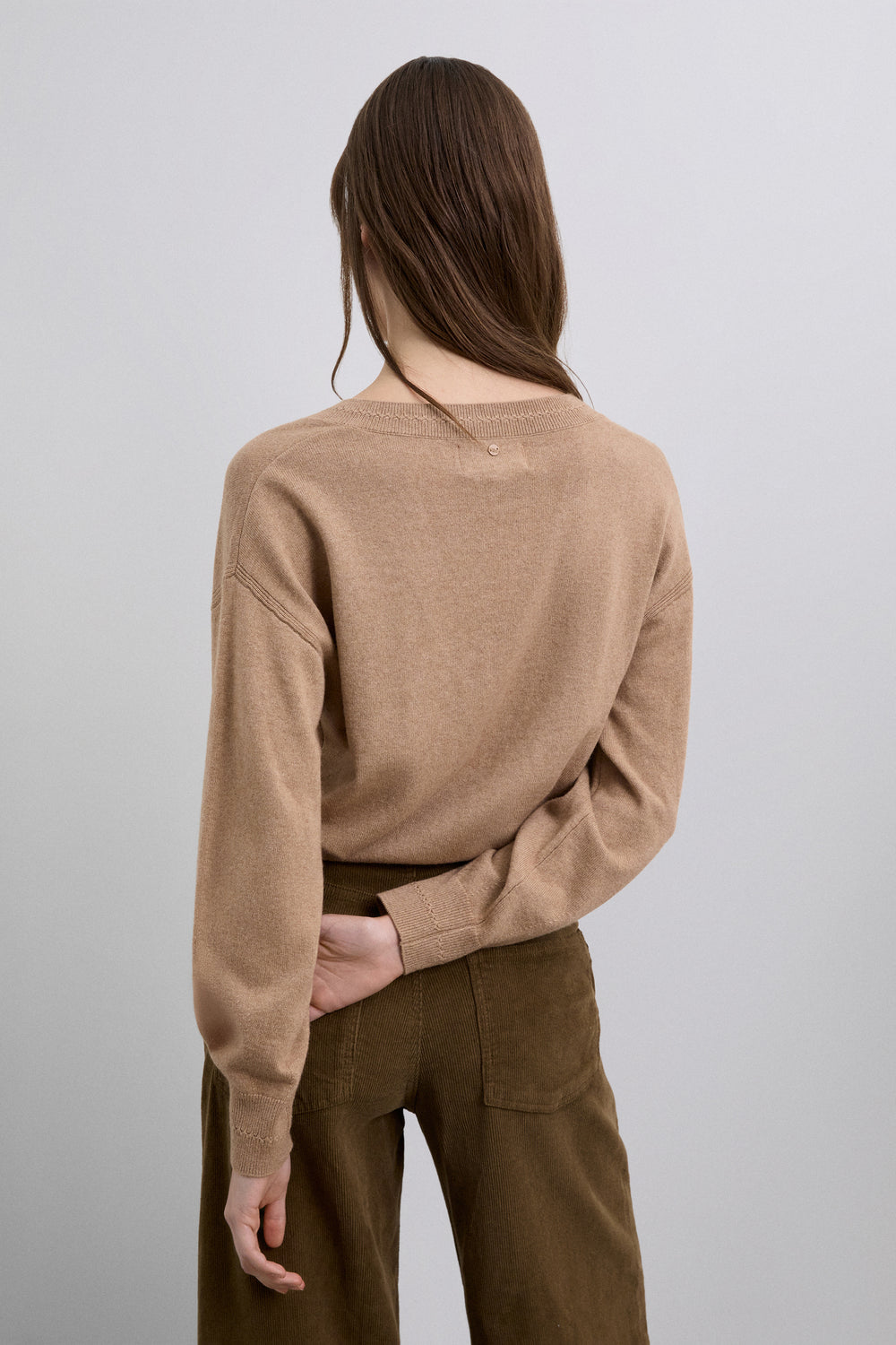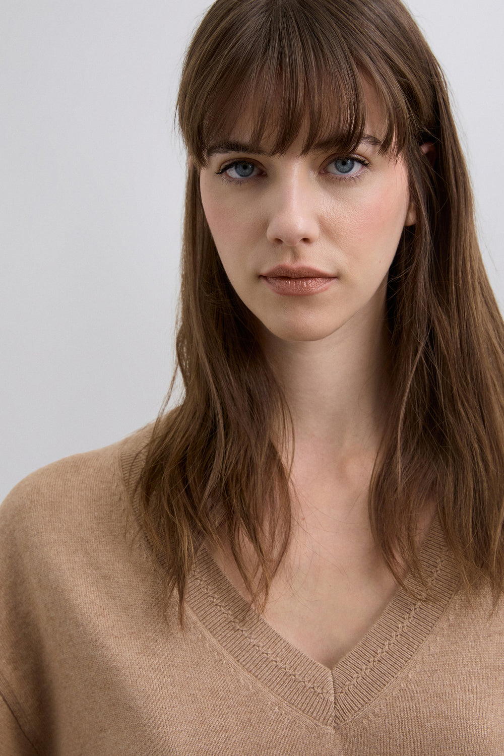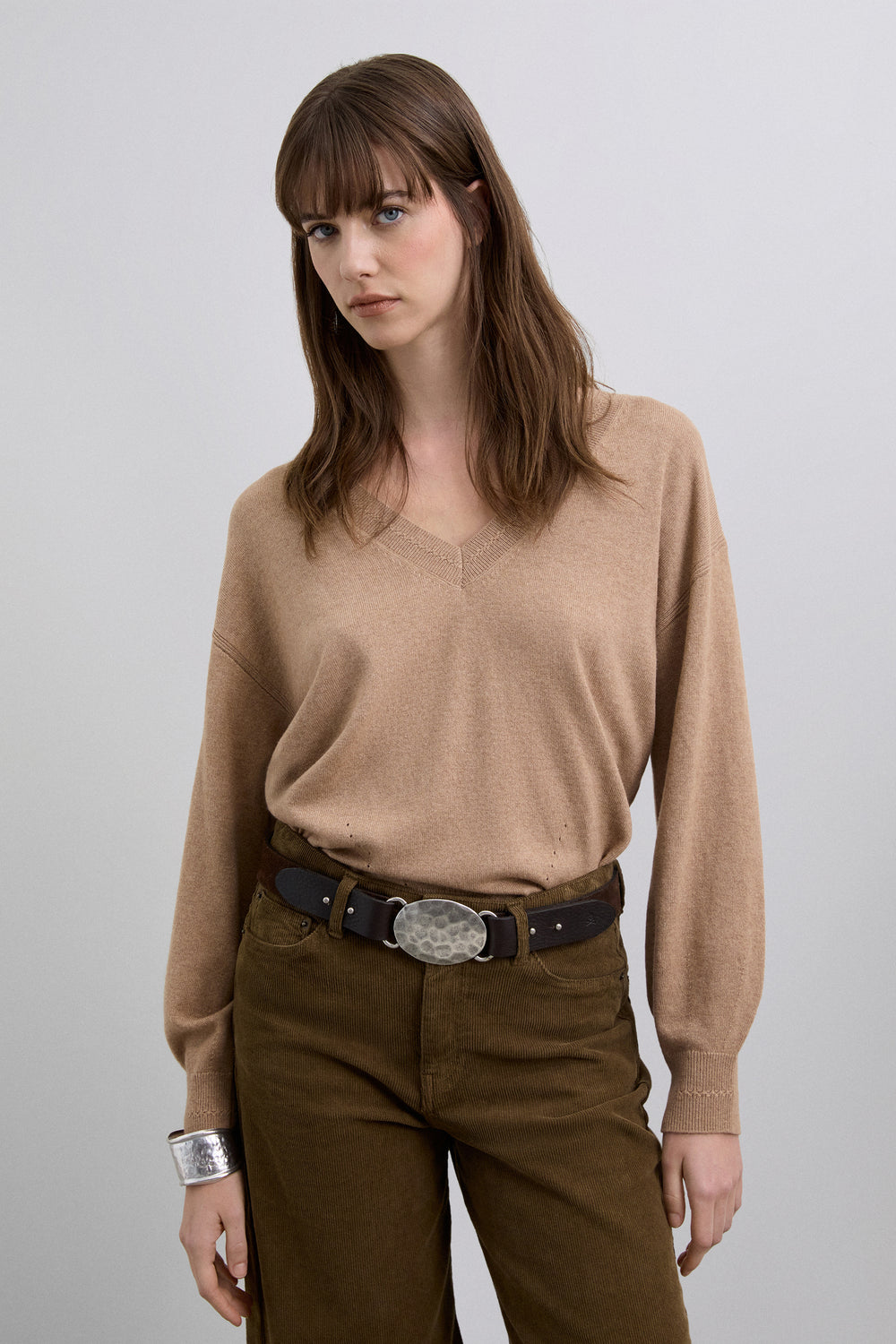Jersey confeccionado en mezcla de lana. Escote en V con un ajuste ligeramente holgado. detalles de mini aberturas circulares en el bajo. Acabados en rib en escote, mangas y cintura.