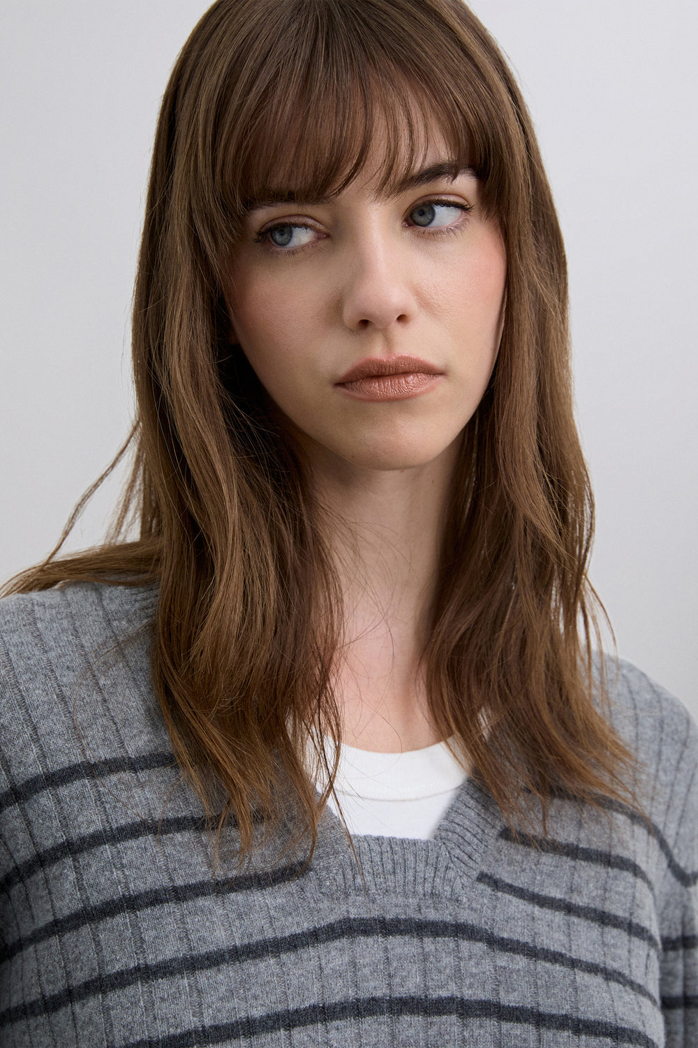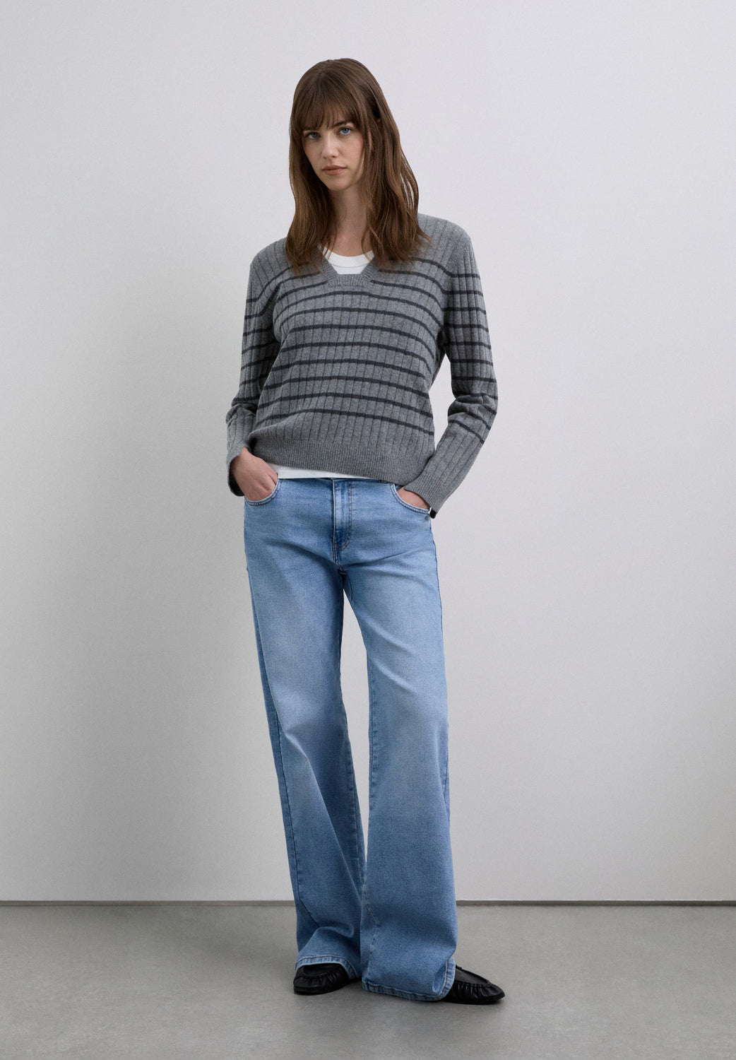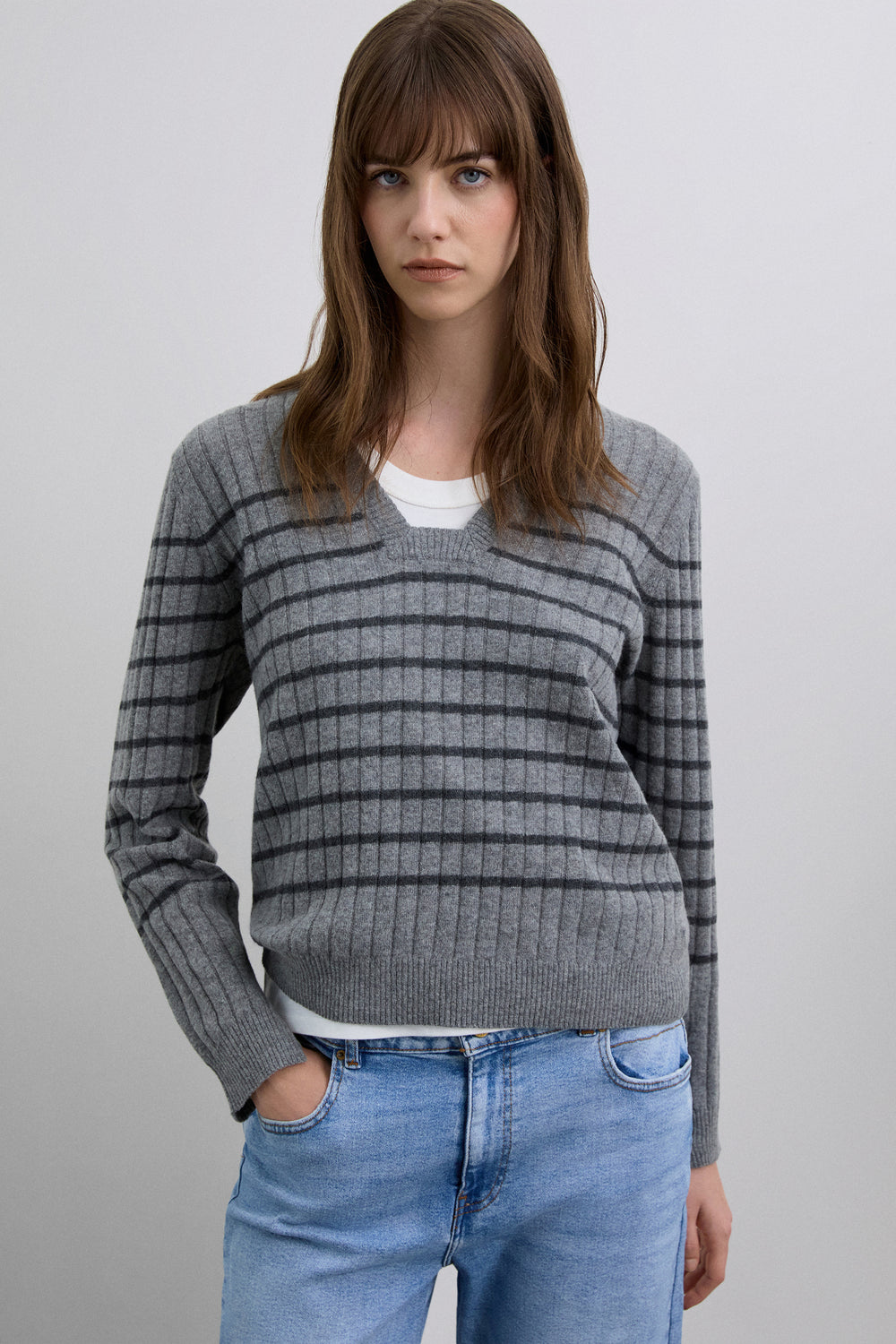 Jersey confeccionado en mezcla con lana con rib y estampado de rayas. Regular fit, escote en V ligeramente cuadrado. Manga larga.