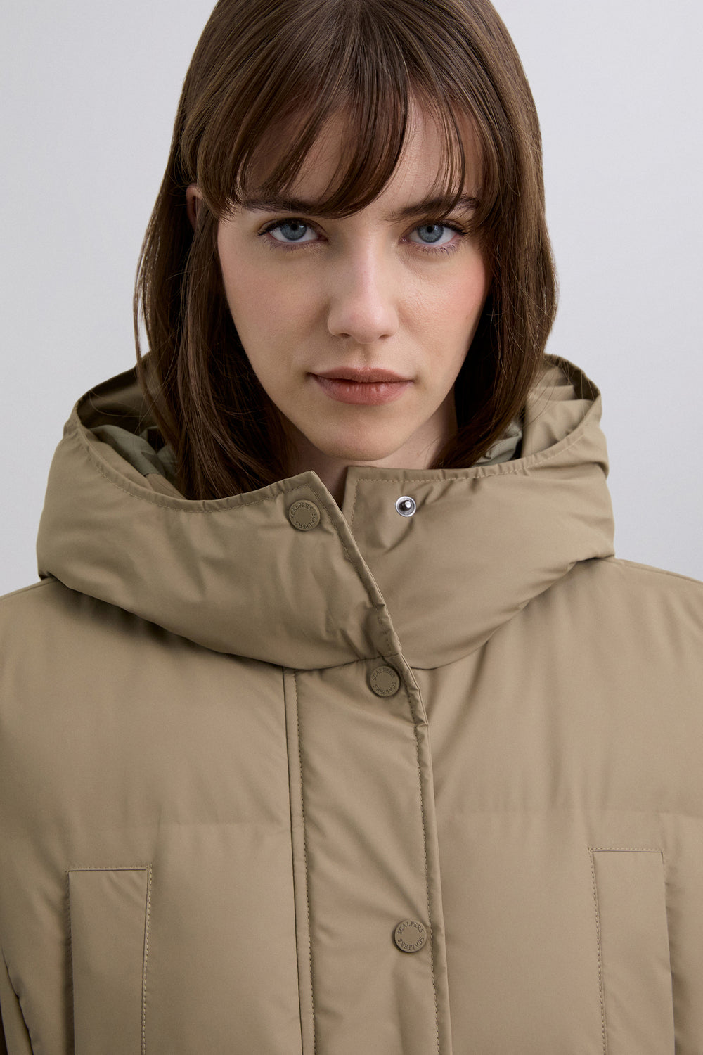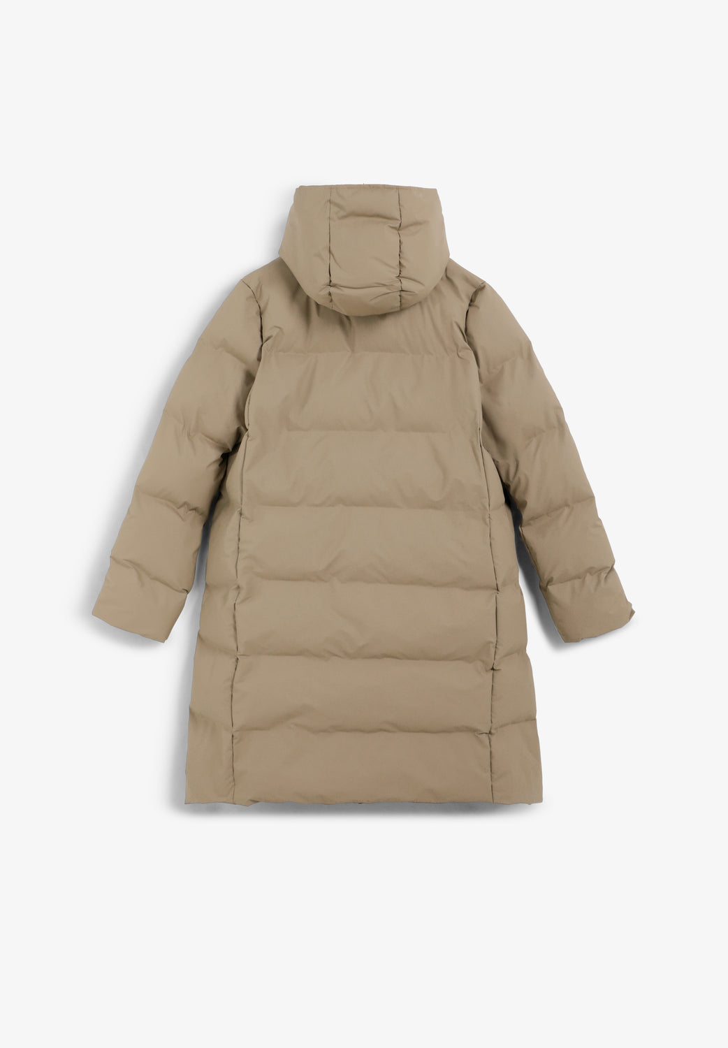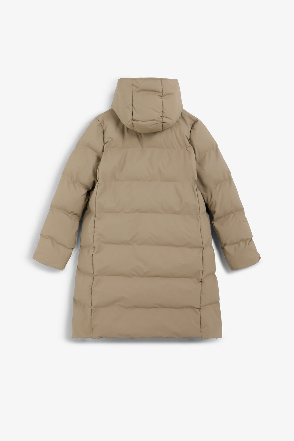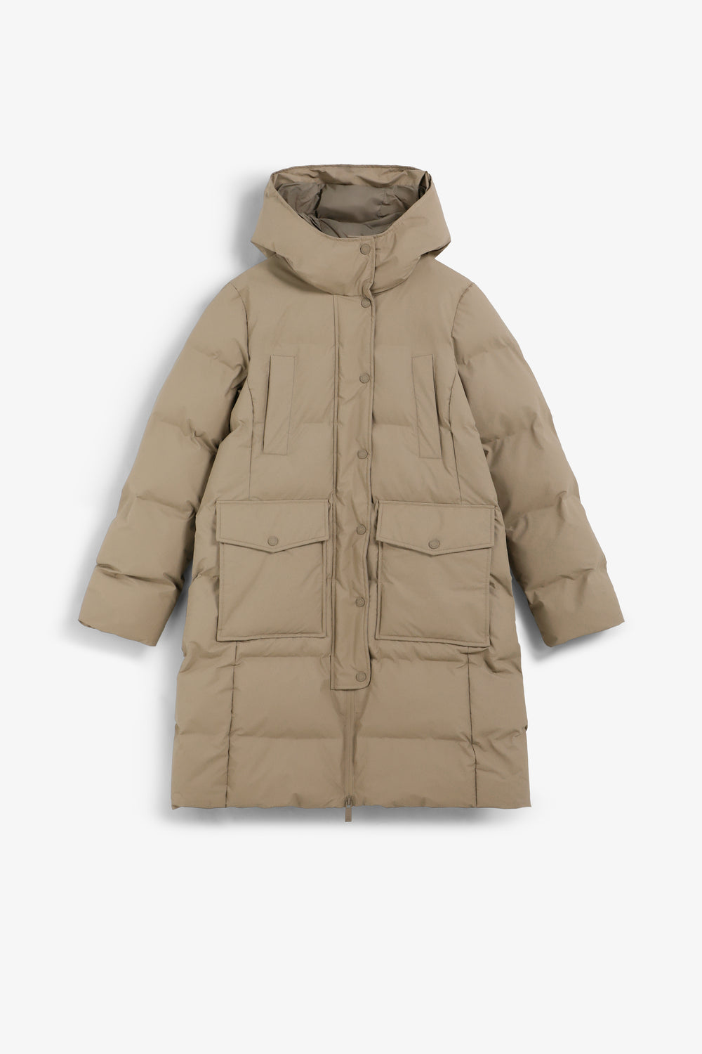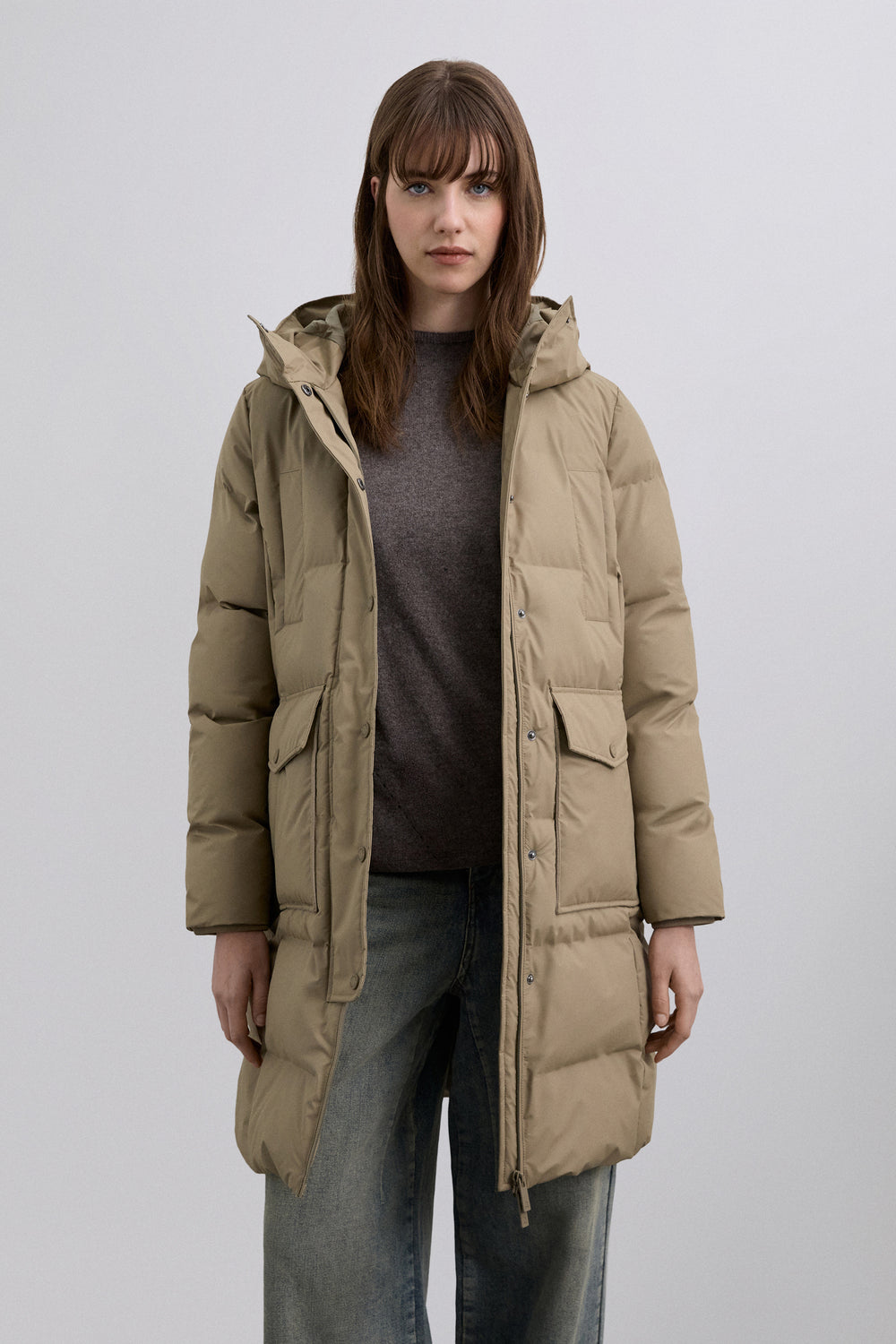 Chaquetón largo acolchado de nylon. Impermeable. Capucha. Cierre mediante cremallera oculta en tapeta. Bolsillos verticales en pecho. Bolsillos frontales en parte inferior.