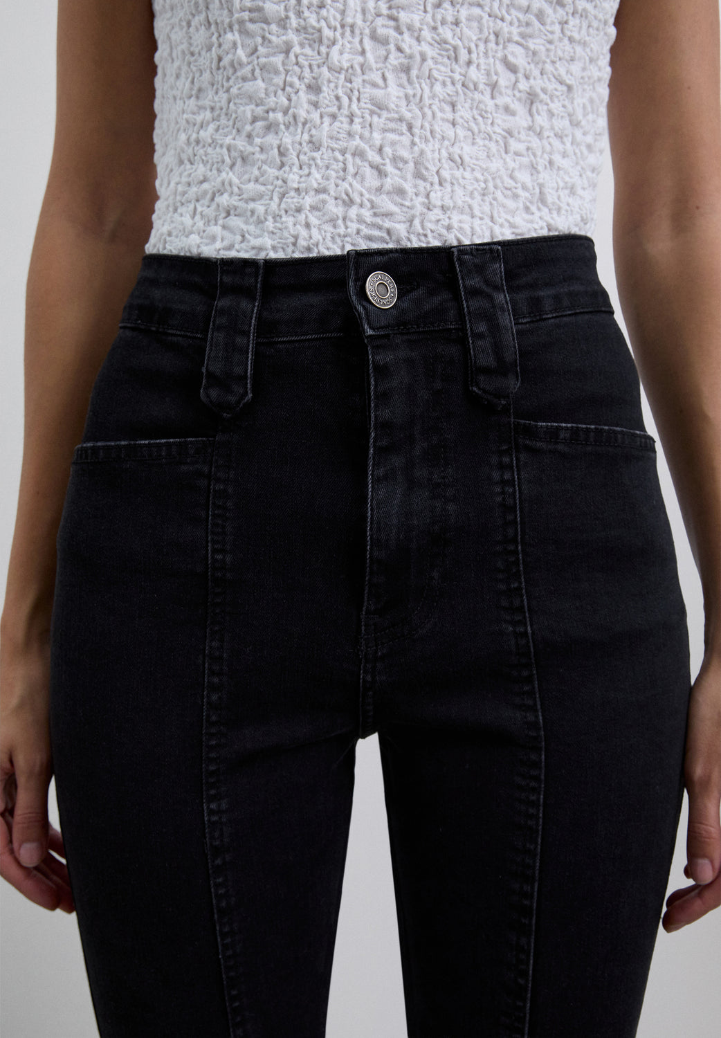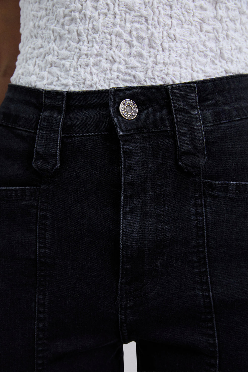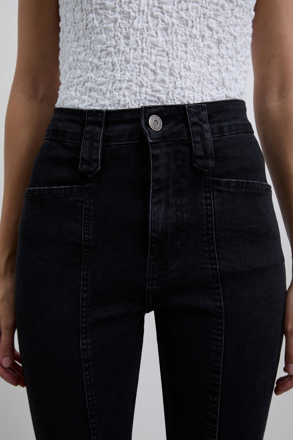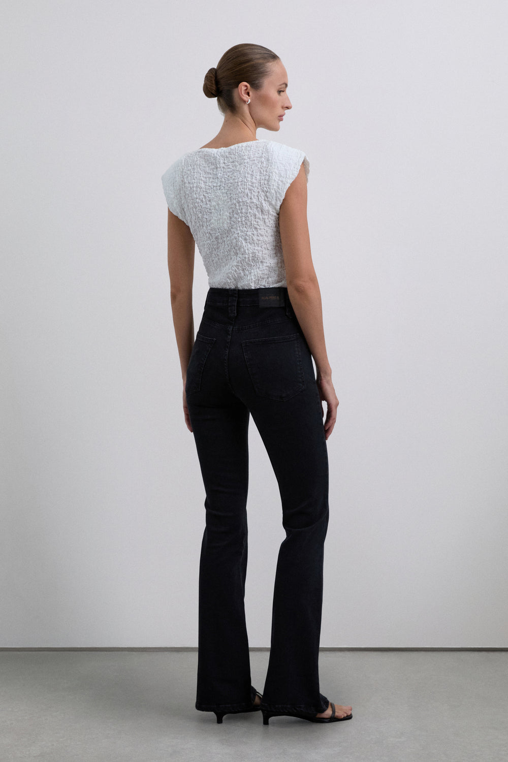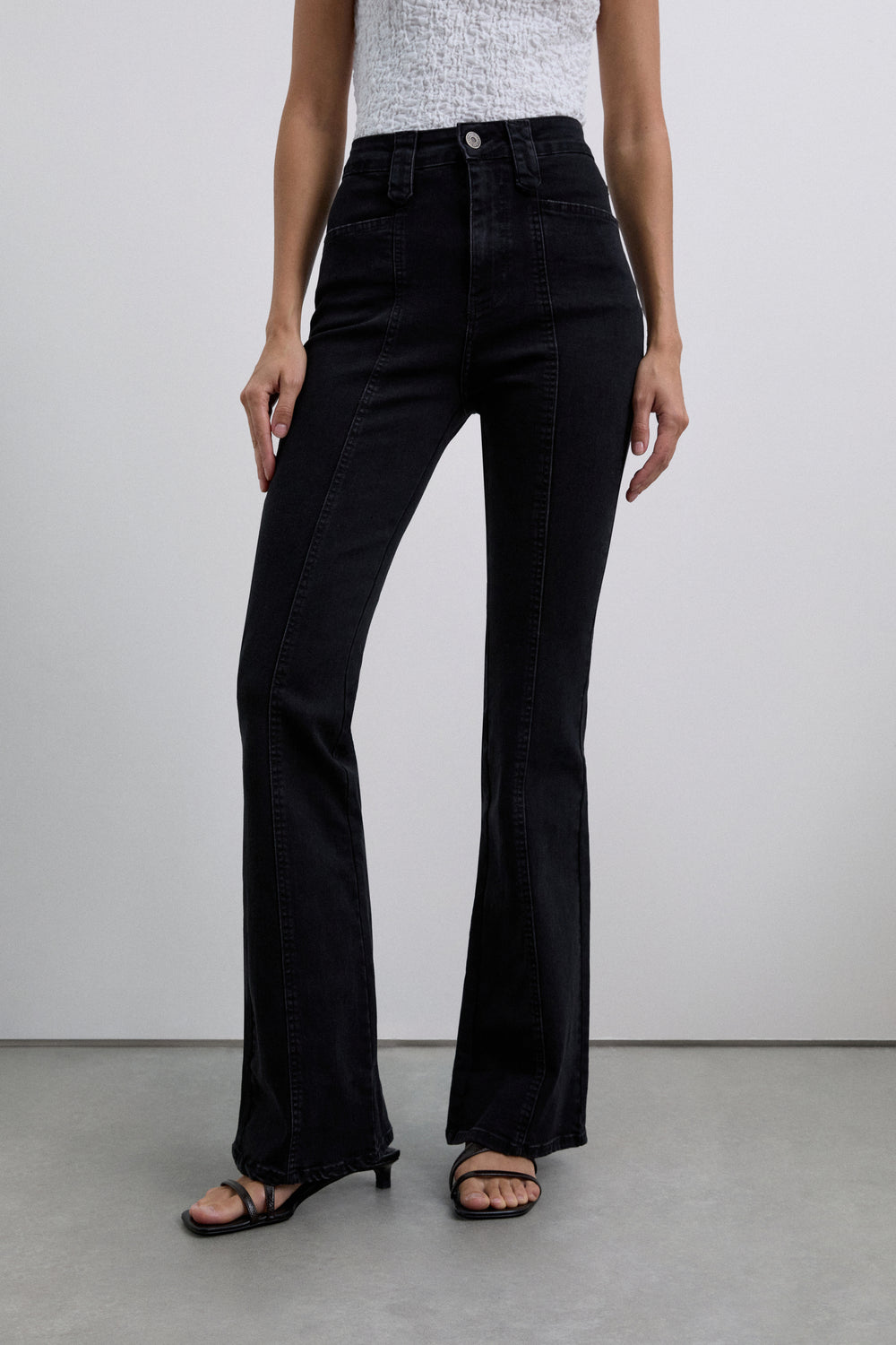 Pantalones denim de corte bootcut de cintura alta. Costura central en la parte delantera. Bolsillos delanteros y traseros. Cierre mediante botón y trabillas en cintura. Detalle logo en etiqueta parte trasera.
