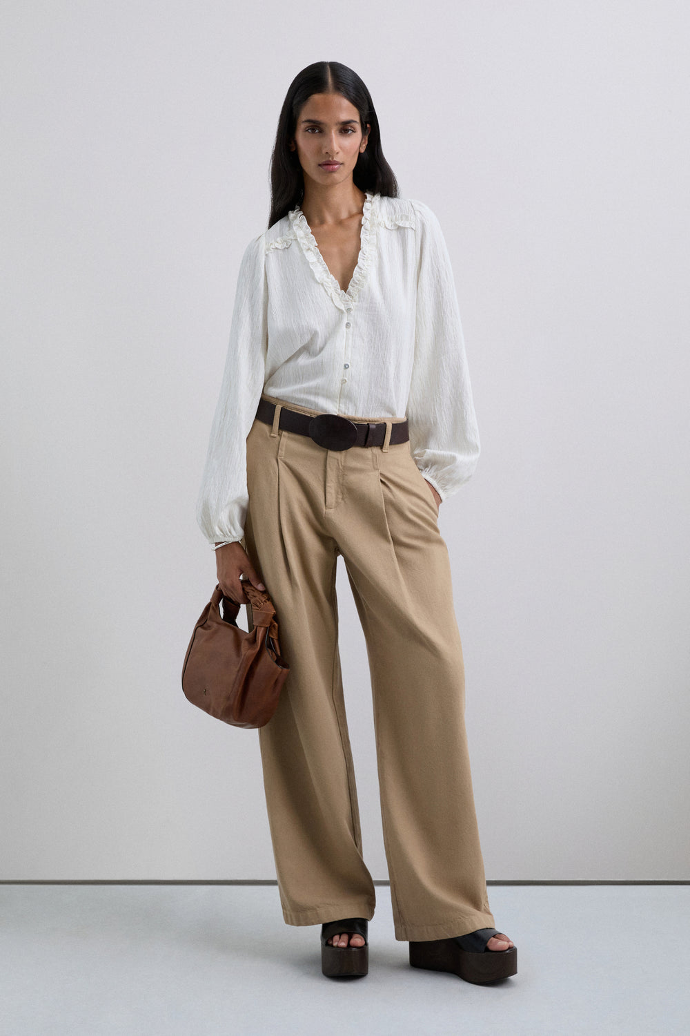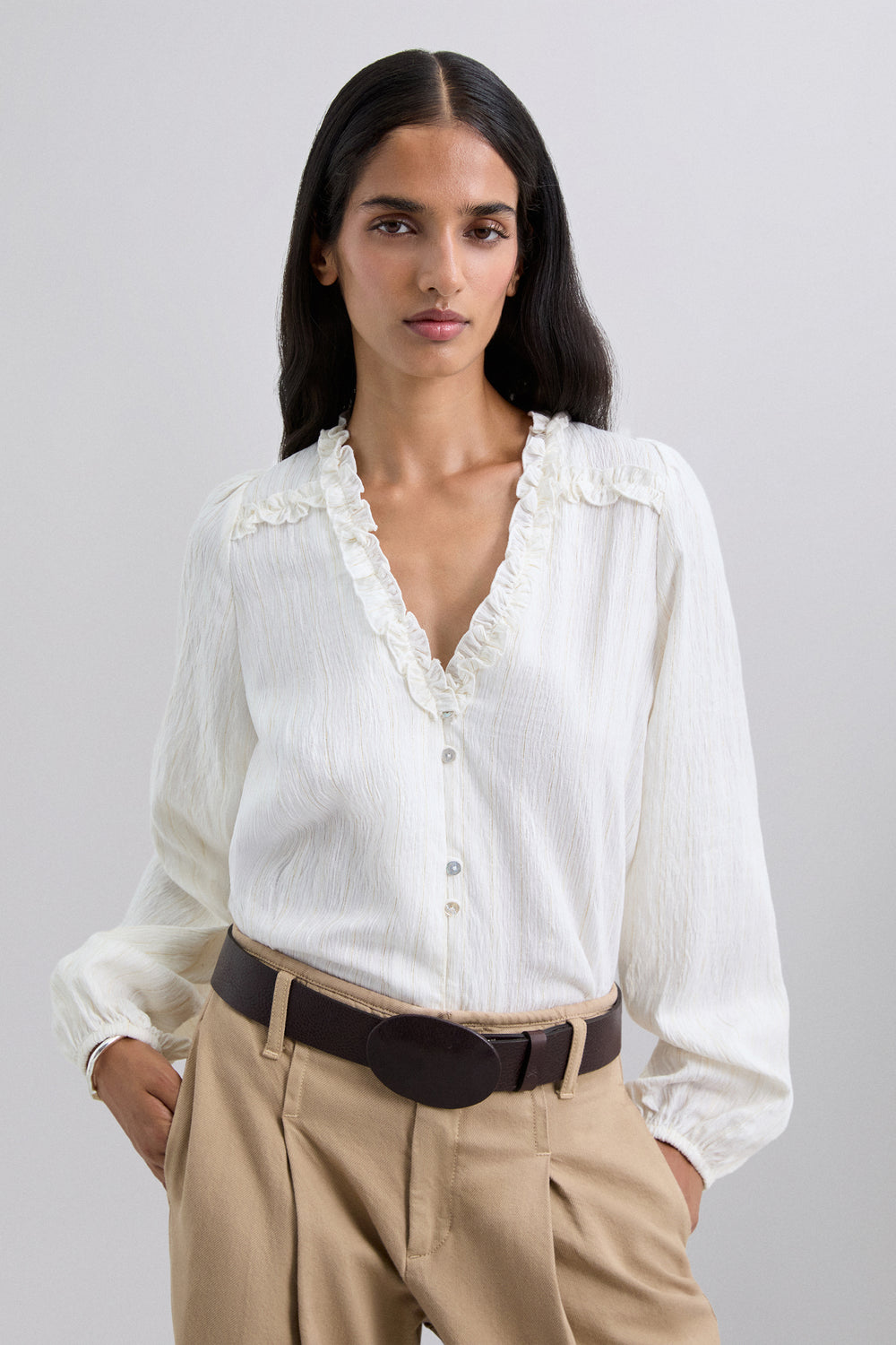 Blusa confeccionada en tejido fluido con detalles de hilo metalizado. Corte regular fit, escote en V con detalles fruncidos en cuello y hombros. Manga larga abullonada acabada en puño. Cierre mediante botones frontales.
