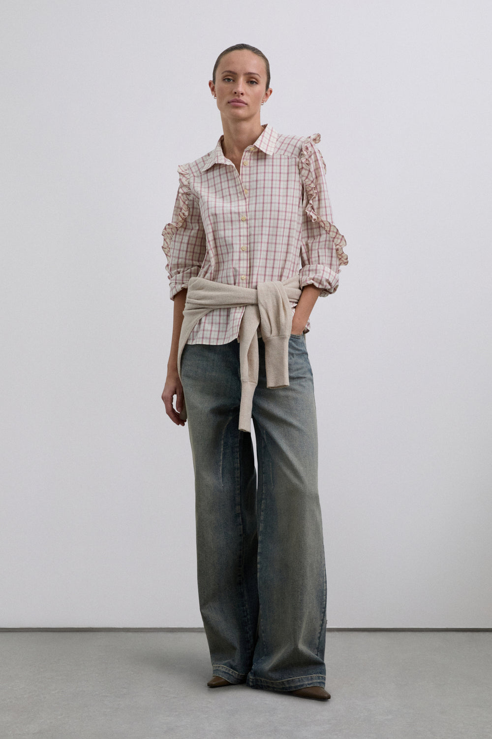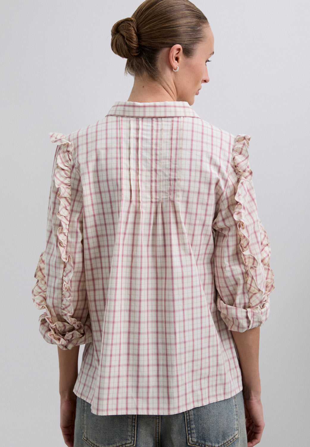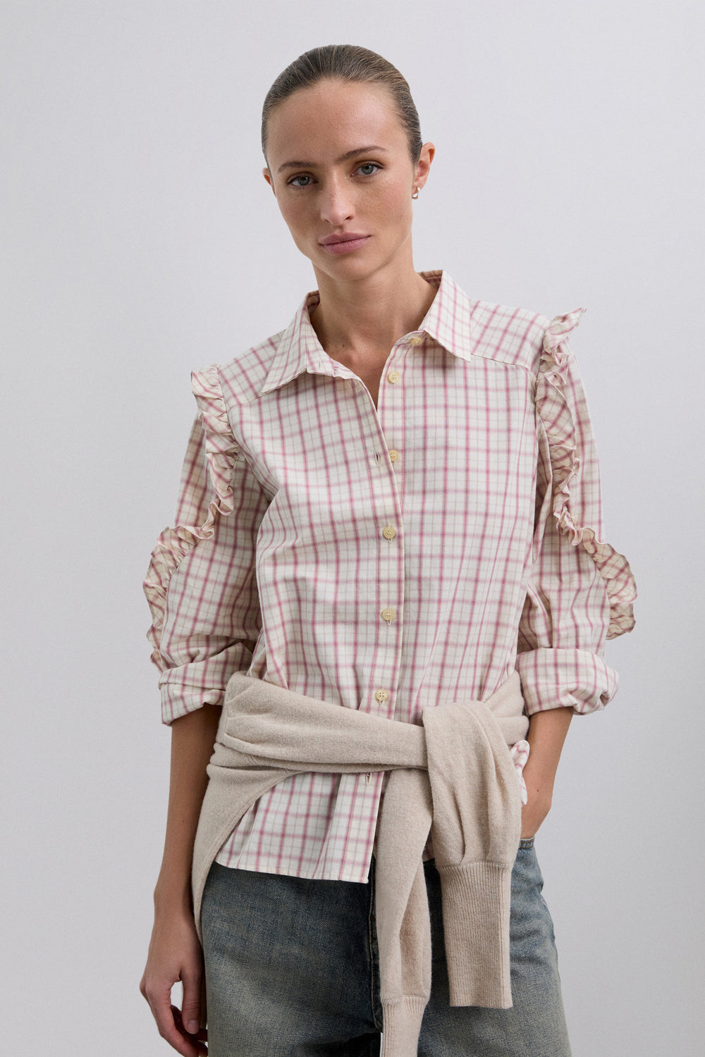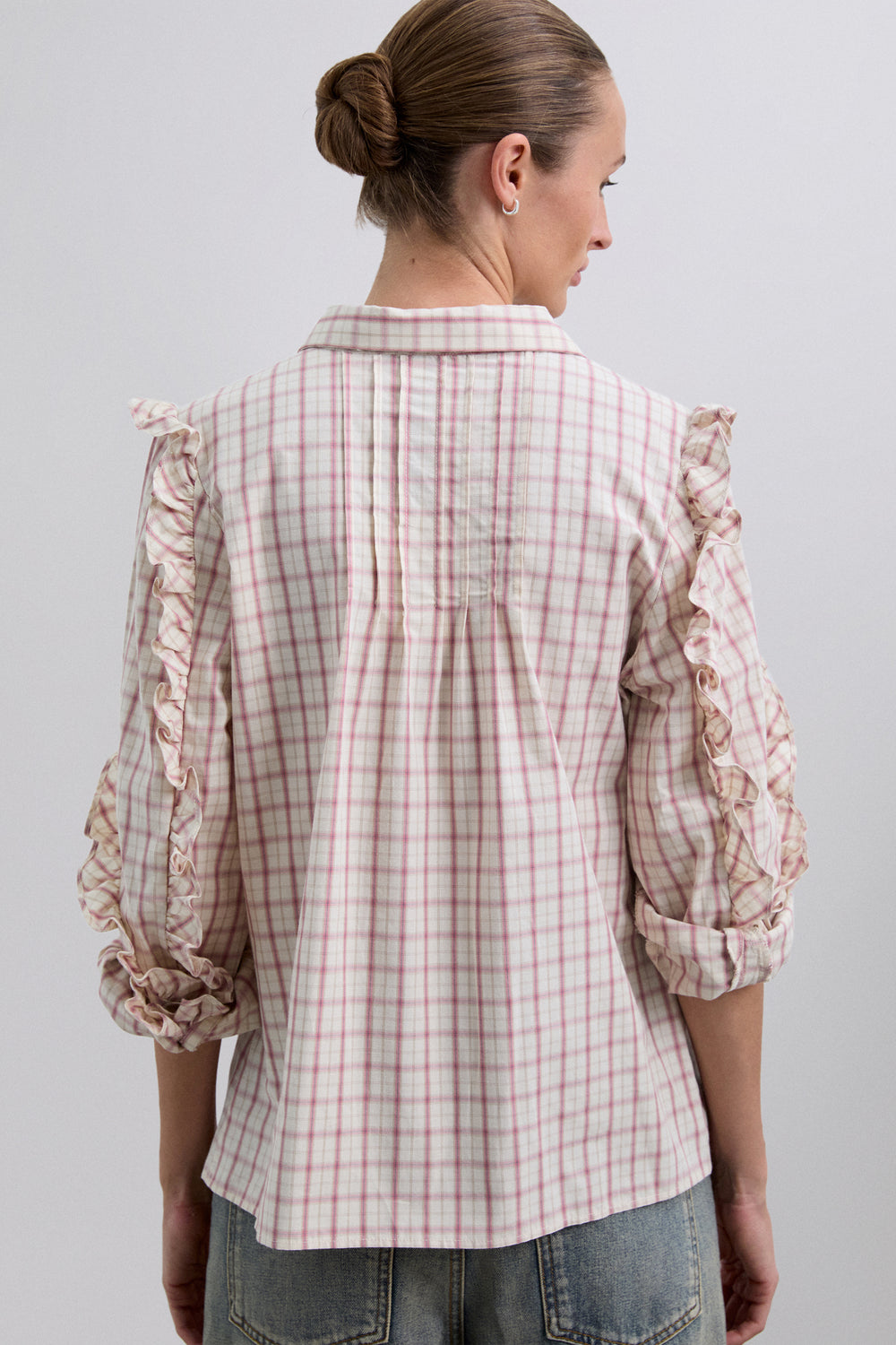 Camisa confeccionada en 100% algodón con estampado de cuadros. Regular fit. Cuello clásico. Manga larga con detalles de frunces y acabadas en puño con botón. Cierre mediante botones.