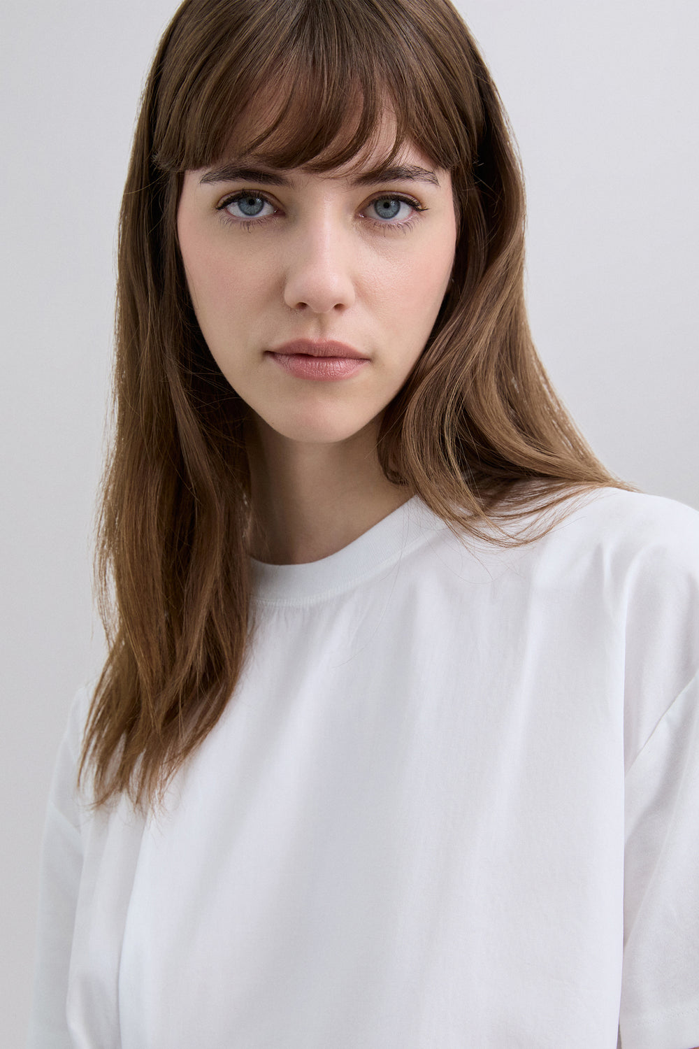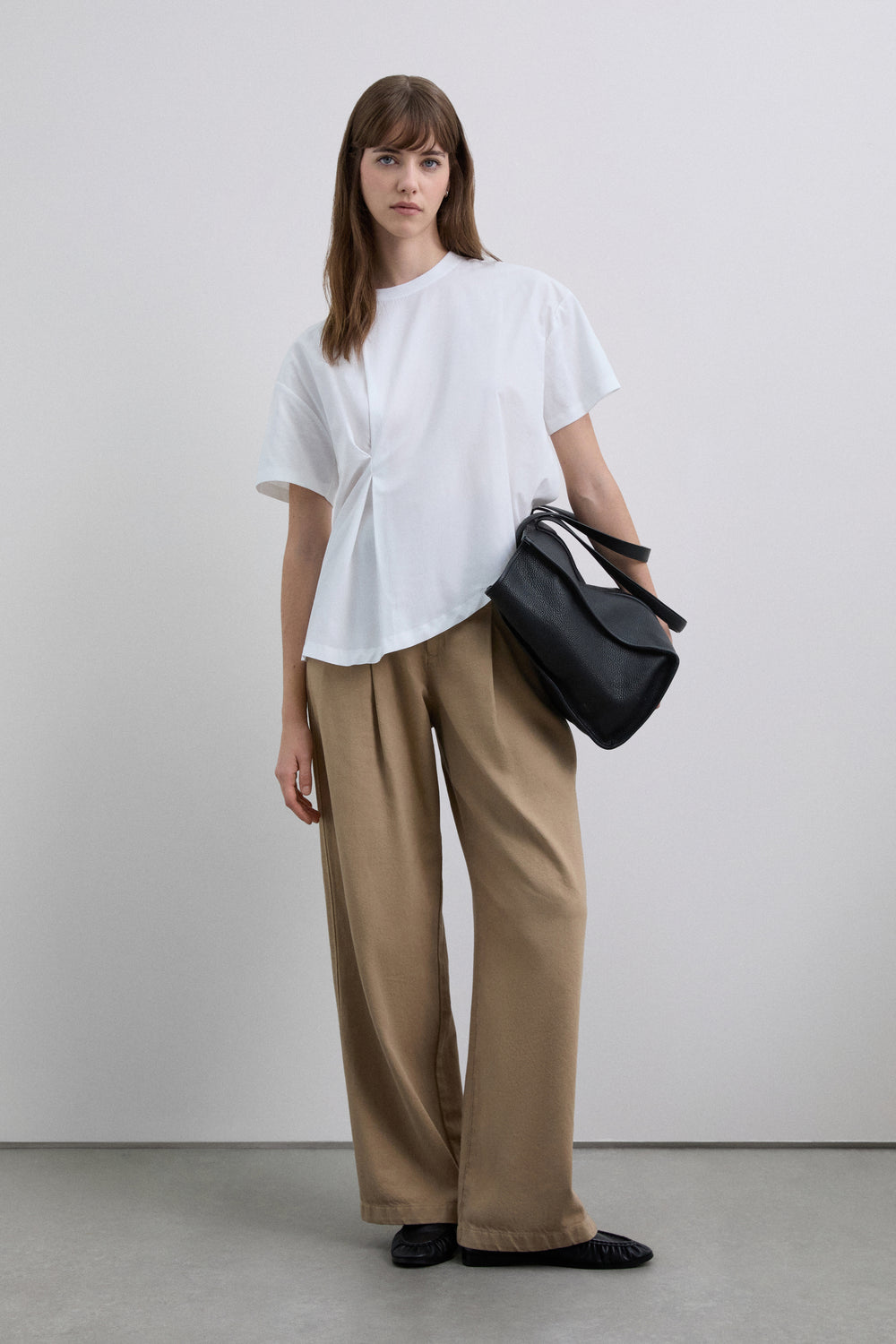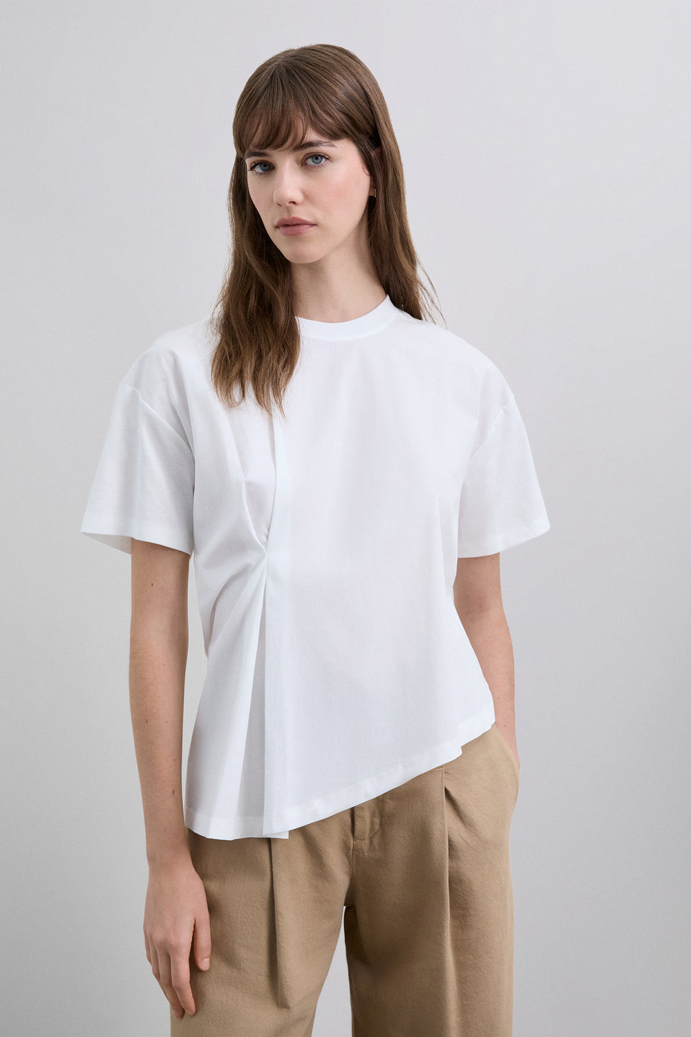 Camiseta de manga corta con diseño asimétrico confeccionada en 100% algodón BCI. Presenta cuello redondo y un panel frontal superpuesto que crea un efecto drapeado lateral. Cierre en la parte posterior con pequeña abertura.