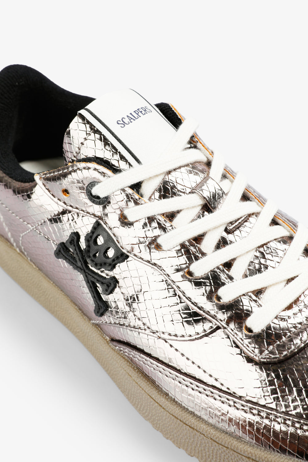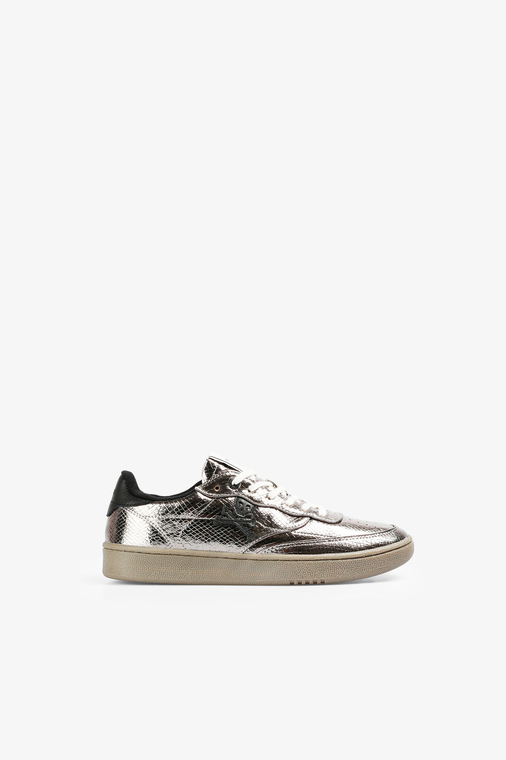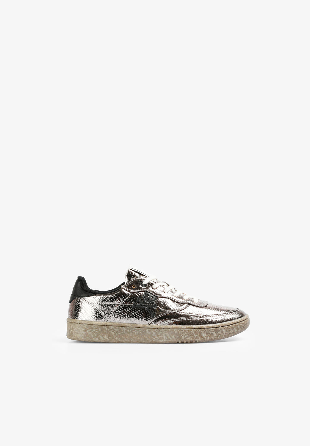 Zapatillas con acabado metalizado en textura serpiente y detalles en contraste. Cordones en blanco y calavera a contraste.