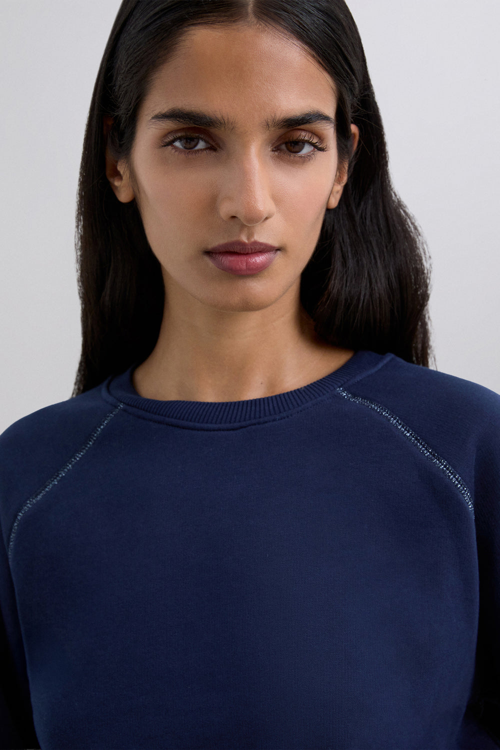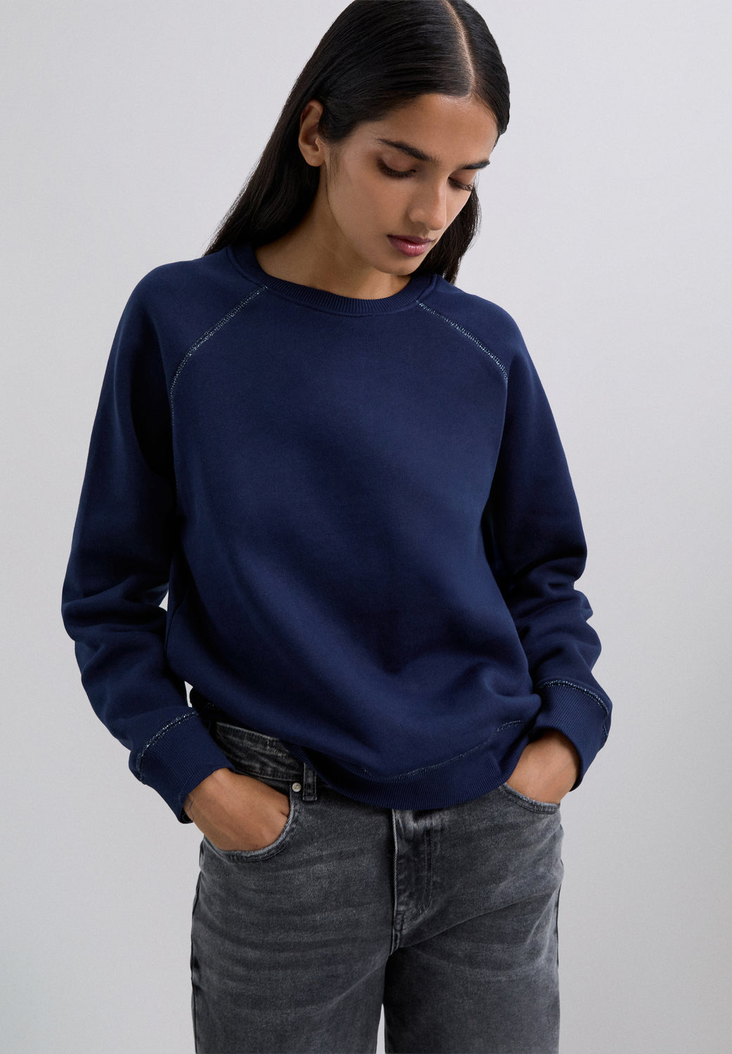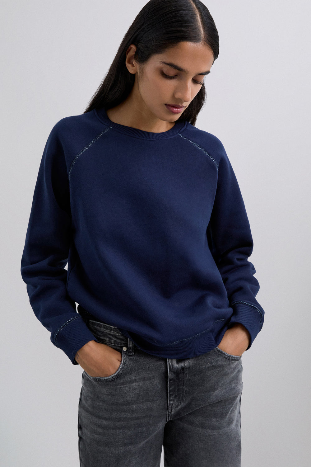Sudadera confeccionada en algodón BCI con elastano. Corte regular fit, cuello redondo y manga larga con puños acabados en rib. Detalle de logo bordado en vertical en parte trasera.