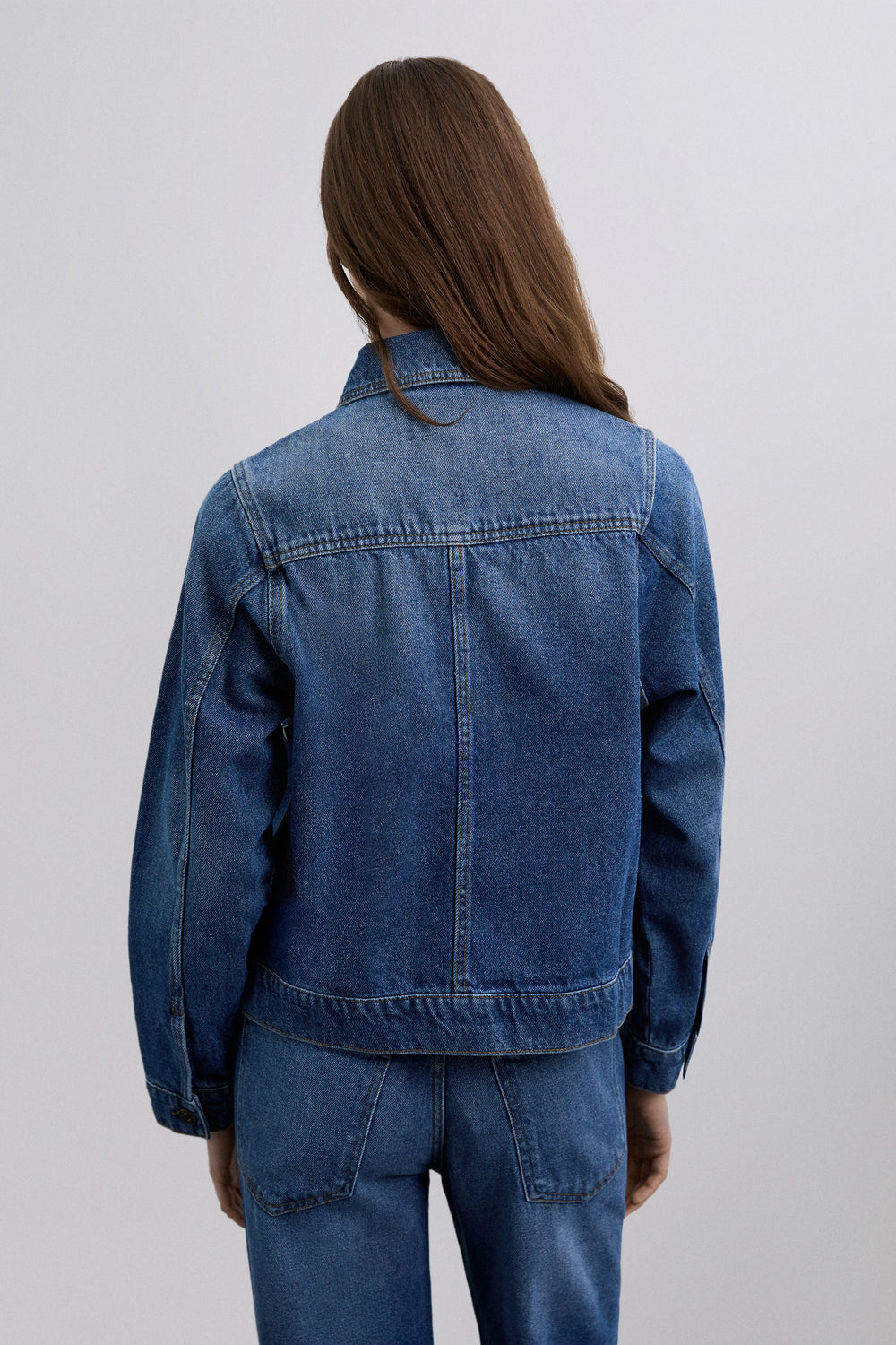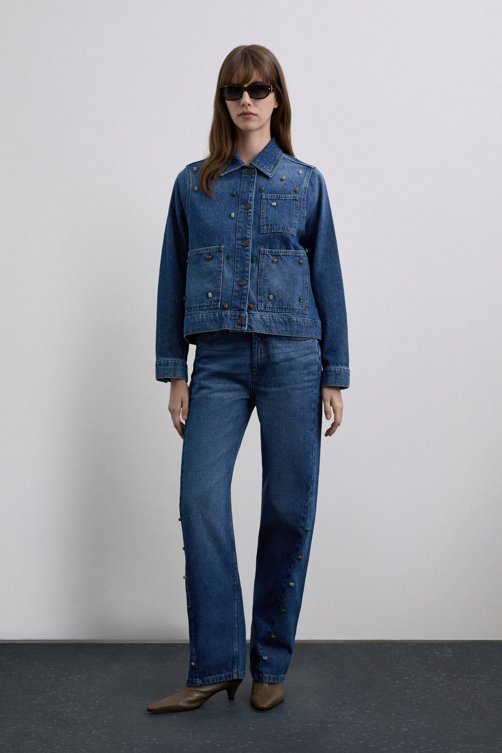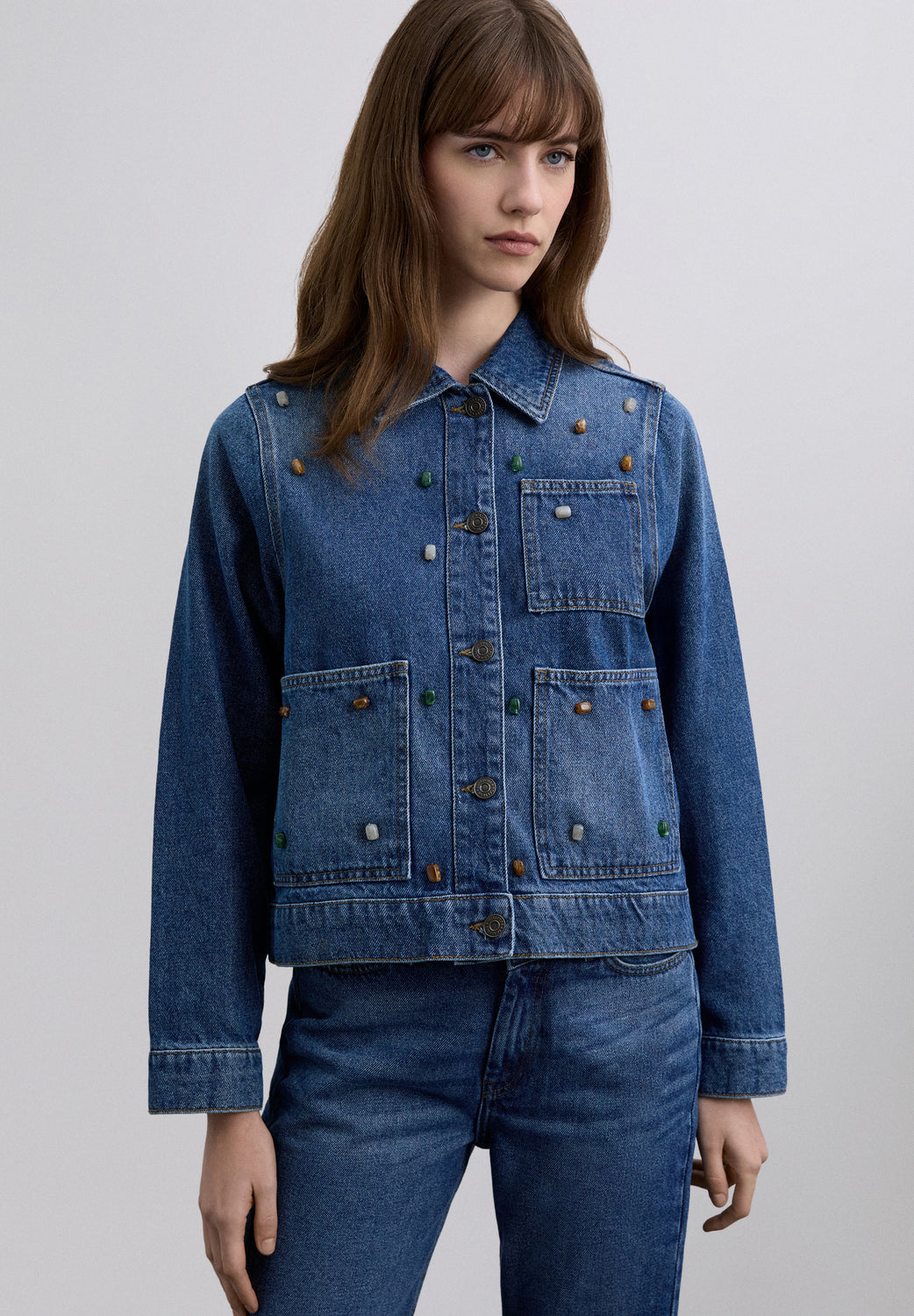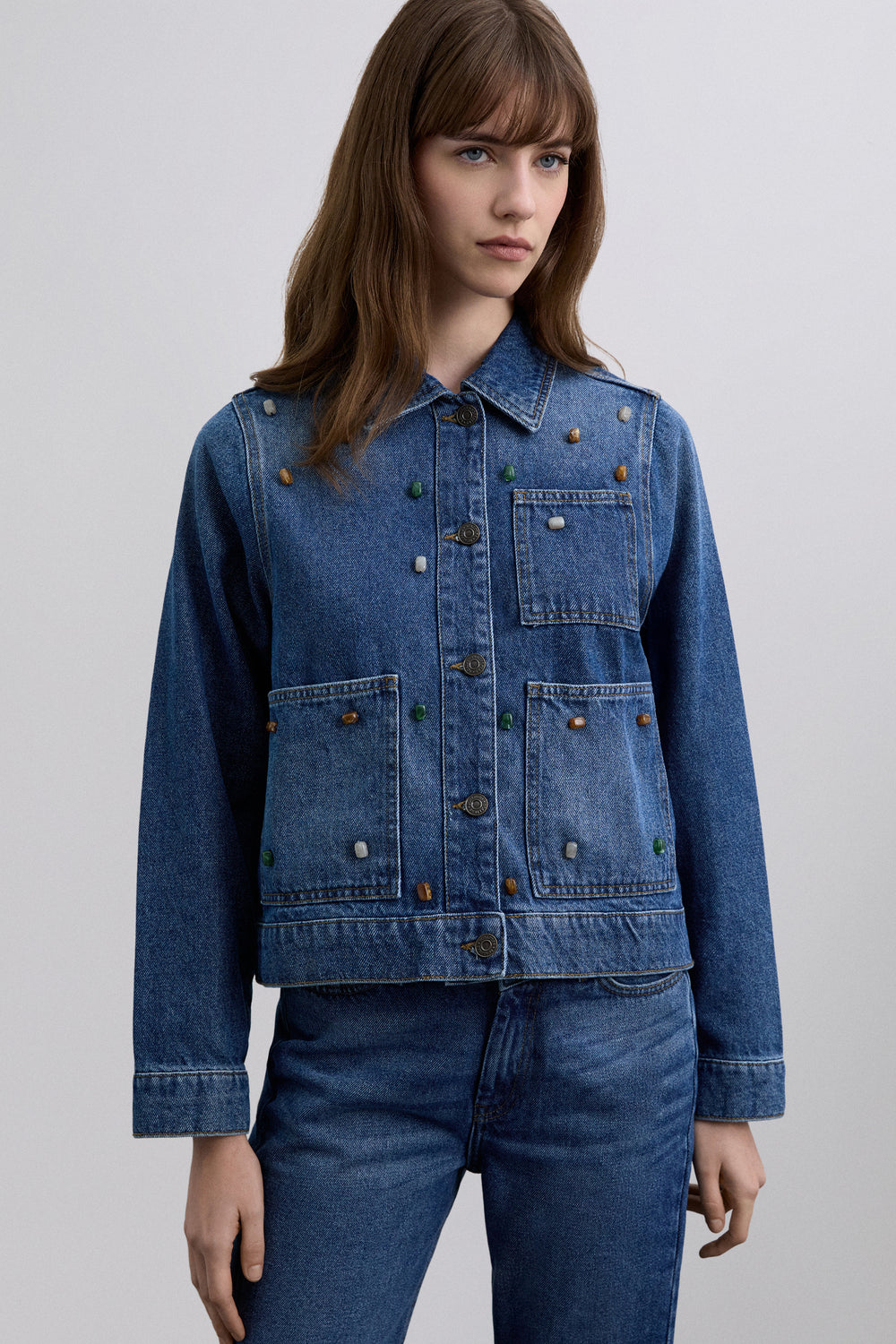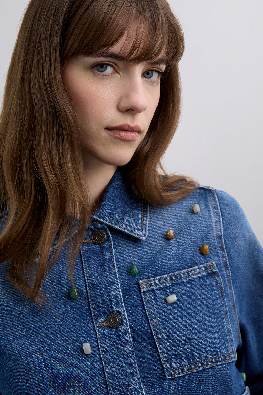 Chaqueta denim confeccionada en algodón BCI 100%. Chaqueta con cuello y mangas largas terminadas en puños. Bolsillos de plastrón en el pecho. Bordado con pedrería en la parte delantera. Cierre con botones metálicos.