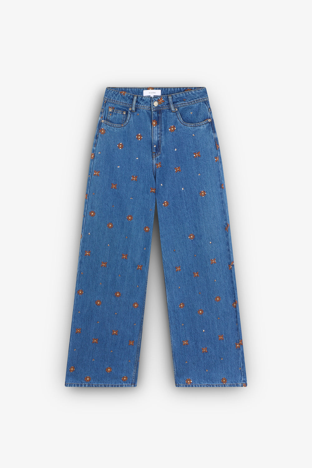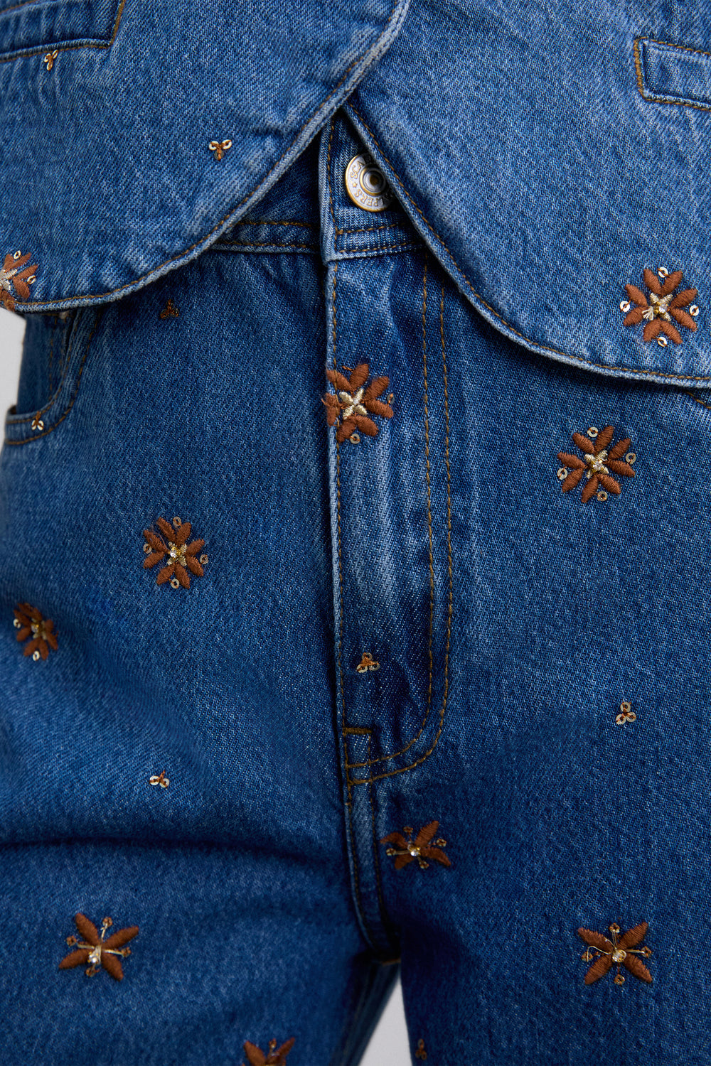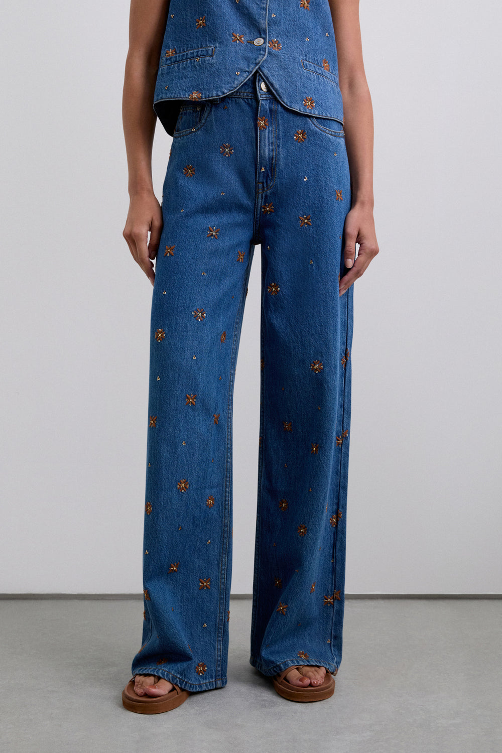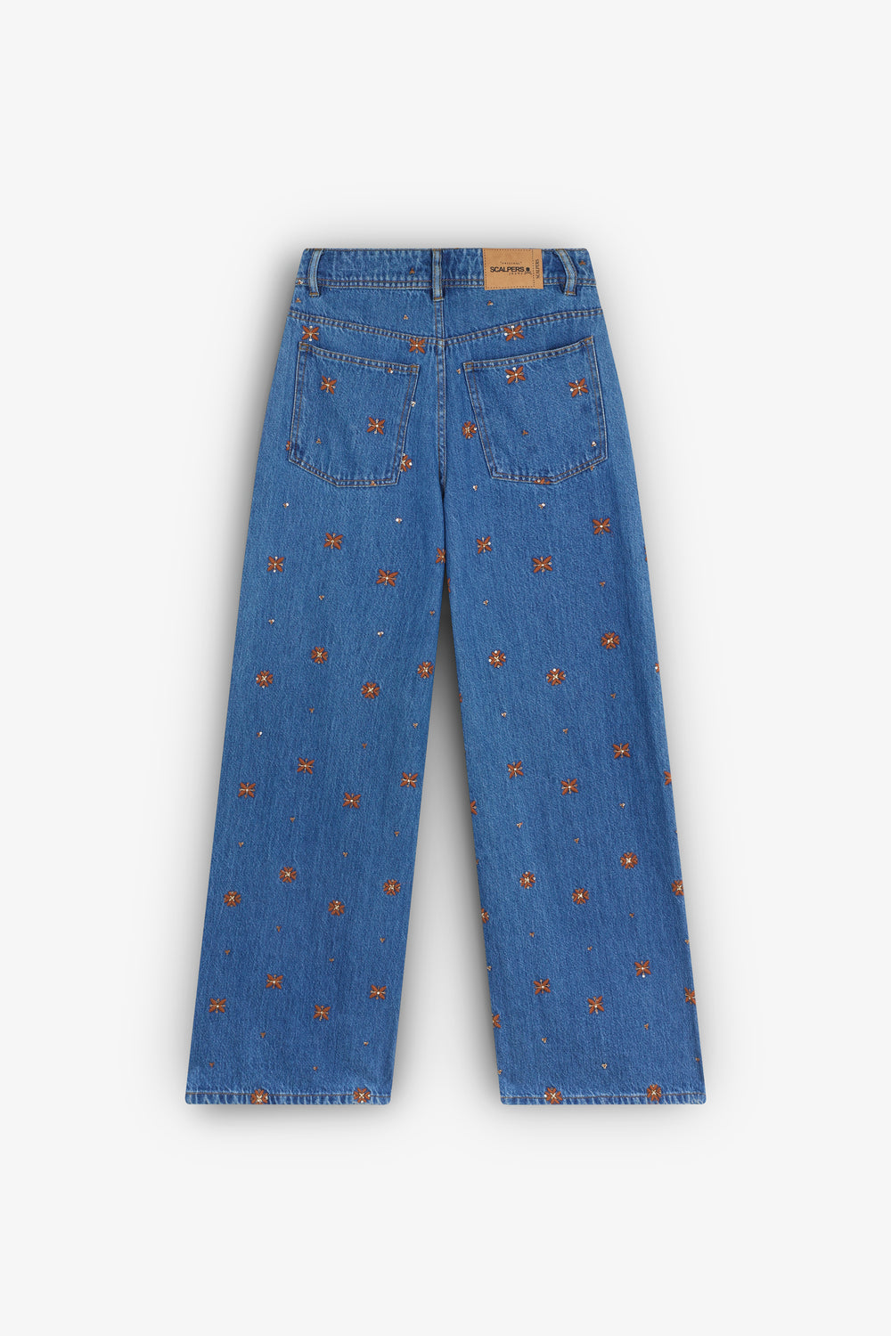 Pantalón recto denim de cintura alta. Detalles de flores bordadas. Bolsillos delanteros y traseros. Cierre mediante botón y trabillas en cintura. Detalle logo en etiqueta parte trasera.