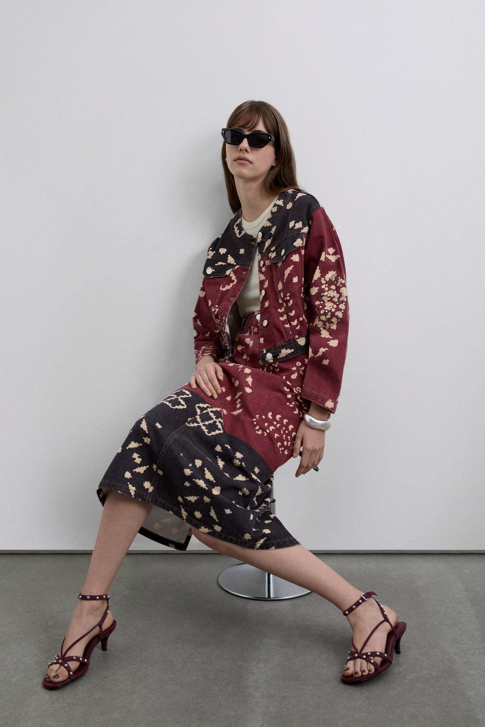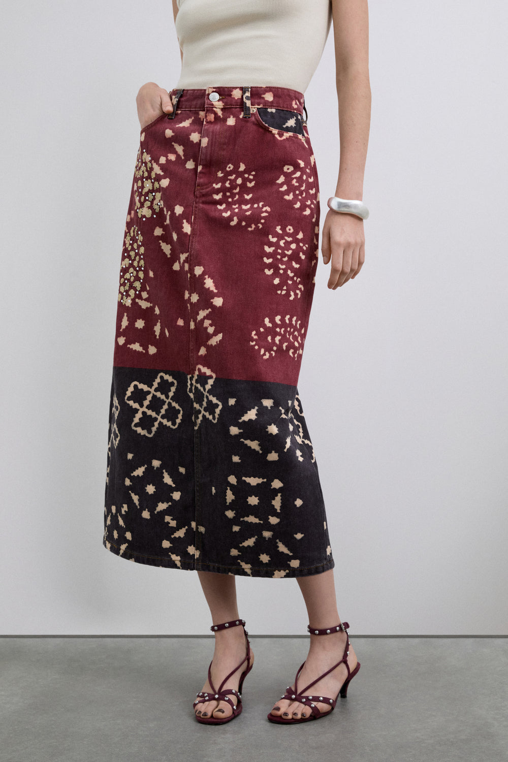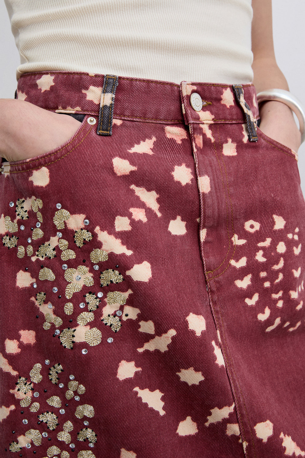 Falda confeccionada en algodón 100% BCI. Talle alto. Bajo recto. Cierre delantero con botón y cremallera. Estampado en color contrastante. Abertura en la parte posterior. Bolsillos en la parte frontal.