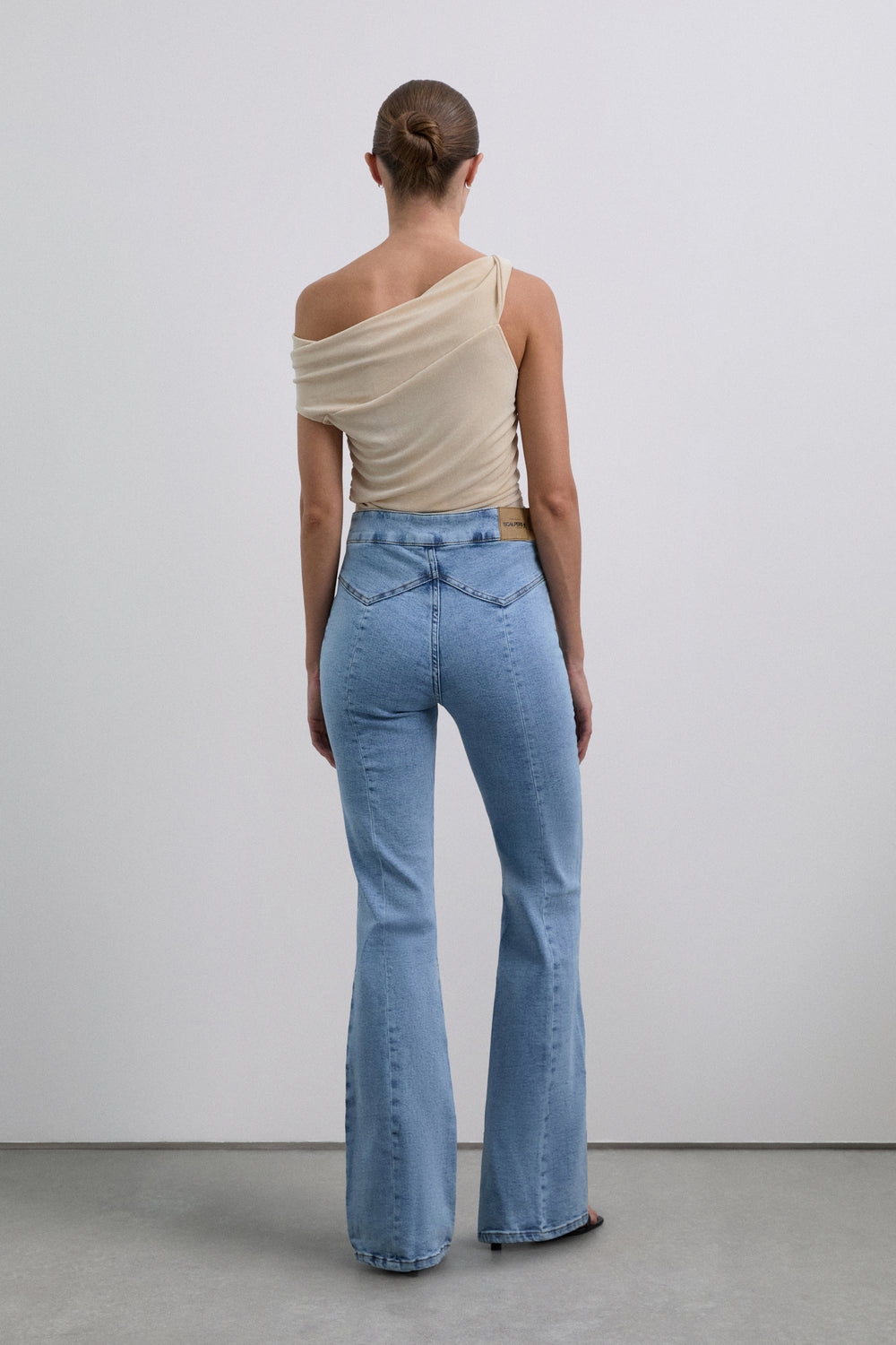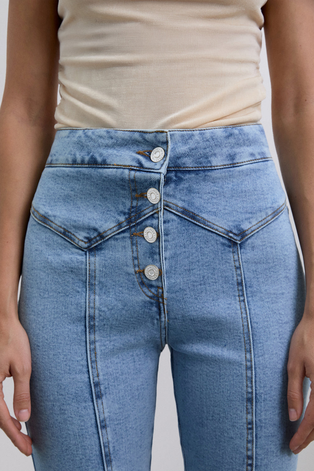 Jeans confeccionados en tejido ligeramente elástico. Slim fit bootcut con tiro alto, cierre con botones y costuras marcadas.