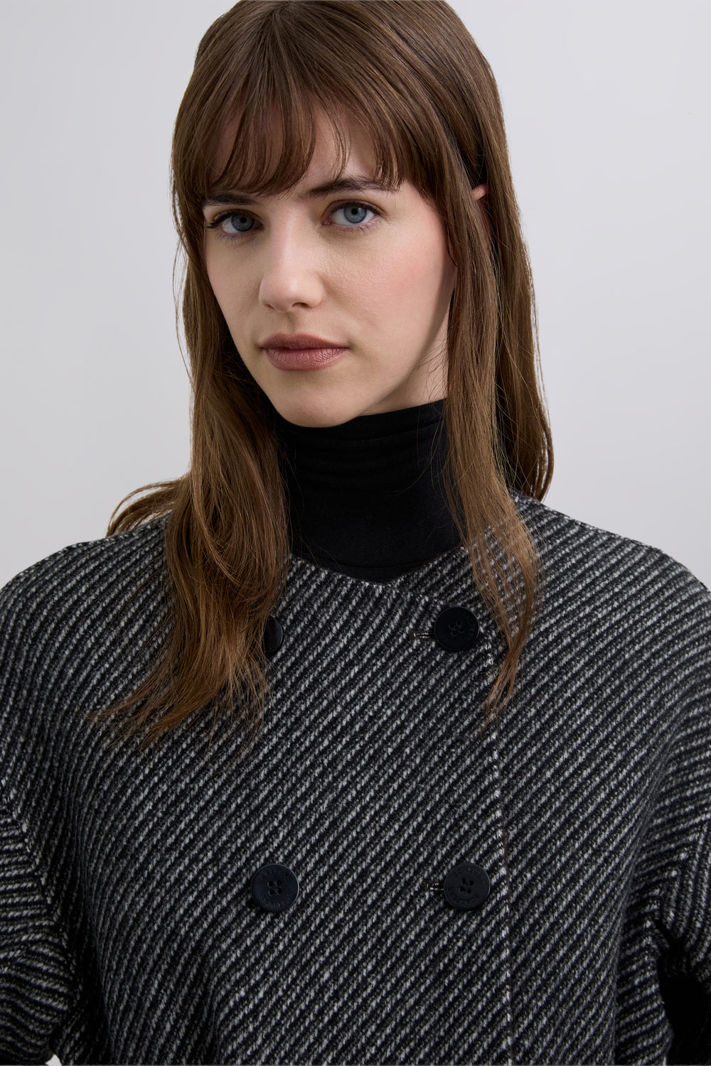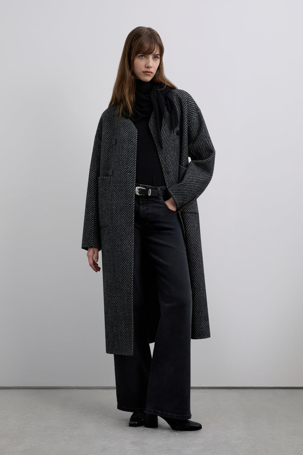Abrigo largo confeccionado en mezcla de lana reversible. Regular fit. Cuello redondo sin solapas. Opción estampado herringbone en gris y liso en marrón. Bolsillos de parche en opción herringbone y bolisllos inclinado en opción reversible liso.