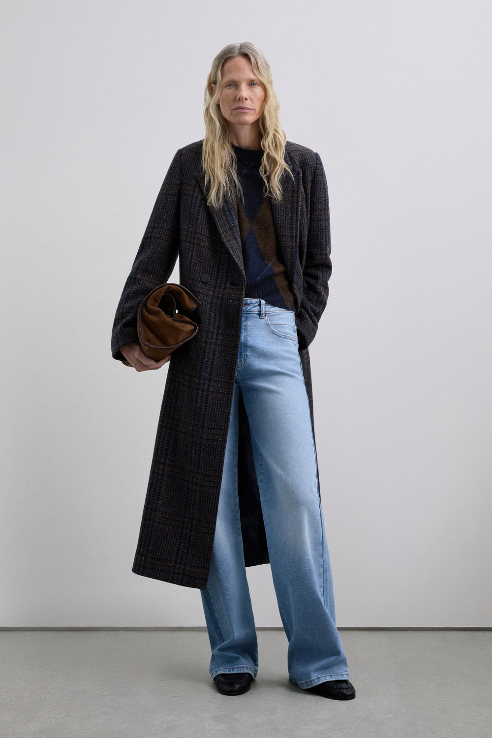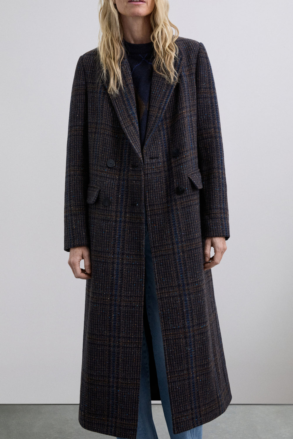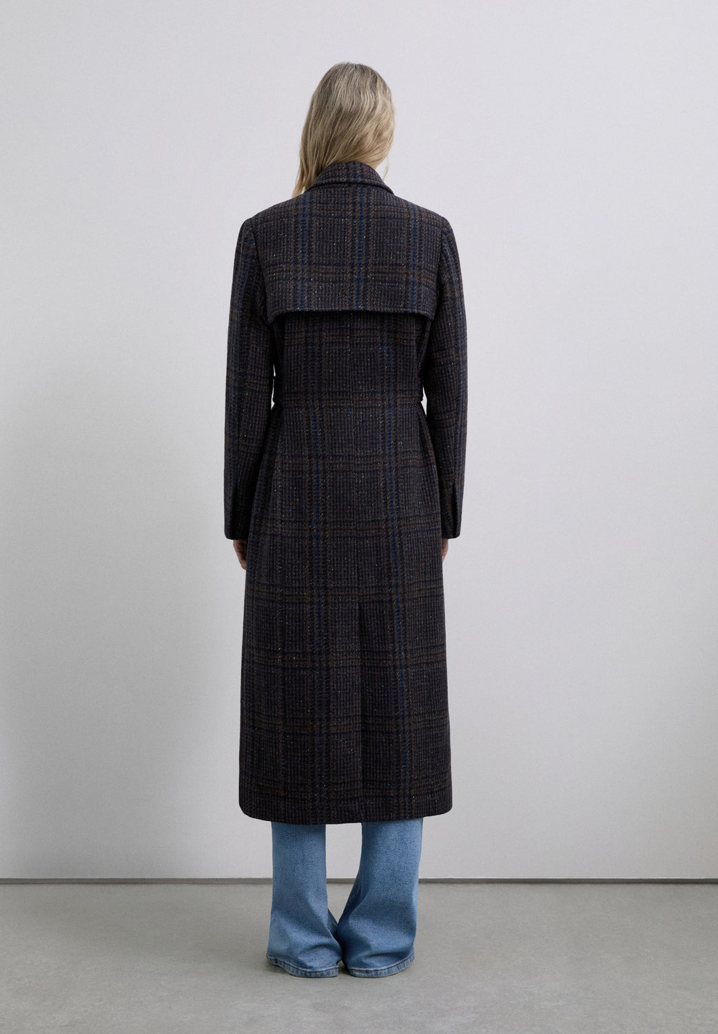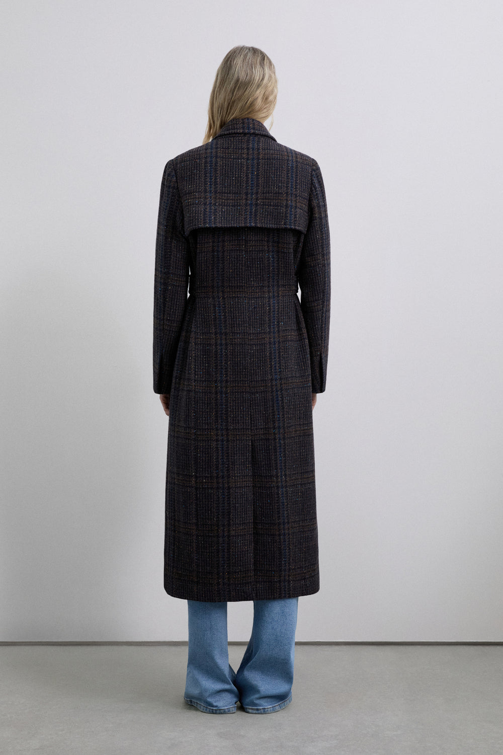 Abrigo largo de lana con estampado de cuadros. Con hombreras, corte recto y solapas clásicas. Cierre frontal mediante botones y cinturón a tono para ajustar la cintura. Bolsillos laterales.