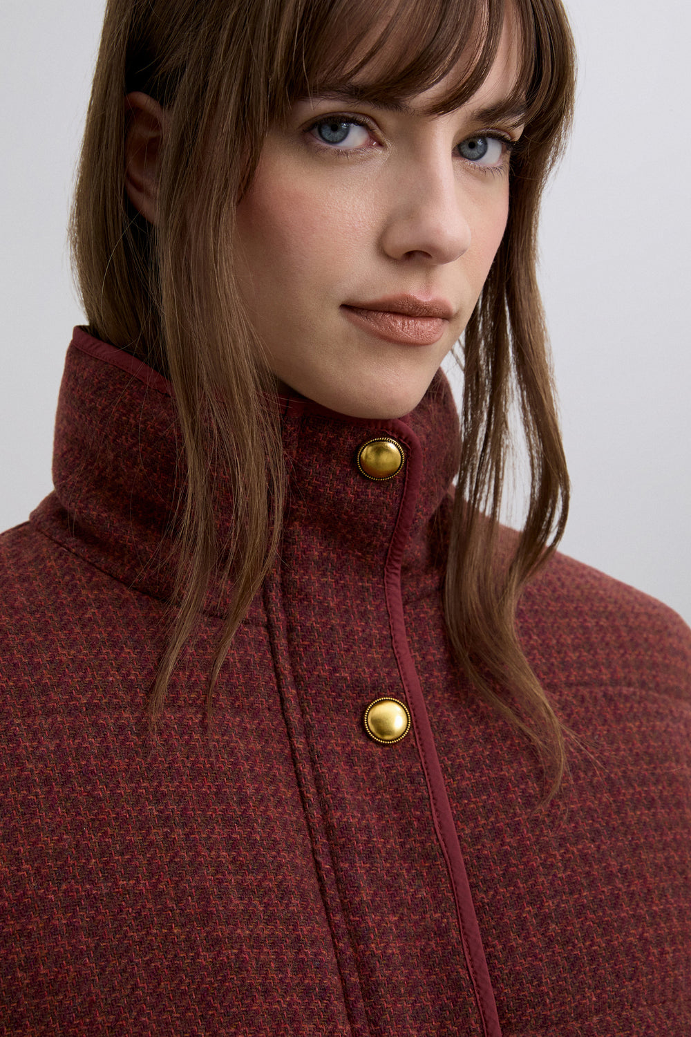 Abrigo acolchado confeccionado en mezcla de lana con estampado de cuadros. Corte regular fit. Ligeramente cropped. Cuello subido. Manga larga. Vivos a contraste. Cierre con cremallera central y tapeta con botones metálicos a presión. Tiradores ajustables en el bajo.
