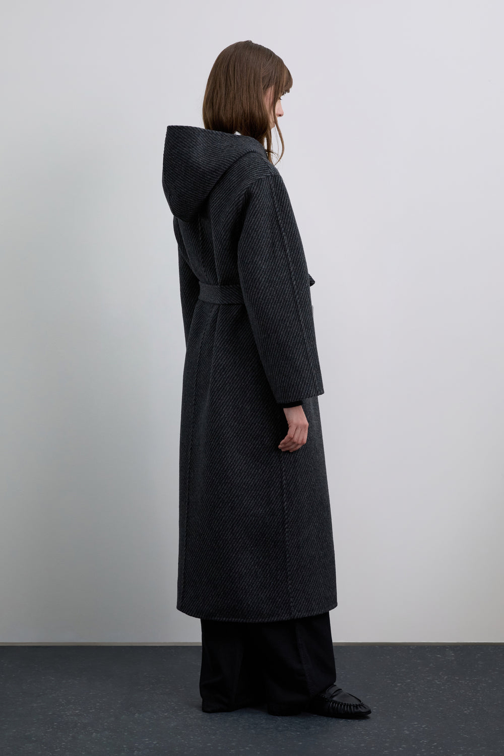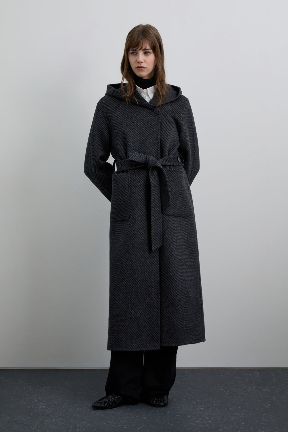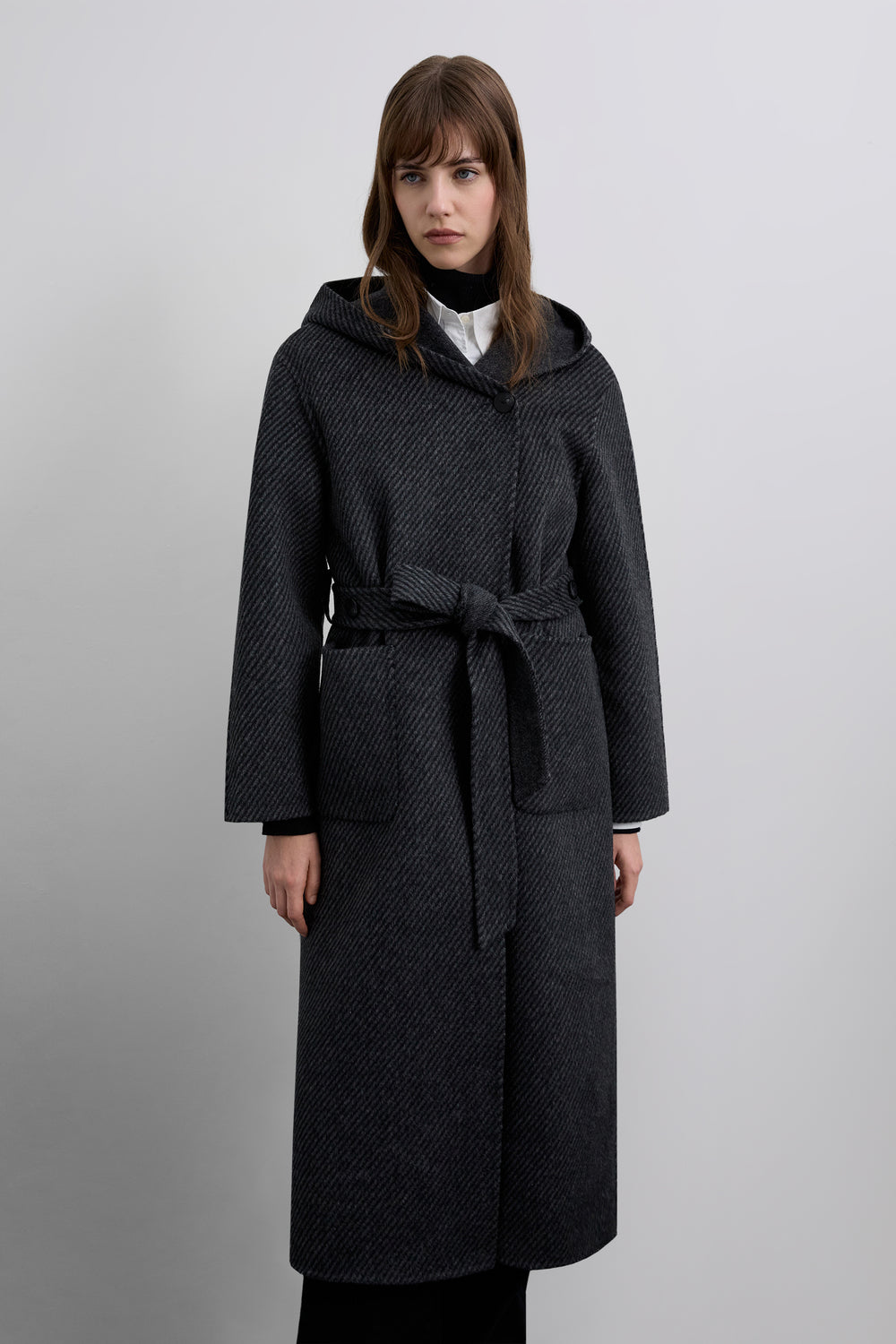 Abrigo largo con capucha confeccionado en mezcla de lana. Exterior con raya en diagonal. Dos bolsillos en frontal. Cierre mediante cinturón.