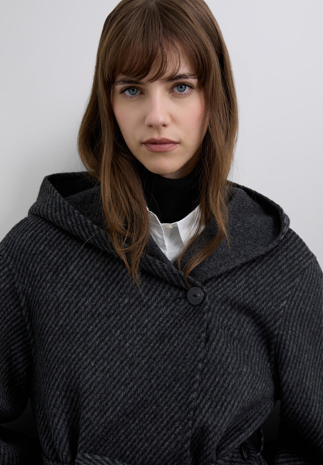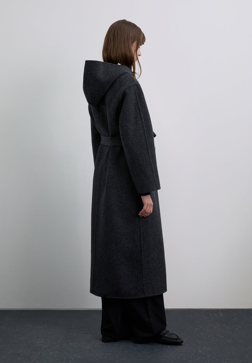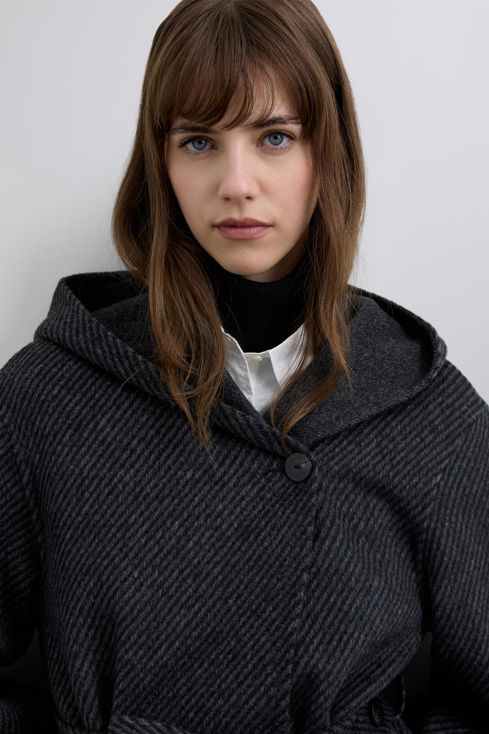 Abrigo largo con capucha confeccionado en mezcla de lana. Exterior con raya en diagonal. Dos bolsillos en frontal. Cierre mediante cinturón.