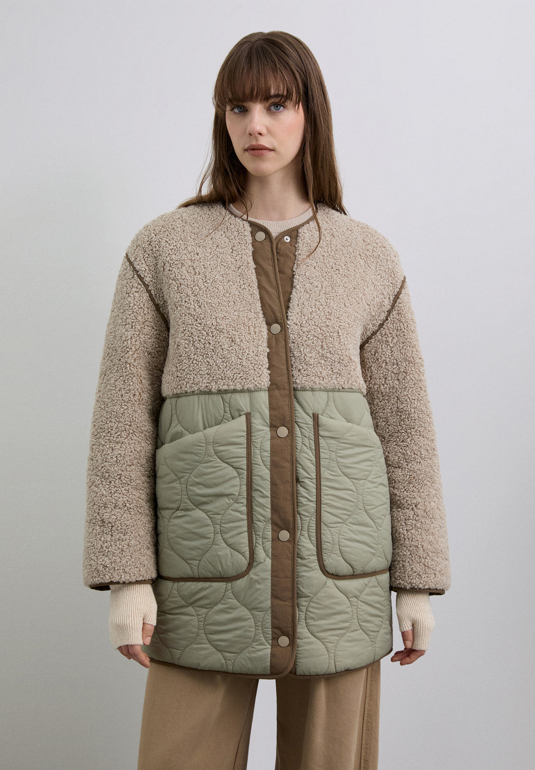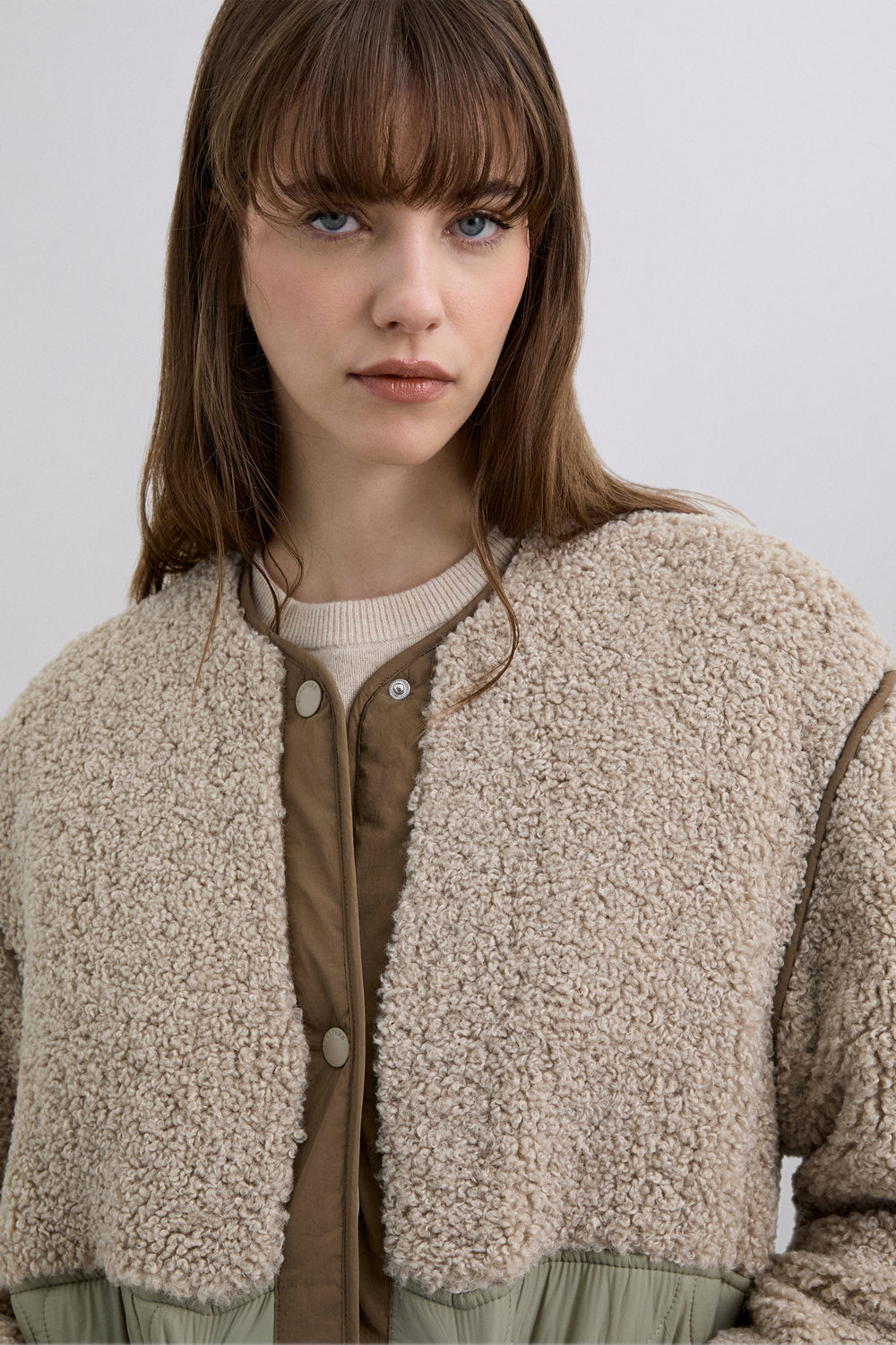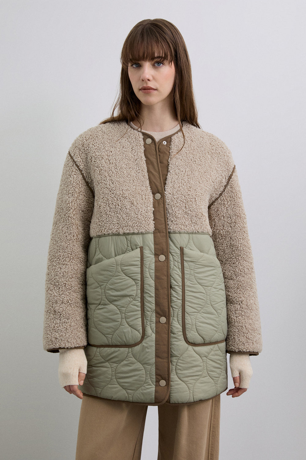 Abrigo confeccionado en parte superior en piel sintética con efecto borrego y parte inferior de nylon acolchado con dos grandes bolsillos. Cierre frontal mediante botones. Detalle de parche engomado con logo en espalda.
