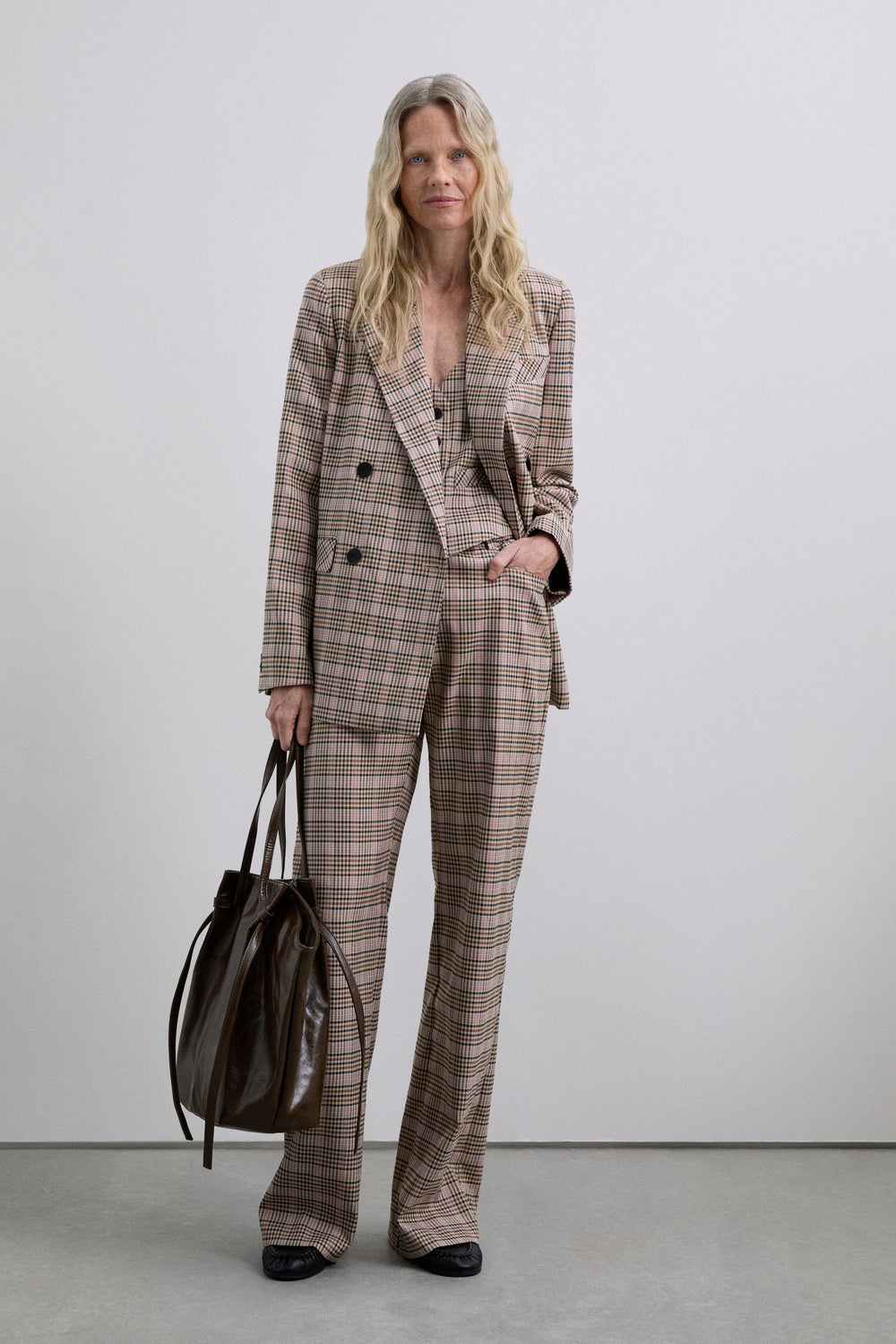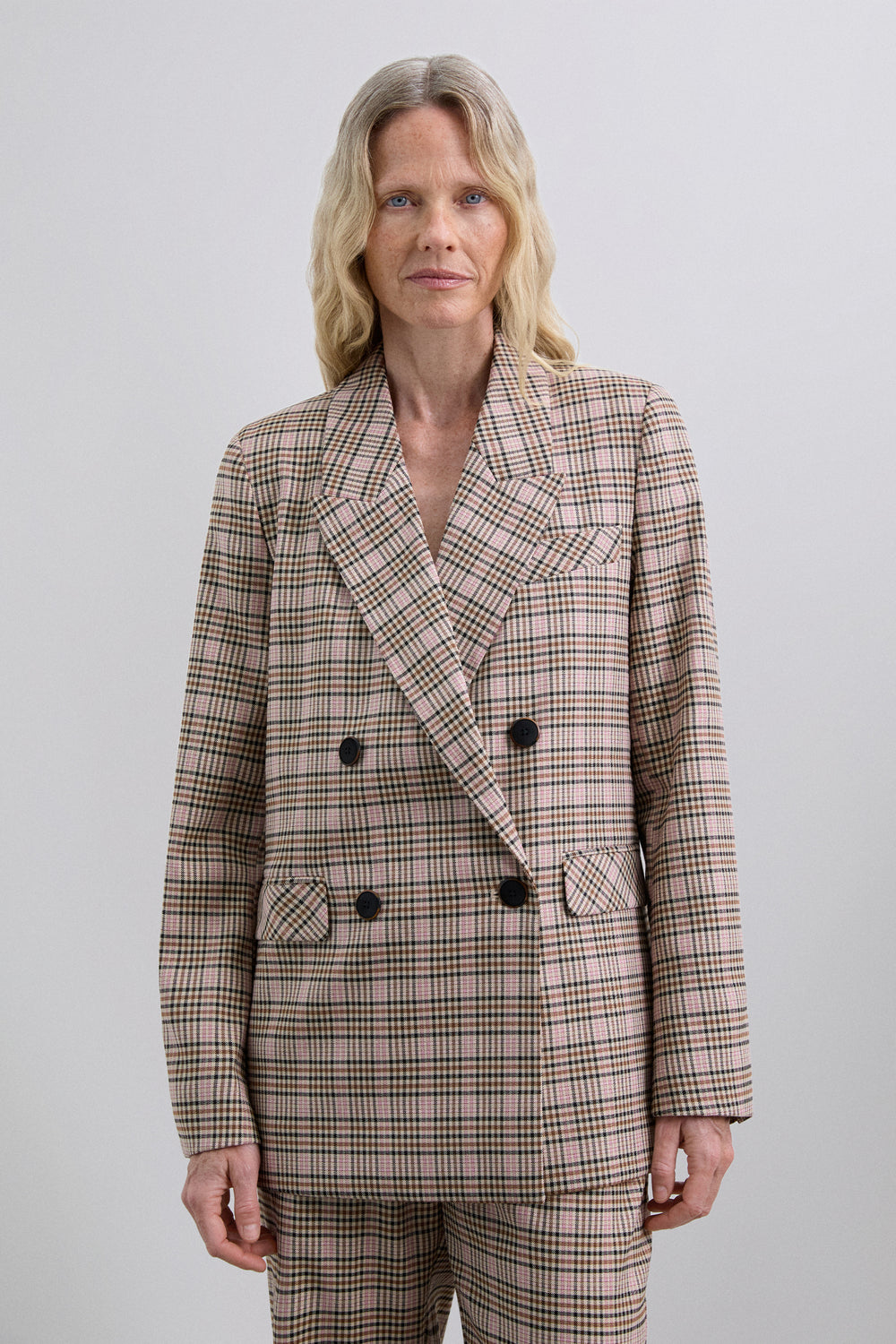 Blazer cruzada con estampado de cuadros. Cuello con solapa. Cierre con botones. Manga larga con terminación de cierre de botones. Bolsillos frontales con tapeta.