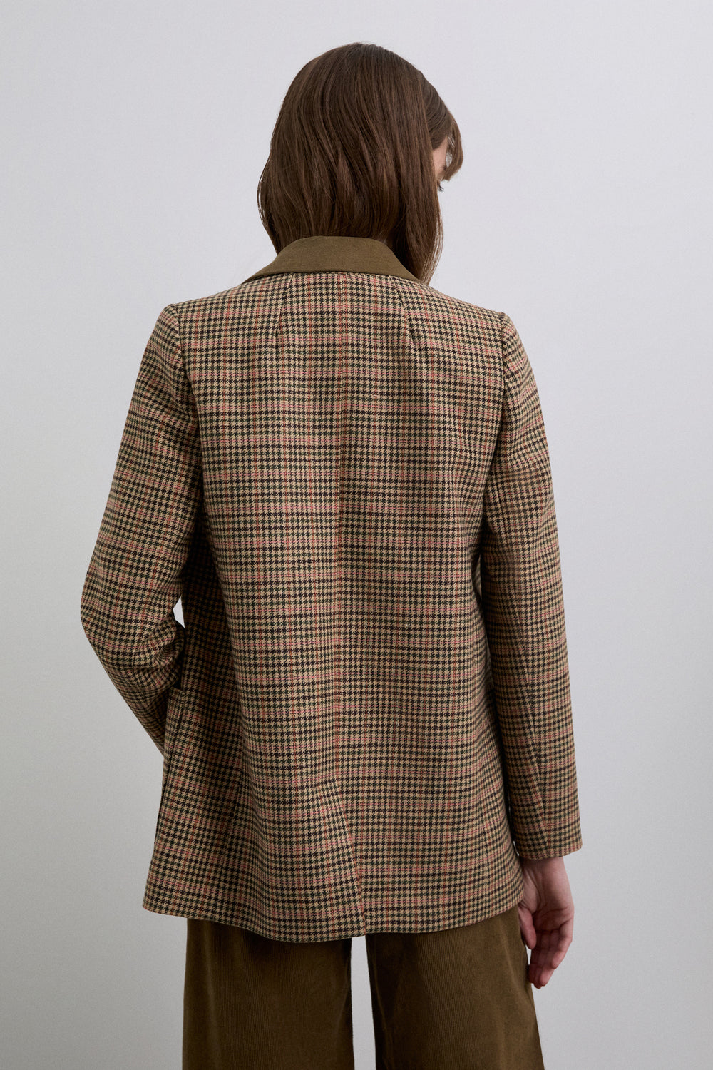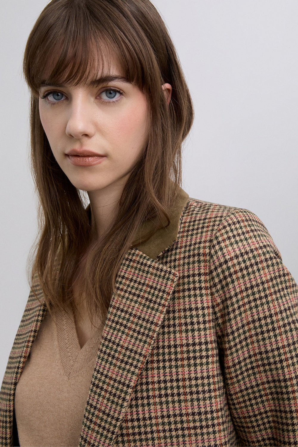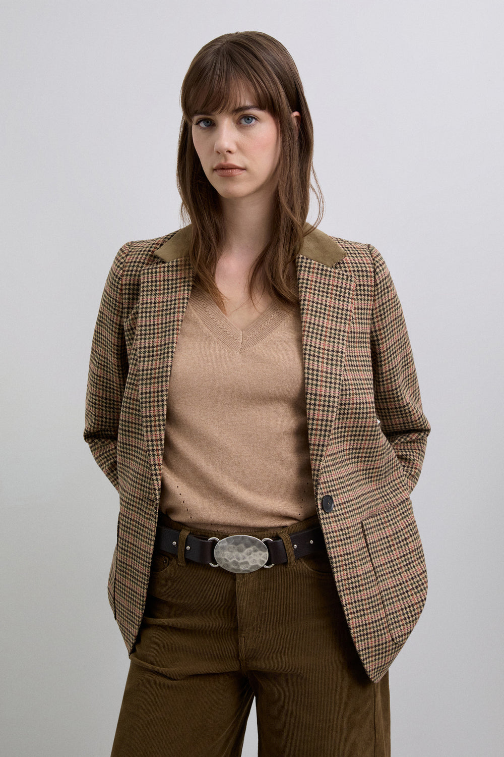 Blazer con detalles a contraste en solapa. Estampado príncipe de Gales. Confeccionado en mezcla de lana. Corte Regular Fit. Cuello con solapas. Cierre con botón. Manga larga. Bolsillos de parche.