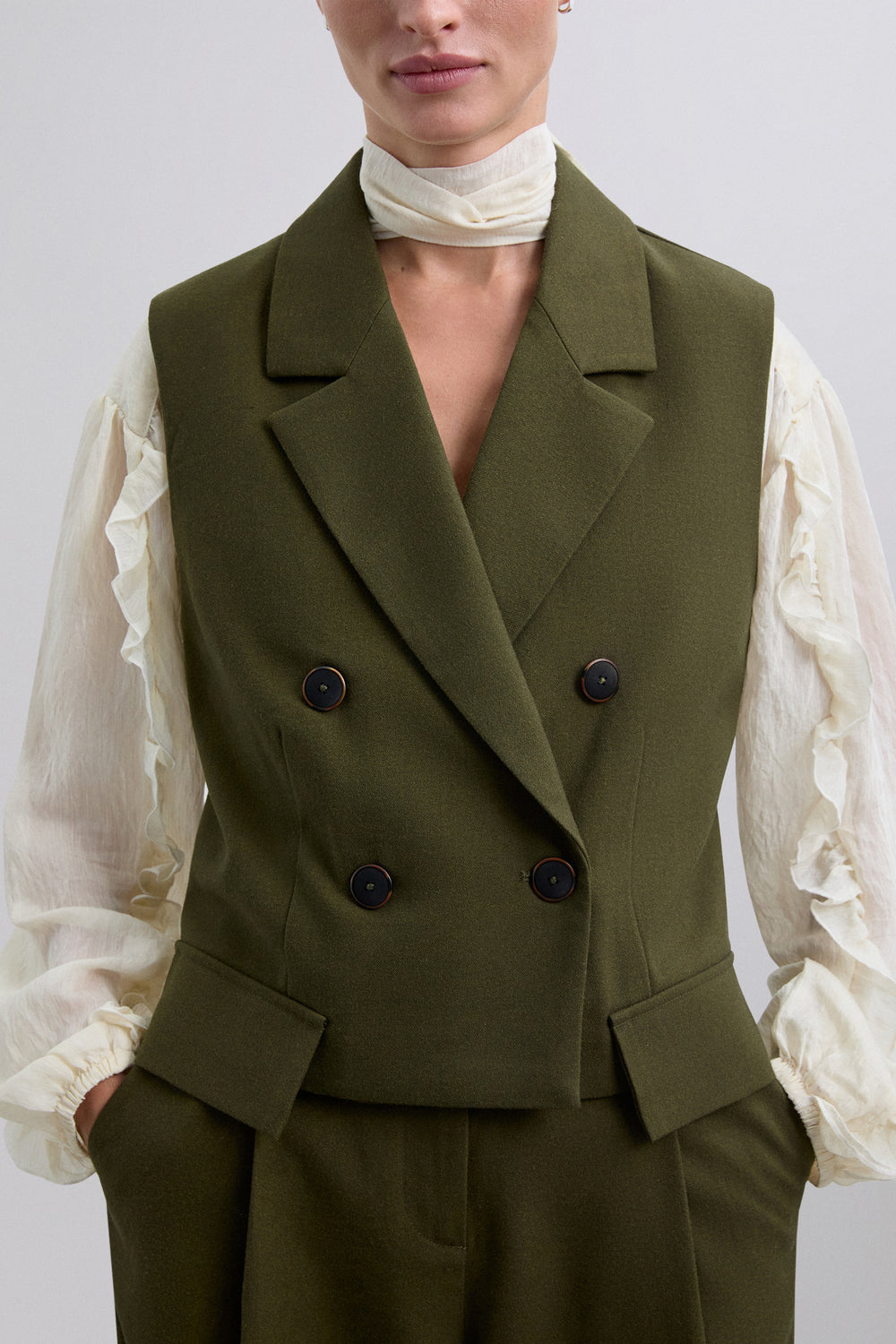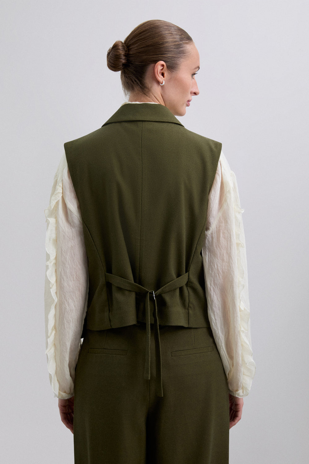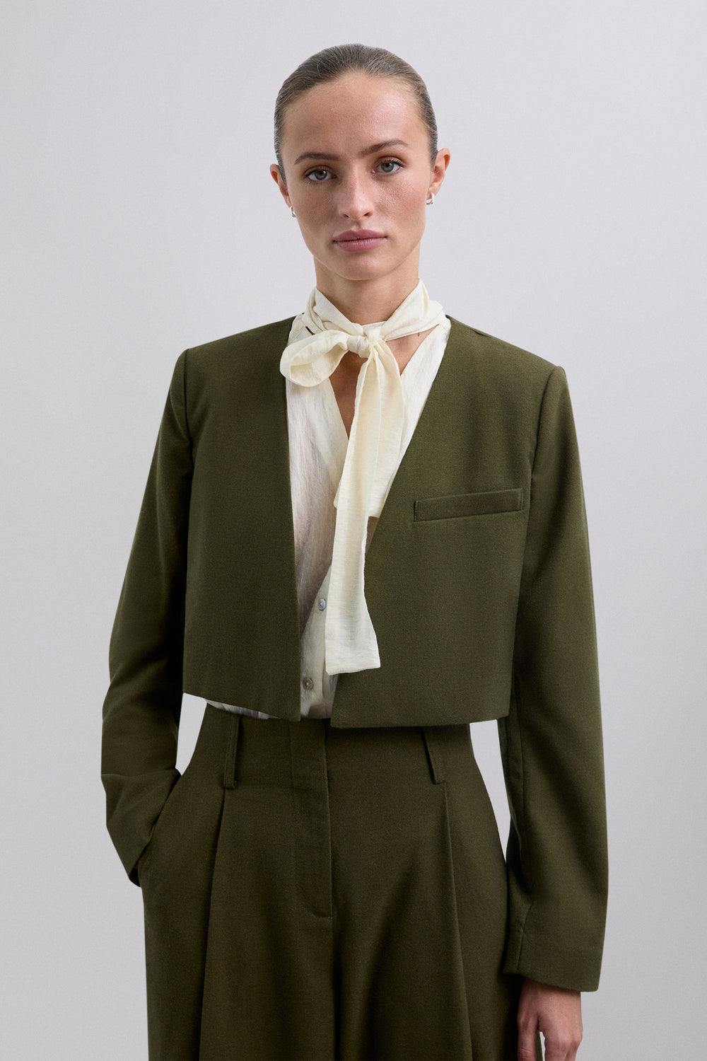 Blazer confeccionada en mezcla de viscosa. Desmontable en chaleco y torera. Chaleco con cuello de solapa, manga en sisa, cierre de botones y ajustable en parte trasera. Torera cropped, cuello sin solapa, manga larga y bolsillo en pecho de vivo.