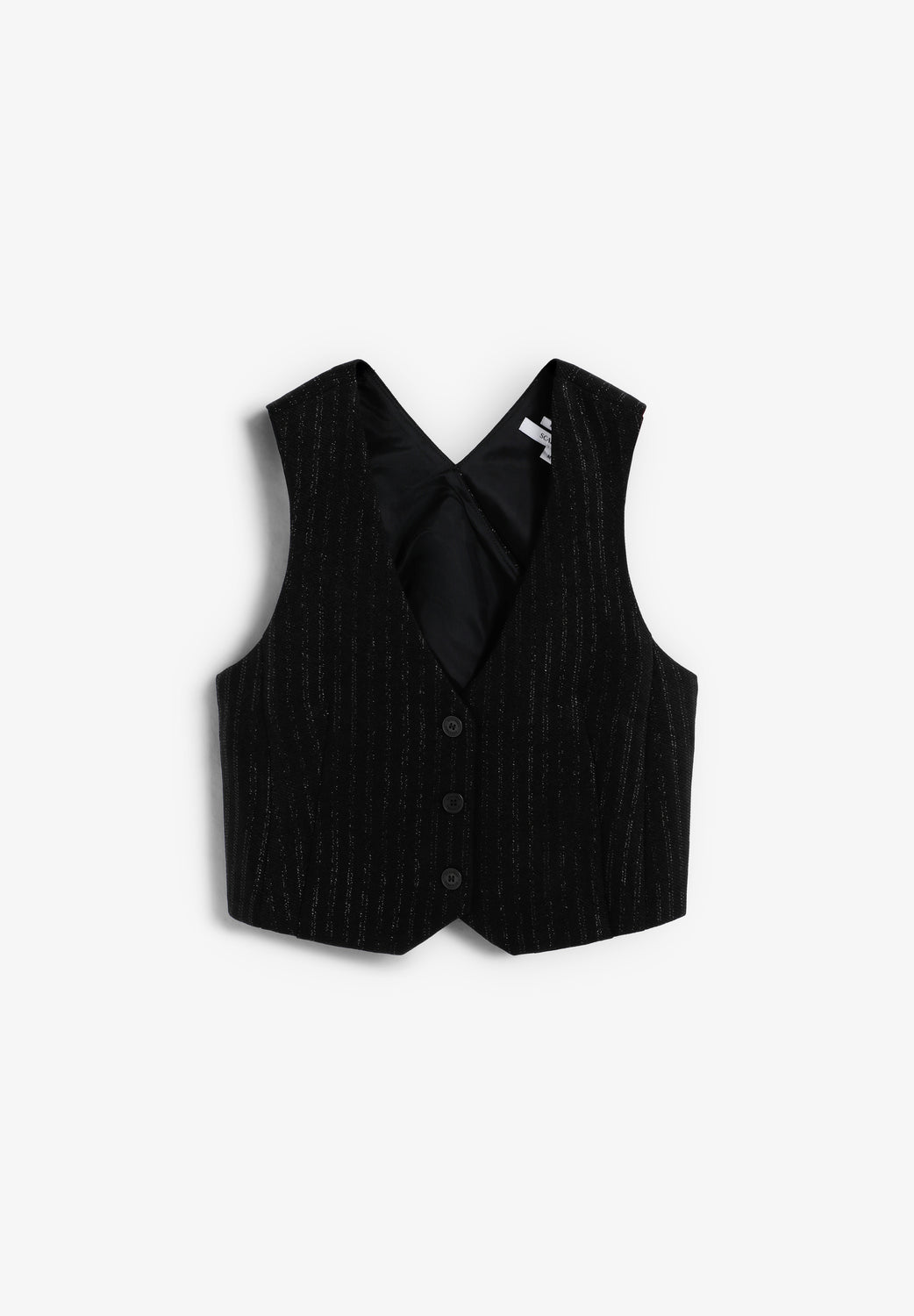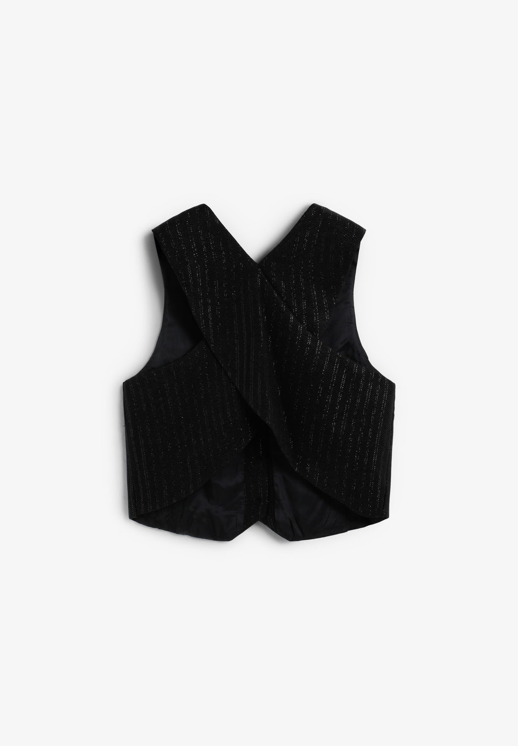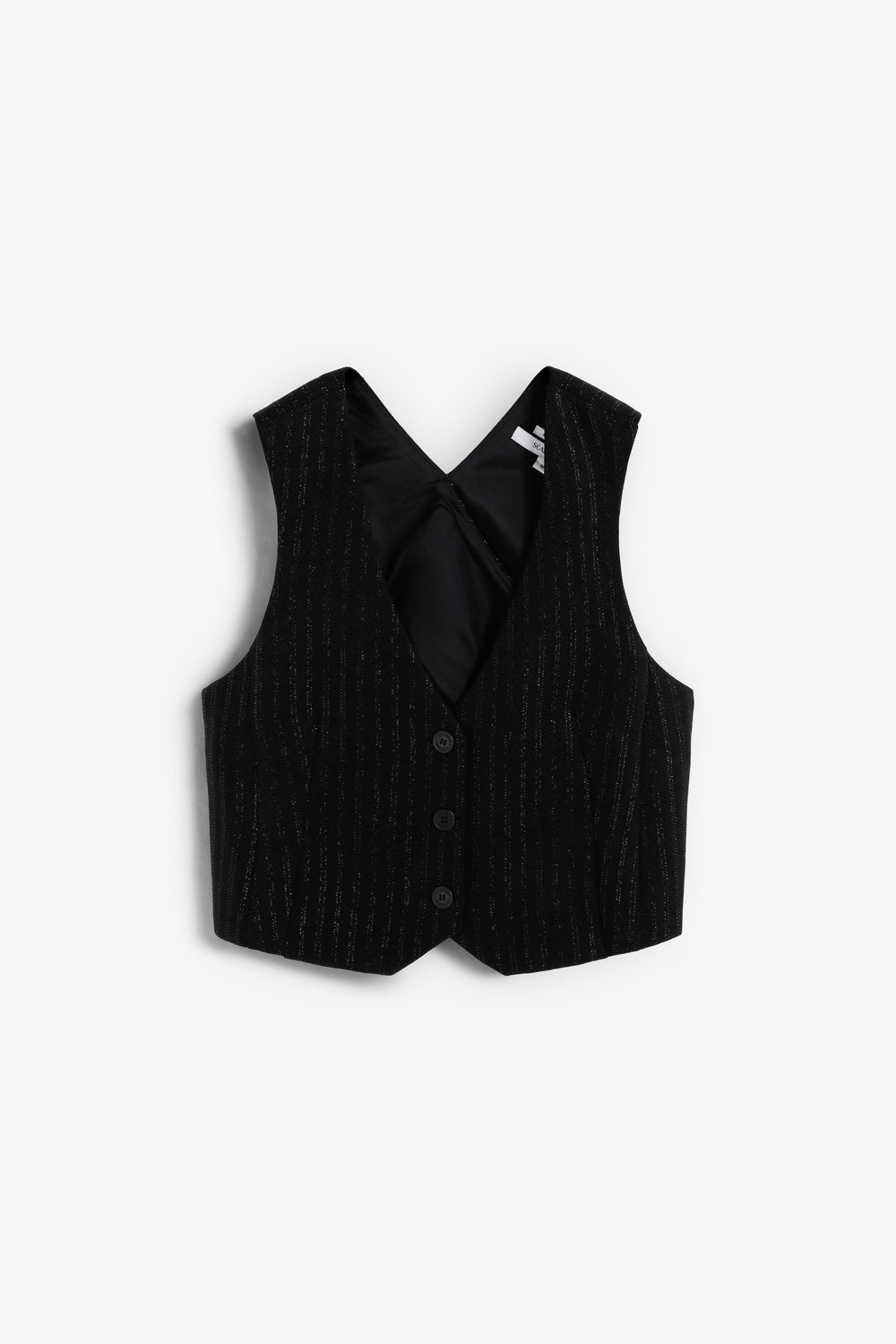 Chaleco confeccionado en material fluido con estampado de rayas de lúrex. Corte slim fit. Escote en V. Manga en sisa. Espalda cruzada. Cierre con botones.