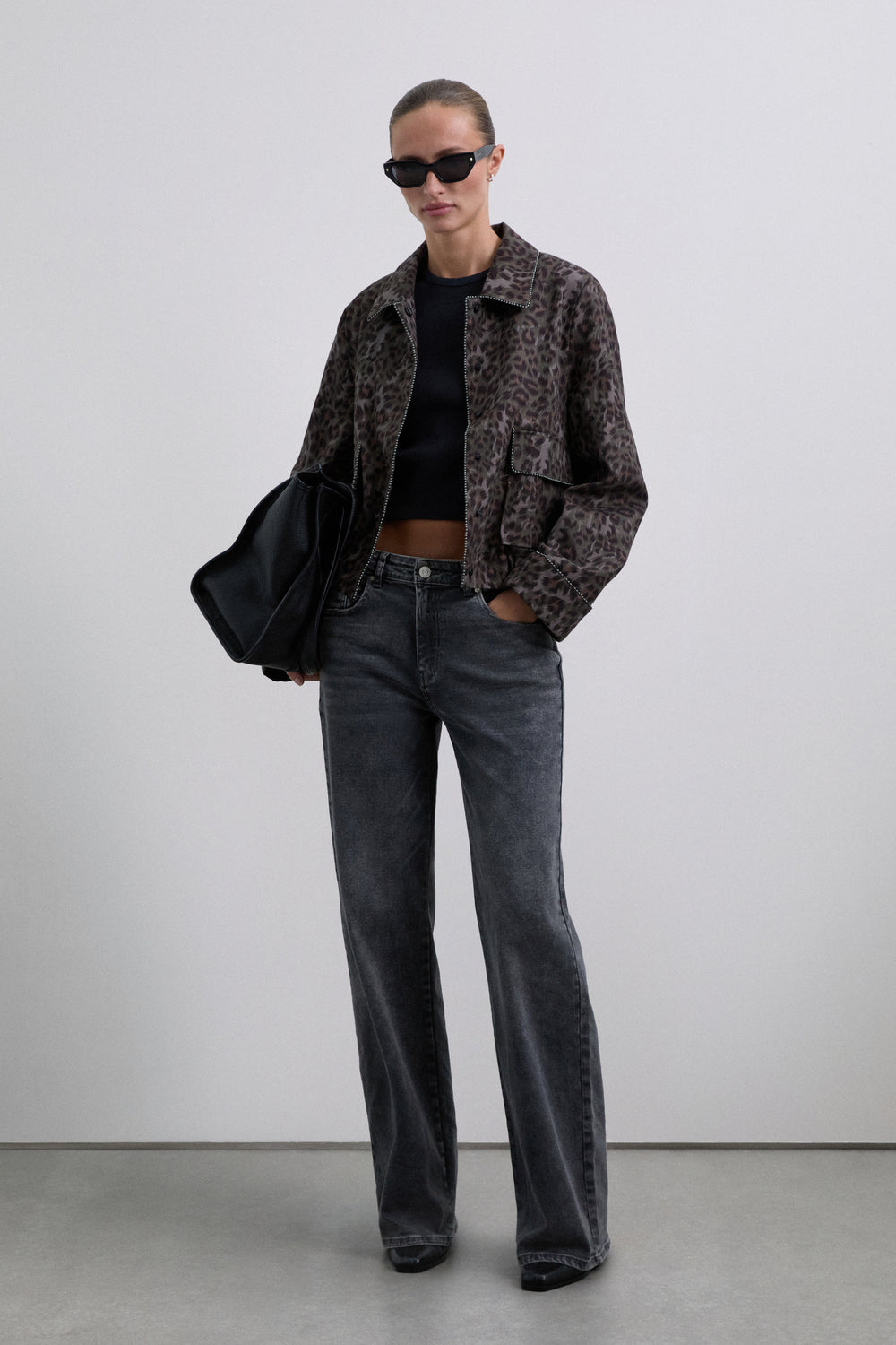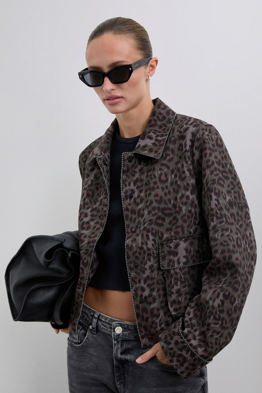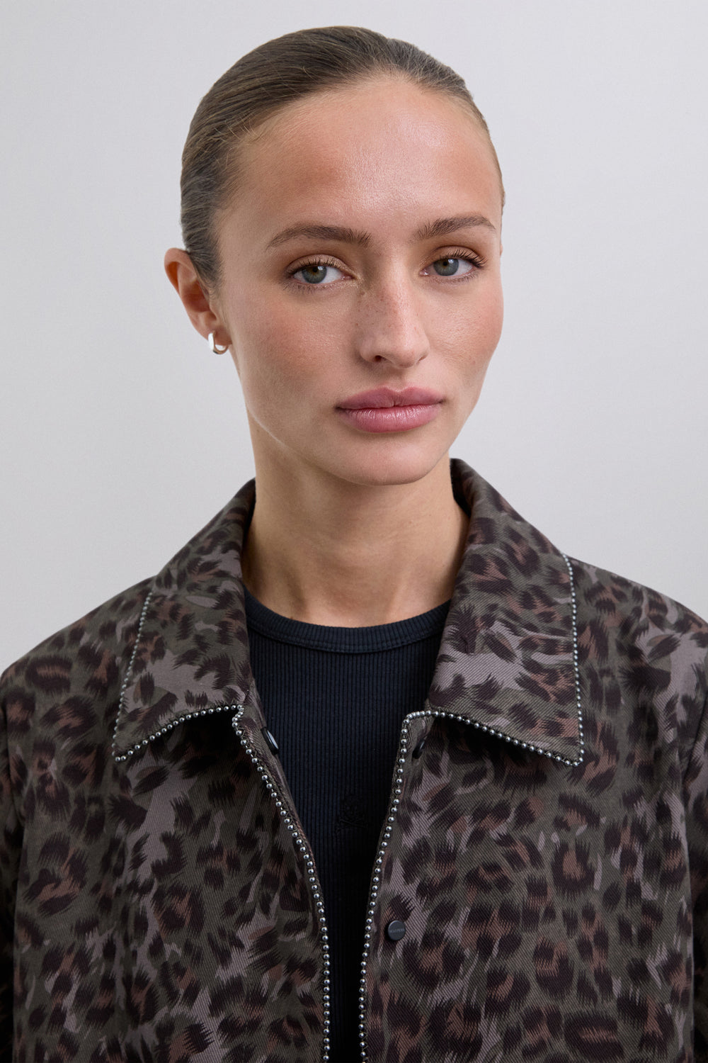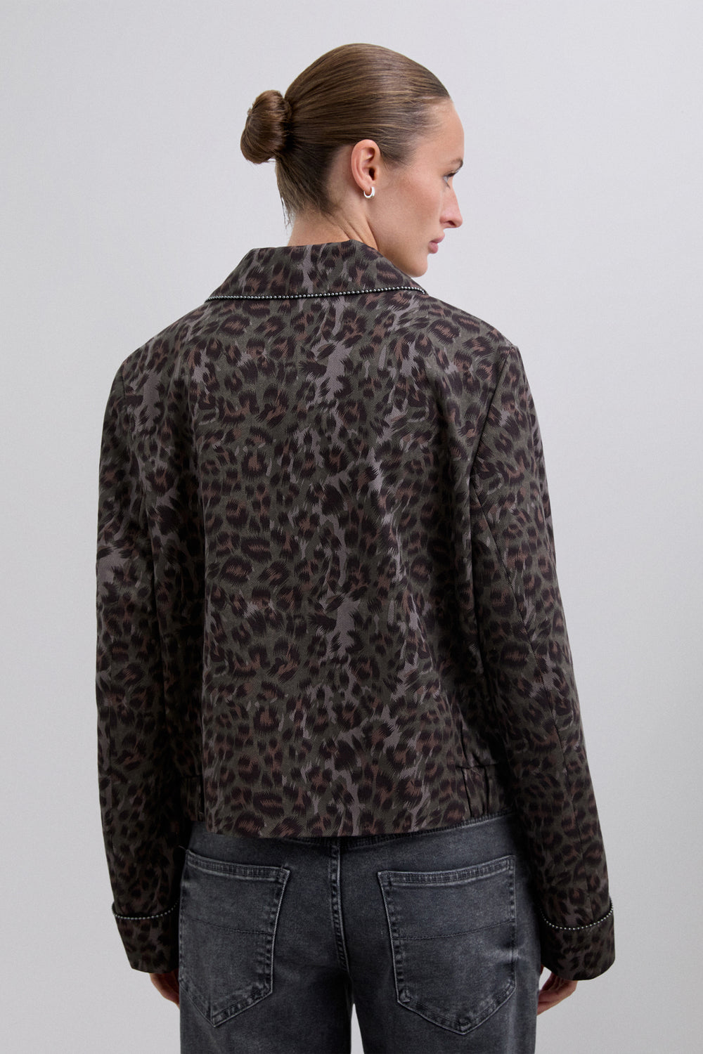 Chaqueta confeccionada en 100% algodón con estampado animal print. Detalle de lining con studs metalizadas. Mangas largas con puños vueltos. Cuello de camisa. Cierre con botones oculto por una tapeta y un botón visible. dos bolsillos con solapa. Banda elástica en los laterales del bajo.