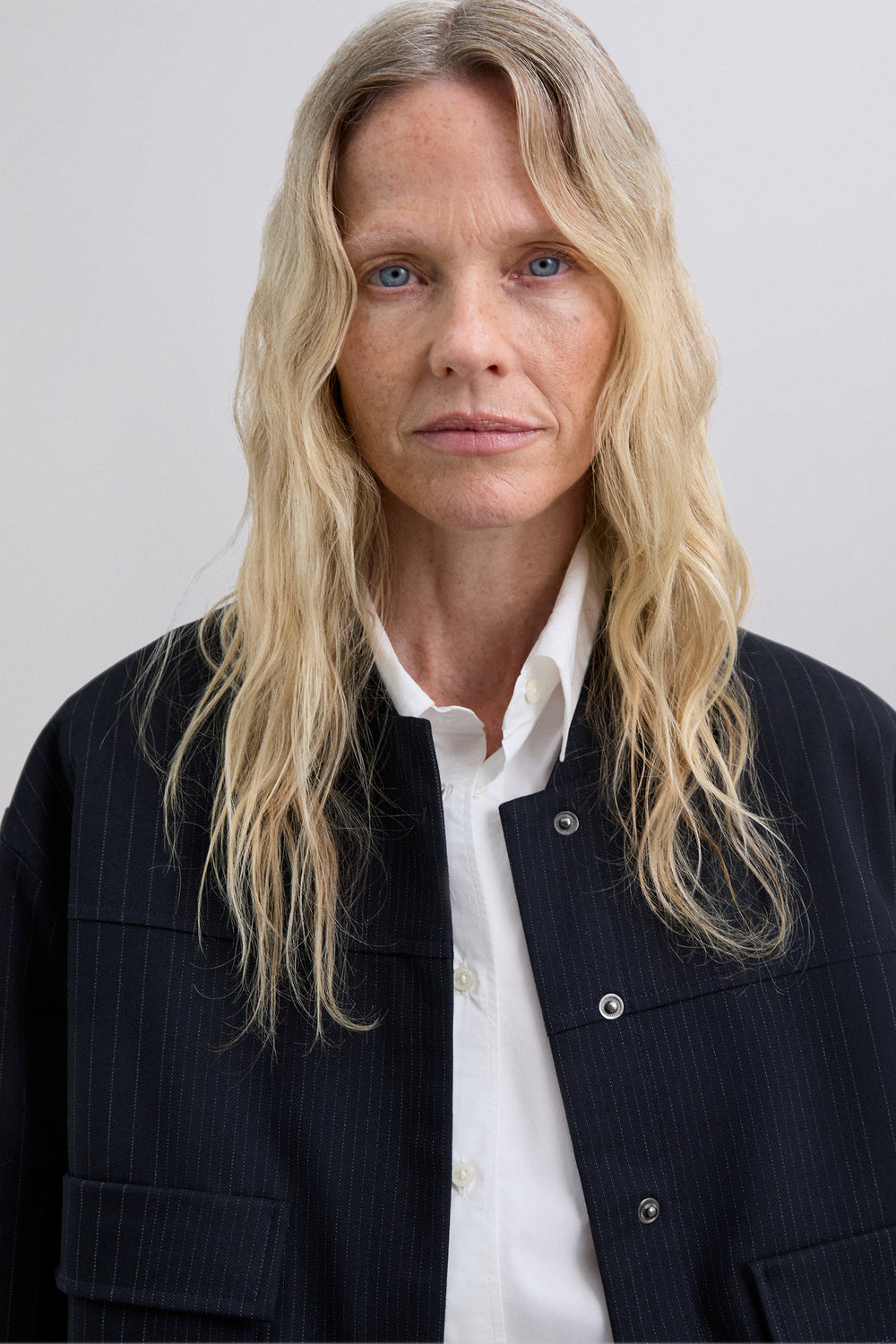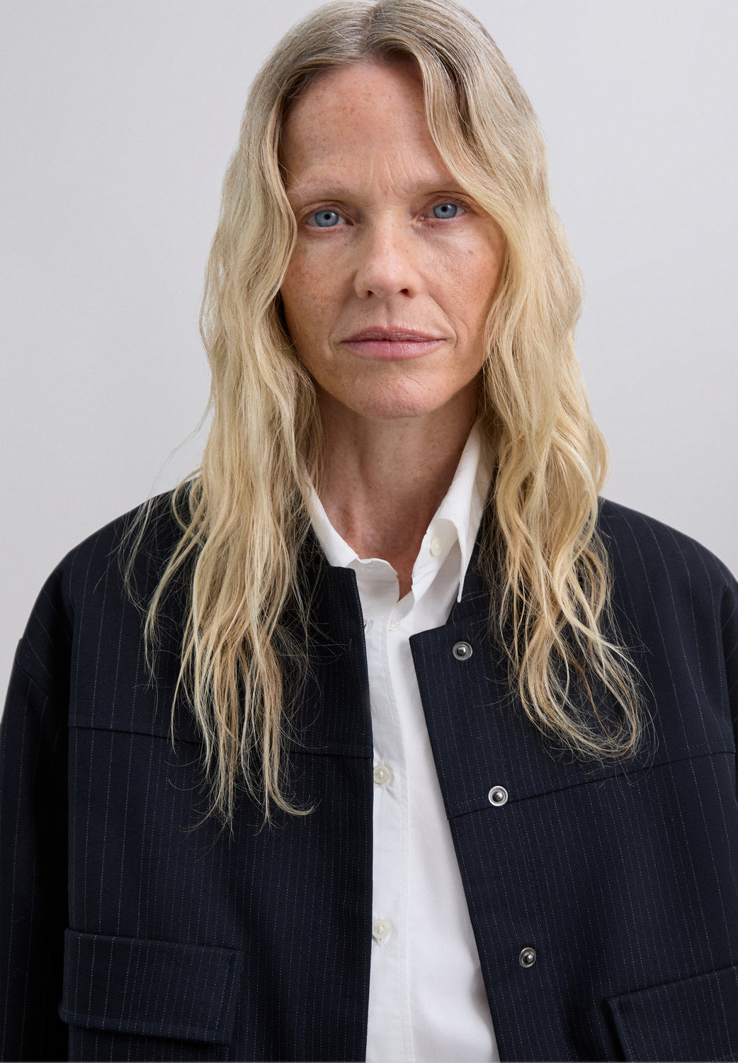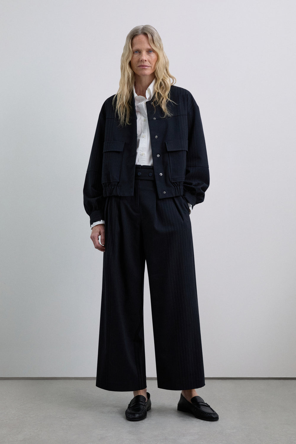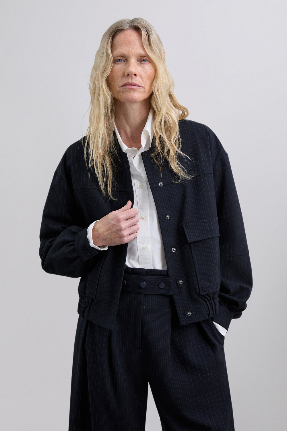 Chaqueta bomber de raya diplomática. Cuello alzado cortado al bies. Manga larga. Cintura ligeramente elástica. Cierre frontal con cremallera y botones. Dos bolsillos frontales con solapa.