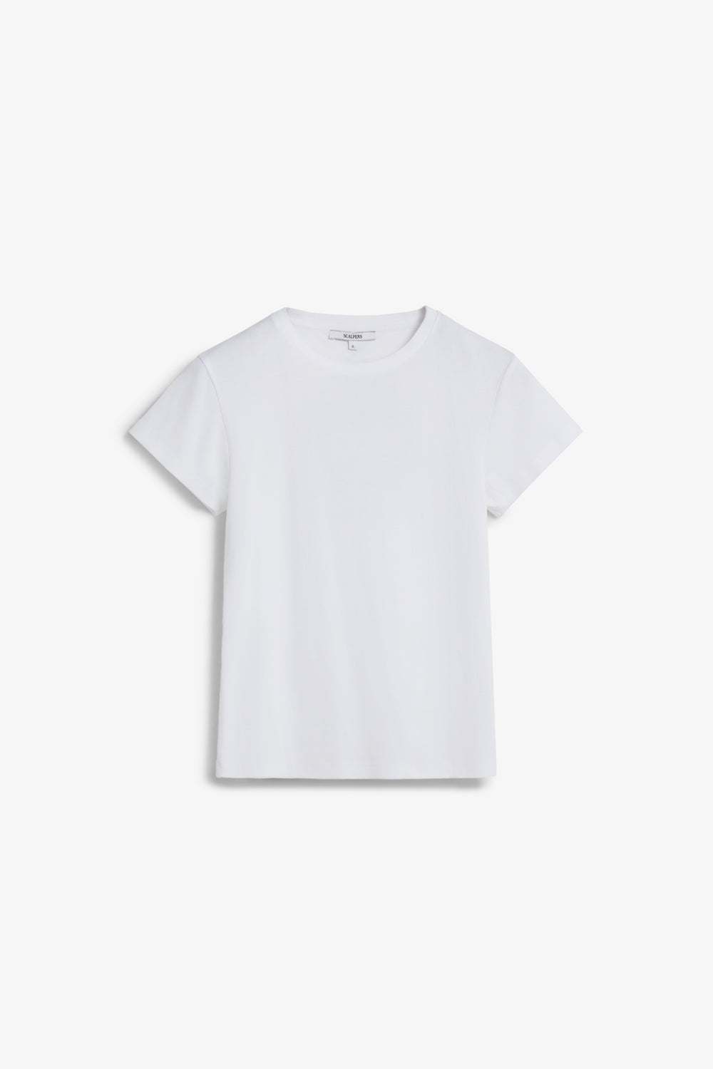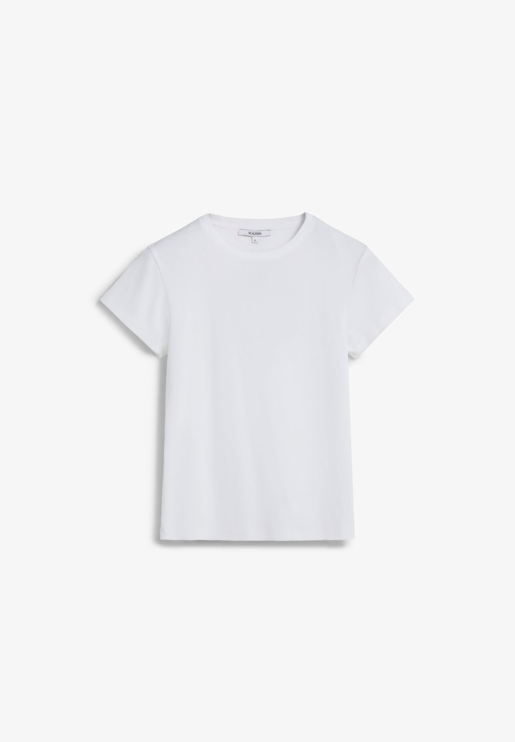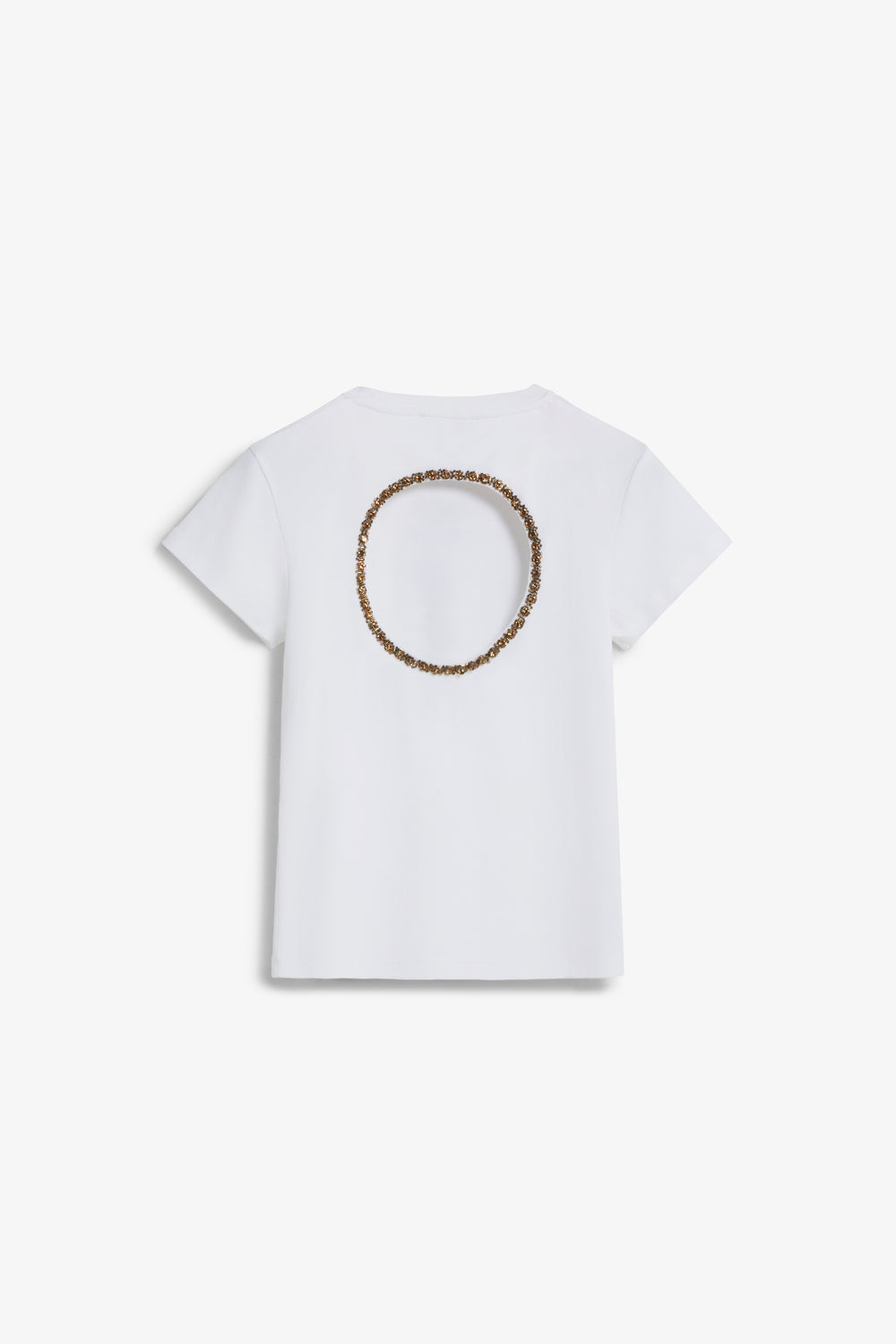 Camiseta confeccionada en mezcla de algodón ligeramente elástico. Corte regular fit. Cuello redondo, manga corta. Abertura trasera con detalle de pedrería.