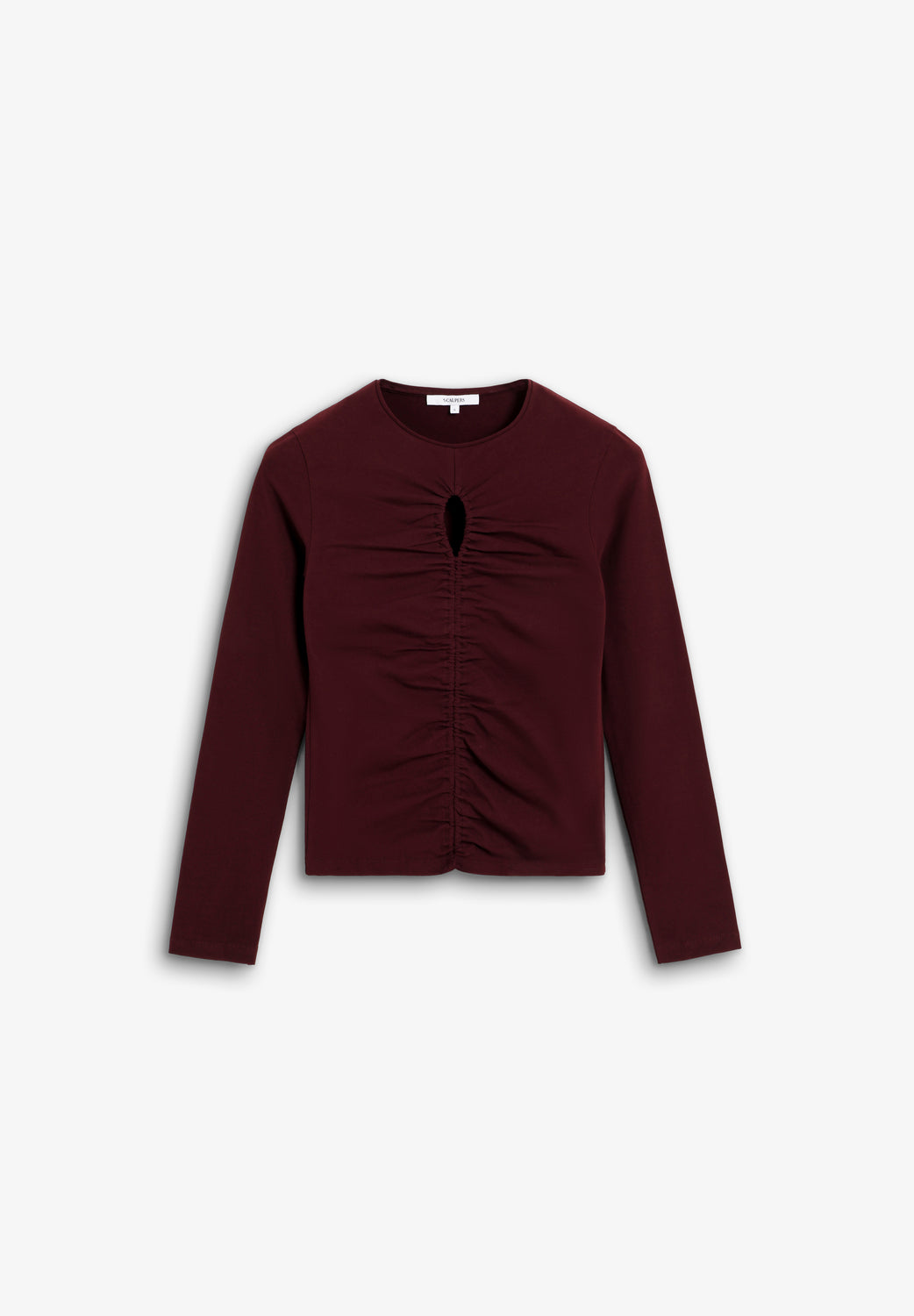 Camiseta confeccionada en algodón ligeramente elástico. Corte slim ft, cuello redondo y manga larga. Detalle de abertura en escote y frunces frontales.